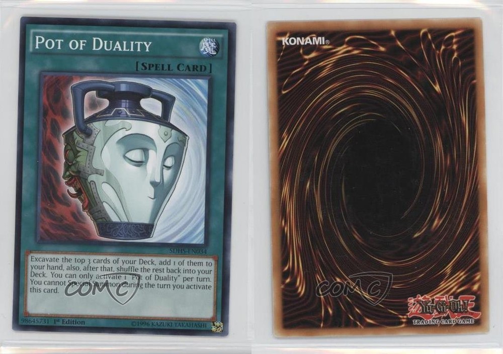 2015 Yu-Gi-Oh! HERO Strike - Structure Deck [Base] - 1st Edition #SDHS-EN034 Pot of Duality COMC Item: 30510079 - YuGiOh Card - Featuring Pot of Duality Search for more: 2015 Yu-Gi-Oh! HERO Strike Search for more: 2015 Yu-Gi-Oh! HERO Strike - Structure Deck [Base] - 1st Edition View all of our Listings Auctions Buy It Now About Us Located in the beautiful Pacific Northwest, COMC (Check Out My Cards) is the world's largest consignment service for trading card singles. More than 10,000 people have used our consignment service to list over 50 million trading cards. Find out how we can help you consign your items on eBay by contacting us through eBay messaging. COMC -- "The Safe & Easy Way to Buy & Sell" Raw Condition for Modern Cards Unless otherwise noted, raw modern cards are listed in Near Mint-Mint condition or better. A NM-MT card appears to be Mint at first glance, but upon closer inspection, may exhibit some of the following: minor print defects (e.g. roller marks, print line, dimple), minor scratches, slight edge wear, and slight corner wear. Centering is clearly visible in the images provided and does not factor into our condition assessment. Raw Condition for Vintage Cards Unless otherwise noted, raw vintage cards are listed in Excellent condition or better. An EX card may exhibit some of the following: minor rounding of corners, surface wear, print defects, light scratches, and slight edge wear/chipping. Centering is clearly visible in the images provided and does not factor into our condition assessment. Domestic Shipping Combined shipping for multiple items is available. To receive combined shipping, please ensure all desired items are in your eBay shopping cart before proceeding to checkout. eBay limits orders to 40 items per order. We automatically combine multiple orders placed on the same day. If you place multiple orders on the same day, please contact us to request a refund of applicable shipping costs. Signature confirmation may be required on invoices over $400. All cards are protected and shipped securely. International Shipping COMC offers eBay's International Shipping (EIS) for international orders under $2,500* (see country exceptions below). All duties and import fees are paid at checkout; in the rare event that there are additional import fees upon delivery, these are borne by the buyer. EIS packages route through a shipping hub in Erlanger, KY before shipping to their final destination. Please note that EIS does not allow for combined shipments. The shipping rates are determined by eBay and cannot be adjusted. *Maximum sale price exceptions: Colombia, Kuwait ($2,000); Taiwan ($1,539); Chile, Costa Rica, Guatemala, Honduras, Trinidad and Tobago ($1,000); Antigua and Barbuda, Aruba, Belize, Dominica, Grenada, Philippines, Saint Kitts and Nevis, Saint Lucia, Montserrat, Turks and Caicos Islands ($500); Dominican Republic, El Salvador ($200). Please request a shipping quote through eBay messaging for orders that exceed the maximum sale price supported by eBay's International Shipping. You will be responsible for all duties and import fees for international orders shipped outside the EIS. All cards are protected and shipped securely. Payment COMC does not accept offers on our cards through our eBay storefront. COMC utilizes eBay’s managed payments system. If you are experiencing difficulties making a payment, please contact eBay for assistance. Return Policy Returns are only accepted on the rare occasion the item is not as described. If you are making a return, please initiate the return process through eBay so a mailing label can be provided for you. Prior to listing, our expert team carefully assessed this item to represent it accurately. Please review the description and high-definition images prior to purchasing to ensure this item meets your satisfaction. We welcome you to contact us if you have further questions about this item. Trust and Integrity COMC carefully assesses each item consigned to us to prevent fraudulent items from entering the marketplace. If you believe an item offered on COMC may be fraudulent, please contact us with details so we can investigate the issue. Items we determine are outside our supported items policy may be removed. Last Modified: 6/14/2025 6:54:17 AM PDT