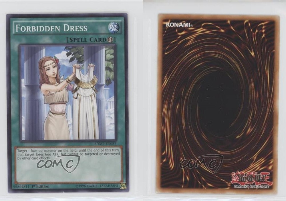 2015 Yu-Gi-Oh! Master of Pendulum - Structure Deck [Base] - 1st Edition #SDMP-EN033 Forbidden Dress COMC Item: 110661310 - YuGiOh Card Search for more: 2015 Yu-Gi-Oh! Master of Pendulum Search for more: 2015 Yu-Gi-Oh! Master of Pendulum - Structure Deck [Base] - 1st Edition View all of our Listings Auctions Buy It Now About Us Located in the beautiful Pacific Northwest, COMC (Check Out My Cards) is the world's largest consignment service for trading card singles. More than 10,000 people have used our consignment service to list over 50 million trading cards. Find out how we can help you consign your items on eBay by contacting us through eBay messaging. COMC -- "The Safe & Easy Way to Buy & Sell" Raw Condition for Modern Cards Unless otherwise noted, raw modern cards are listed in Near Mint-Mint condition or better. A NM-MT card appears to be Mint at first glance, but upon closer inspection, may exhibit some of the following: minor print defects (e.g. roller marks, print line, dimple), minor scratches, slight edge wear, and slight corner wear. Centering is clearly visible in the images provided and does not factor into our condition assessment. Raw Condition for Vintage Cards Unless otherwise noted, raw vintage cards are listed in Excellent condition or better. An EX card may exhibit some of the following: minor rounding of corners, surface wear, print defects, light scratches, and slight edge wear/chipping. Centering is clearly visible in the images provided and does not factor into our condition assessment. Domestic Shipping Combined shipping for multiple items is available. To receive combined shipping, please ensure all desired items are in your eBay shopping cart before proceeding to checkout. eBay limits orders to 40 items per order. We automatically combine multiple orders placed on the same day. If you place multiple orders on the same day, please contact us to request a refund of applicable shipping costs. Signature confirmation may be required on invoices over $400. All cards are protected and shipped securely. International Shipping COMC offers eBay's International Shipping (EIS) for international orders under $2,500* (see country exceptions below). All duties and import fees are paid at checkout; in the rare event that there are additional import fees upon delivery, these are borne by the buyer. EIS packages route through a shipping hub in Erlanger, KY before shipping to their final destination. Please note that EIS does not allow for combined shipments. The shipping rates are determined by eBay and cannot be adjusted. *Maximum sale price exceptions: Colombia, Kuwait ($2,000); Taiwan ($1,539); Chile, Costa Rica, Guatemala, Honduras, Trinidad and Tobago ($1,000); Antigua and Barbuda, Aruba, Belize, Dominica, Grenada, Philippines, Saint Kitts and Nevis, Saint Lucia, Montserrat, Turks and Caicos Islands ($500); Dominican Republic, El Salvador ($200). Please request a shipping quote through eBay messaging for orders that exceed the maximum sale price supported by eBay's International Shipping. You will be responsible for all duties and import fees for international orders shipped outside the EIS. All cards are protected and shipped securely. Payment COMC does not accept offers on our cards through our eBay storefront. COMC utilizes eBay’s managed payments system. If you are experiencing difficulties making a payment, please contact eBay for assistance. Return Policy Returns are only accepted on the rare occasion the item is not as described. If you are making a return, please initiate the return process through eBay so a mailing label can be provided for you. Prior to listing, our expert team carefully assessed this item to represent it accurately. Please review the description and high-definition images prior to purchasing to ensure this item meets your satisfaction. We welcome you to contact us if you have further questions about this item. Trust and Integrity COMC carefully assesses each item consigned to us to prevent fraudulent items from entering the marketplace. If you believe an item offered on COMC may be fraudulent, please contact us with details so we can investigate the issue. Items we determine are outside our supported items policy may be removed. Last Modified: 6/19/2025 11:28:24 PM PDT