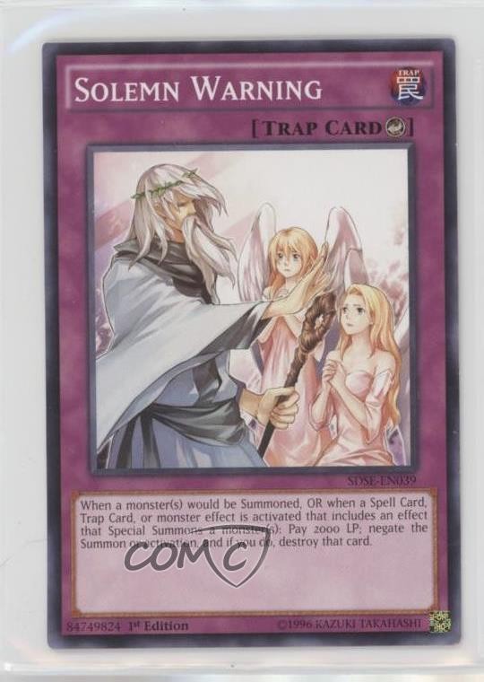 2015 Yu-Gi-Oh! Synchron Extreme - Structure Deck [Base] - 1st Edition #SDSE-EN039 Solemn Warning COMC Item: 108252338 - YuGiOh Card - Featuring Solemn Warning Search for more: 2015 Yu-Gi-Oh! Synchron Extreme Search for more: 2015 Yu-Gi-Oh! Synchron Extreme - Structure Deck [Base] - 1st Edition View all of our Listings Auctions Buy It Now About Us Located in the beautiful Pacific Northwest, COMC (Check Out My Cards) is the world's largest consignment service for trading card singles. More than 10,000 people have used our consignment service to list over 50 million trading cards. Find out how we can help you consign your items on eBay by contacting us through eBay messaging. COMC -- "The Safe & Easy Way to Buy & Sell" Raw Condition for Modern Cards Unless otherwise noted, raw modern cards are listed in Near Mint-Mint condition or better. A NM-MT card appears to be Mint at first glance, but upon closer inspection, may exhibit some of the following: minor print defects (e.g. roller marks, print line, dimple), minor scratches, slight edge wear, and slight corner wear. Centering is clearly visible in the images provided and does not factor into our condition assessment. Raw Condition for Vintage Cards Unless otherwise noted, raw vintage cards are listed in Excellent condition or better. An EX card may exhibit some of the following: minor rounding of corners, surface wear, print defects, light scratches, and slight edge wear/chipping. Centering is clearly visible in the images provided and does not factor into our condition assessment. Domestic Shipping Combined shipping for multiple items is available. To receive combined shipping, please ensure all desired items are in your eBay shopping cart before proceeding to checkout. eBay limits orders to 40 items per order. We automatically combine multiple orders placed on the same day. If you place multiple orders on the same day, please contact us to request a refund of applicable shipping costs. Signature confirmation may be required on invoices over $400. All cards are protected and shipped securely. International Shipping COMC offers eBay's International Shipping (EIS) for international orders under $2,500* (see country exceptions below). All duties and import fees are paid at checkout; in the rare event that there are additional import fees upon delivery, these are borne by the buyer. EIS packages route through a shipping hub in Erlanger, KY before shipping to their final destination. Please note that EIS does not allow for combined shipments. The shipping rates are determined by eBay and cannot be adjusted. *Maximum sale price exceptions: Colombia, Kuwait ($2,000); Taiwan ($1,539); Chile, Costa Rica, Guatemala, Honduras, Trinidad and Tobago ($1,000); Antigua and Barbuda, Aruba, Belize, Dominica, Grenada, Philippines, Saint Kitts and Nevis, Saint Lucia, Montserrat, Turks and Caicos Islands ($500); Dominican Republic, El Salvador ($200). Please request a shipping quote through eBay messaging for orders that exceed the maximum sale price supported by eBay's International Shipping. You will be responsible for all duties and import fees for international orders shipped outside the EIS. All cards are protected and shipped securely. Payment COMC does not accept offers on our cards through our eBay storefront. COMC utilizes eBay’s managed payments system. If you are experiencing difficulties making a payment, please contact eBay for assistance. Return Policy Returns are only accepted on the rare occasion the item is not as described. If you are making a return, please initiate the return process through eBay so a mailing label can be provided for you. Prior to listing, our expert team carefully assessed this item to represent it accurately. Please review the description and high-definition images prior to purchasing to ensure this item meets your satisfaction. We welcome you to contact us if you have further questions about this item. Trust and Integrity COMC carefully assesses each item consigned to us to prevent fraudulent items from entering the marketplace. If you believe an item offered on COMC may be fraudulent, please contact us with details so we can investigate the issue. Items we determine are outside our supported items policy may be removed. Last Modified: 6/19/2025 11:28:31 PM PDT