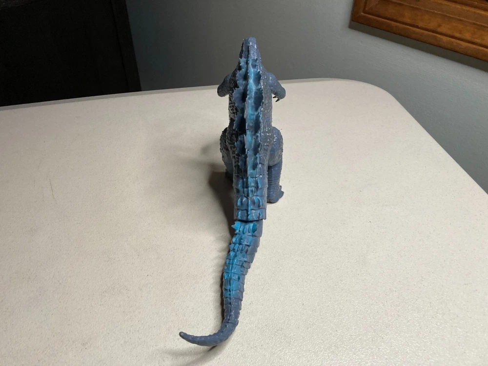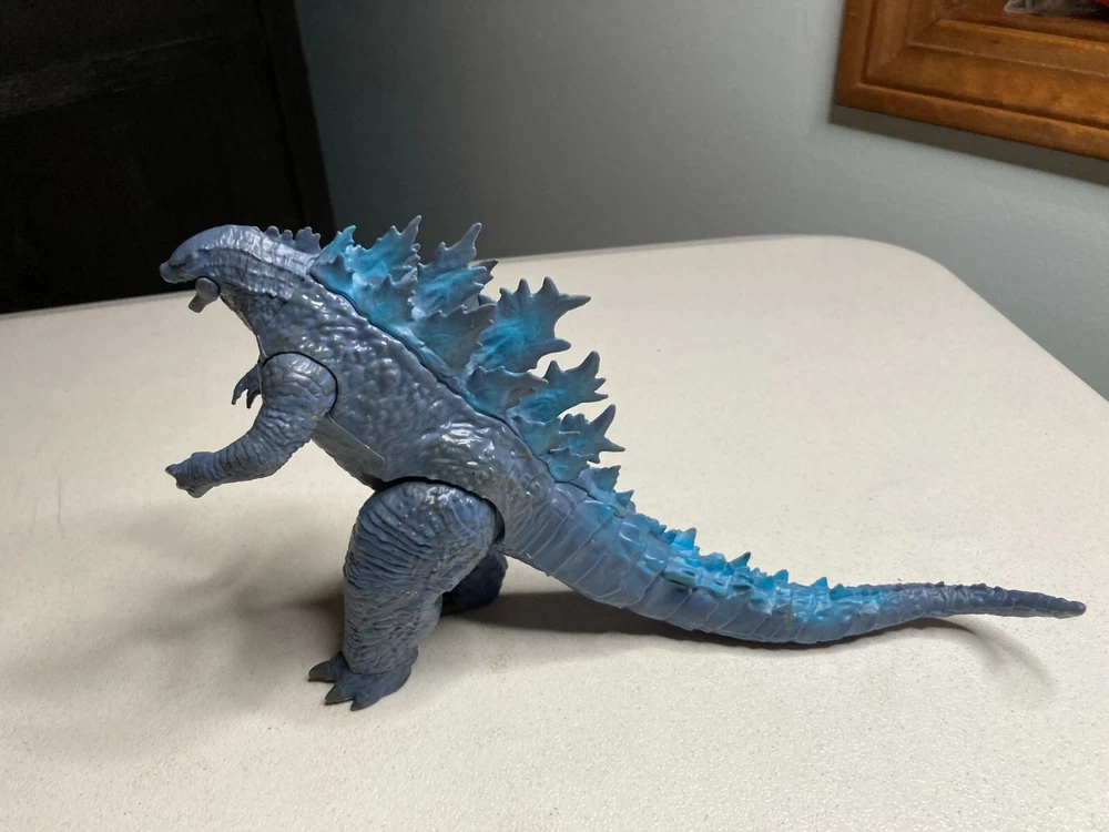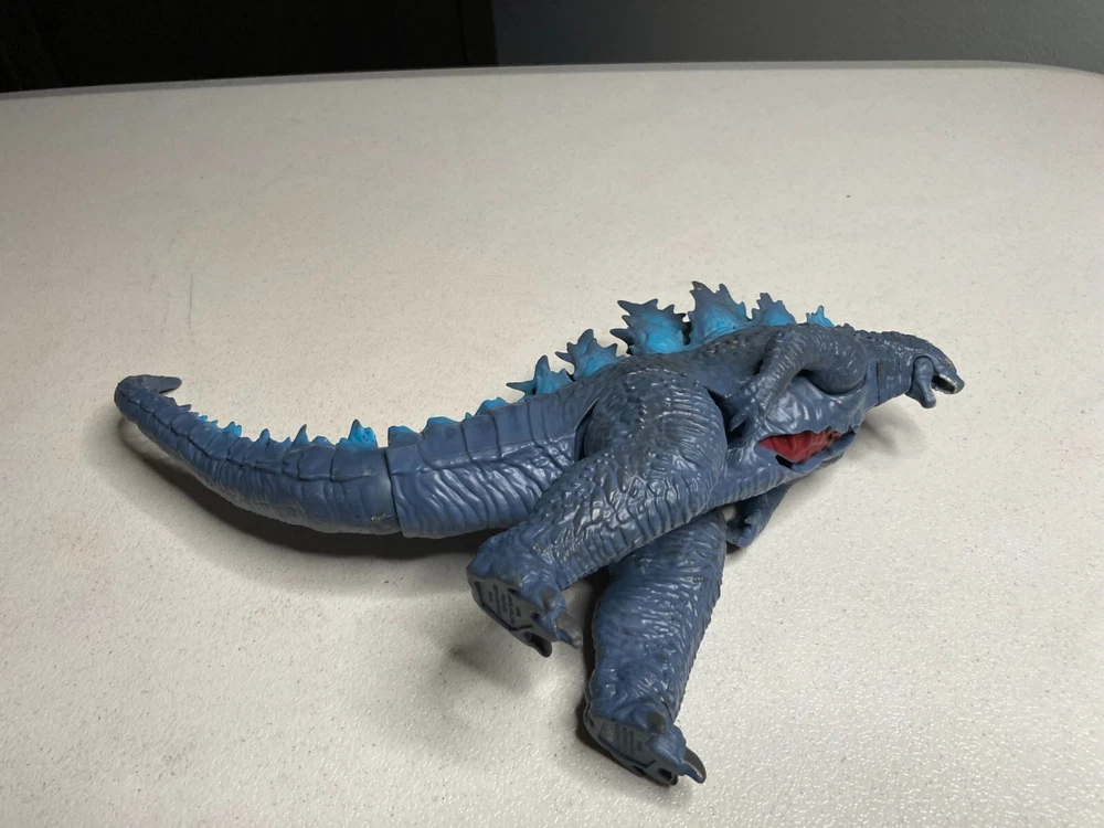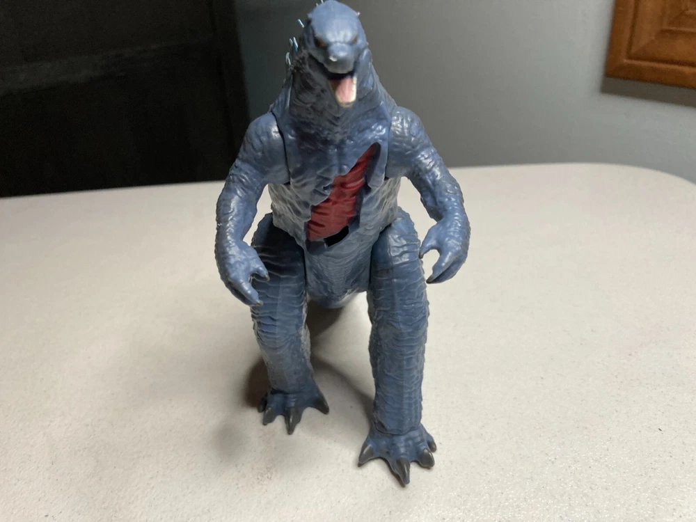 2020 Playmates TOHO Godzilla 11 inch from head to tail Moveable Action Figure. Figure is missing the removable chest piece that would cover the battle damage. Arms, legs and tail move and operate as they should. Shipping is USPS Ground Advantage.