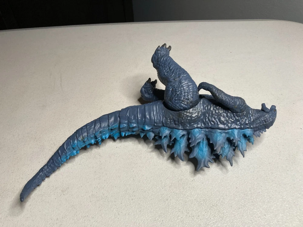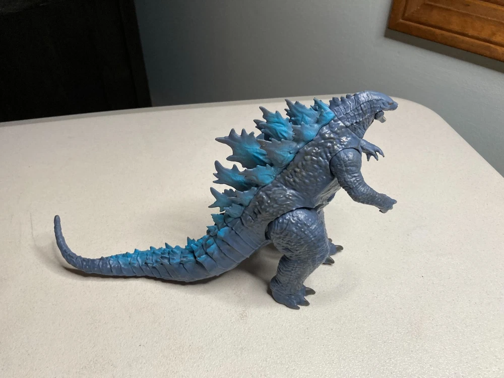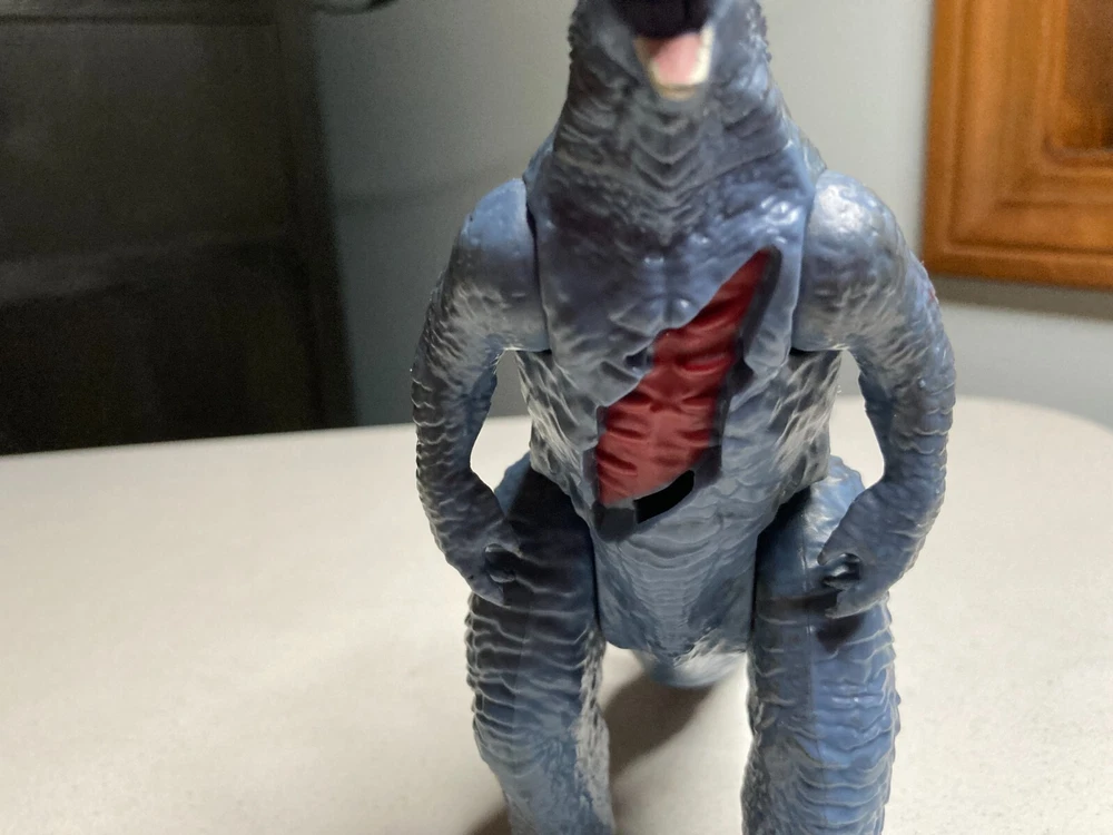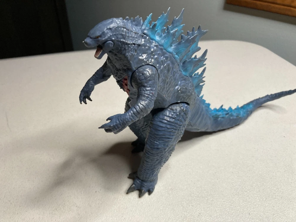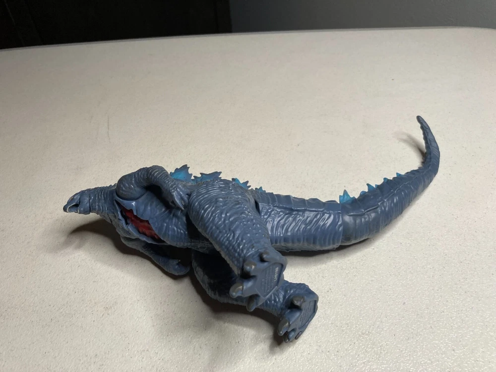 2020 Playmates TOHO Godzilla 11 inch from head to tail Moveable Action Figure. Figure is missing the removable chest piece that would cover the battle damage. Arms, legs and tail move and operate as they should. Shipping is USPS Ground Advantage.
