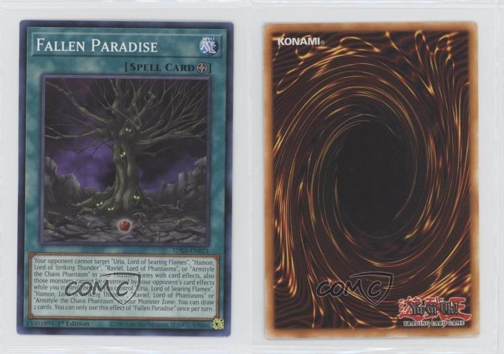 2020 Yu-Gi-Oh! - Structure Deck: Sacred Beasts - [Base] - 1st Edition #SDSA-EN021 Fallen Paradise COMC Item: 114131642 - YuGiOh Card Search for more: 2020 Yu-Gi-Oh! - Structure Deck: Sacred Beasts Search for more: 2020 Yu-Gi-Oh! - Structure Deck: Sacred Beasts - [Base] - 1st Edition View all of our Listings Auctions Buy It Now About Us Located in the beautiful Pacific Northwest, COMC (Check Out My Cards) is the world's largest consignment service for trading card singles. More than 10,000 people have used our consignment service to list over 50 million trading cards. Find out how we can help you consign your items on eBay by contacting us through eBay messaging. COMC -- "The Safe & Easy Way to Buy & Sell" Raw Condition for Modern Cards Unless otherwise noted, raw modern cards are listed in Near Mint-Mint condition or better. A NM-MT card appears to be Mint at first glance, but upon closer inspection, may exhibit some of the following: minor print defects (e.g. roller marks, print line, dimple), minor scratches, slight edge wear, and slight corner wear. Centering is clearly visible in the images provided and does not factor into our condition assessment. Raw Condition for Vintage Cards Unless otherwise noted, raw vintage cards are listed in Excellent condition or better. An EX card may exhibit some of the following: minor rounding of corners, surface wear, print defects, light scratches, and slight edge wear/chipping. Centering is clearly visible in the images provided and does not factor into our condition assessment. Domestic Shipping Combined shipping for multiple items is available. To receive combined shipping, please ensure all desired items are in your eBay shopping cart before proceeding to checkout. eBay limits orders to 40 items per order. We automatically combine multiple orders placed on the same day. If you place multiple orders on the same day, please contact us to request a refund of applicable shipping costs. Signature confirmation may be required on invoices over $400. All cards are protected and shipped securely. International Shipping COMC offers eBay's International Shipping (EIS) for international orders under $2,500* (see country exceptions below). All duties and import fees are paid at checkout; in the rare event that there are additional import fees upon delivery, these are borne by the buyer. EIS packages route through a shipping hub in Erlanger, KY before shipping to their final destination. Please note that EIS does not allow for combined shipments. The shipping rates are determined by eBay and cannot be adjusted. *Maximum sale price exceptions: Colombia, Kuwait ($2,000); Taiwan ($1,539); Chile, Costa Rica, Guatemala, Honduras, Trinidad and Tobago ($1,000); Antigua and Barbuda, Aruba, Belize, Dominica, Grenada, Philippines, Saint Kitts and Nevis, Saint Lucia, Montserrat, Turks and Caicos Islands ($500); Dominican Republic, El Salvador ($200). Please request a shipping quote through eBay messaging for orders that exceed the maximum sale price supported by eBay's International Shipping. You will be responsible for all duties and import fees for international orders shipped outside the EIS. All cards are protected and shipped securely. Payment COMC does not accept offers on our cards through our eBay storefront. COMC utilizes eBay’s managed payments system. If you are experiencing difficulties making a payment, please contact eBay for assistance. Return Policy Returns are only accepted on the rare occasion the item is not as described. If you are making a return, please initiate the return process through eBay so a mailing label can be provided for you. Prior to listing, our expert team carefully assessed this item to represent it accurately. Please review the description and high-definition images prior to purchasing to ensure this item meets your satisfaction. We welcome you to contact us if you have further questions about this item. Trust and Integrity COMC carefully assesses each item consigned to us to prevent fraudulent items from entering the marketplace. If you believe an item offered on COMC may be fraudulent, please contact us with details so we can investigate the issue. Items we determine are outside our supported items policy may be removed. Last Modified: 6/16/2025 10:50:19 AM PDT