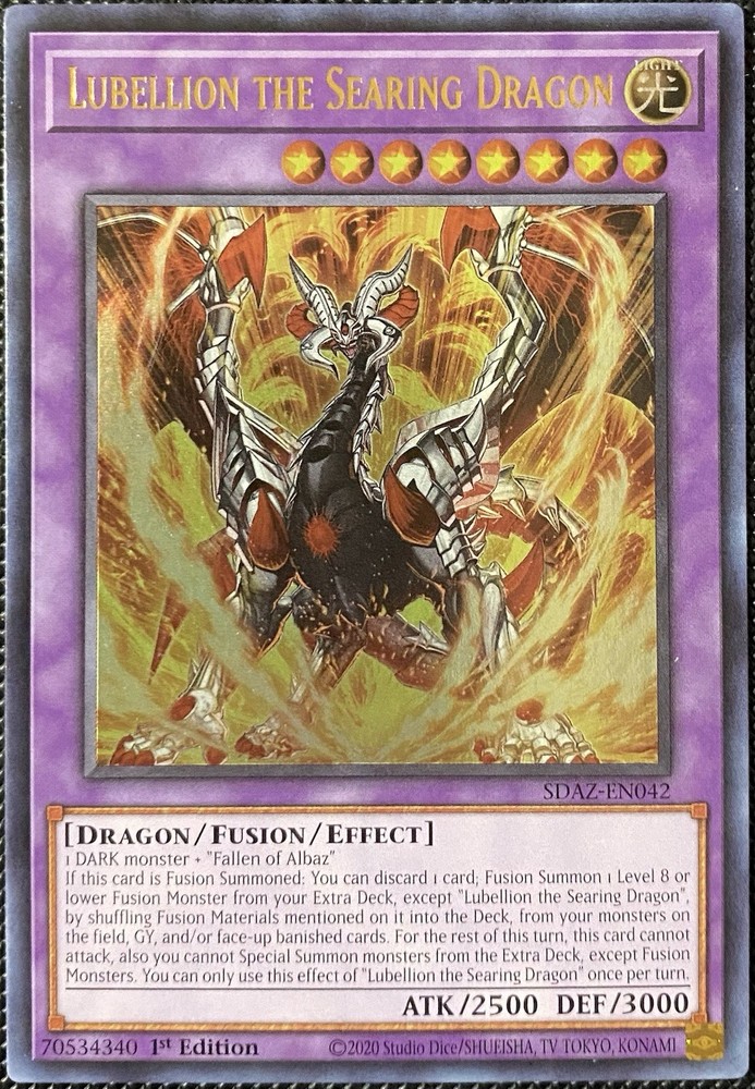 | Card Text | 1 DARK monster + "Fallen of Albaz" If this card is Fusion Summoned: You can discard 1 card; Fusion Summon 1 Level 8 or lower Fusion Monster from your Extra Deck, except "Lubellion the Searing Dragon", by shuffling Fusion Materials mentioned on it into the Deck, from your monsters on the field, GY, and/or face-up banished cards. For the rest of this turn, this card cannot attack, also you cannot Special Summon monsters from the Extra Deck, except Fusion Monsters. You can only use this effect of "Lubellion the Searing Dragon" once per turn. |