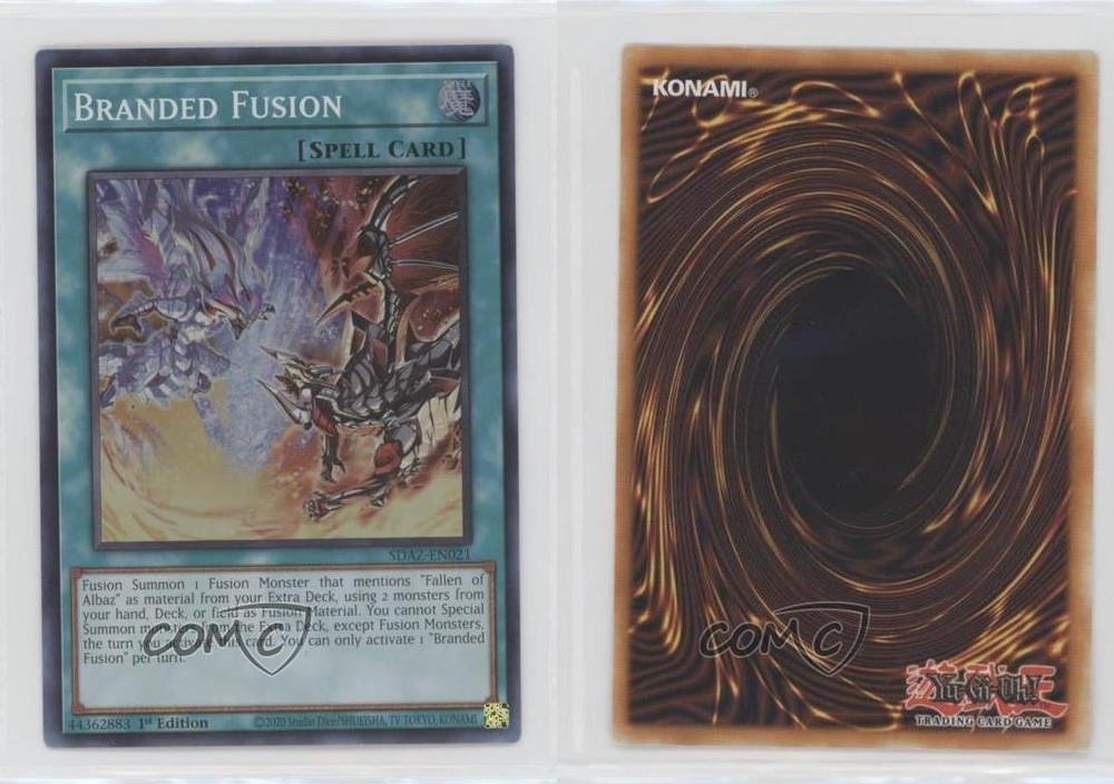 2022 Yu-Gi-Oh! Structure Deck: Albaz Strike - [Base] - 1st Edition #SDAZ-EN021 SR - Branded Fusion COMC Item: 134129115 - YuGiOh Card Search for more: 2022 Yu-Gi-Oh! Structure Deck: Albaz Strike Search for more: 2022 Yu-Gi-Oh! Structure Deck: Albaz Strike - [Base] - 1st Edition View all of our Listings Auctions Buy It Now About Us Located in the beautiful Pacific Northwest, COMC (Check Out My Cards) is the world's largest consignment service for trading card singles. More than 10,000 people have used our consignment service to list over 50 million trading cards. Find out how we can help you consign your items on eBay by contacting us through eBay messaging. COMC -- "The Safe & Easy Way to Buy & Sell" Raw Condition for Modern Cards Unless otherwise noted, raw modern cards are listed in Near Mint-Mint condition or better. A NM-MT card appears to be Mint at first glance, but upon closer inspection, may exhibit some of the following: minor print defects (e.g. roller marks, print line, dimple), minor scratches, slight edge wear, and slight corner wear. Centering is clearly visible in the images provided and does not factor into our condition assessment. Raw Condition for Vintage Cards Unless otherwise noted, raw vintage cards are listed in Excellent condition or better. An EX card may exhibit some of the following: minor rounding of corners, surface wear, print defects, light scratches, and slight edge wear/chipping. Centering is clearly visible in the images provided and does not factor into our condition assessment. Domestic Shipping Combined shipping for multiple items is available. To receive combined shipping, please ensure all desired items are in your eBay shopping cart before proceeding to checkout. eBay limits orders to 40 items per order. We automatically combine multiple orders placed on the same day. If you place multiple orders on the same day, please contact us to request a refund of applicable shipping costs. Signature confirmation may be required on invoices over $400. All cards are protected and shipped securely. International Shipping COMC offers eBay's International Shipping (EIS) for international orders under $2,500* (see country exceptions below). All duties and import fees are paid at checkout; in the rare event that there are additional import fees upon delivery, these are borne by the buyer. EIS packages route through a shipping hub in Erlanger, KY before shipping to their final destination. Please note that EIS does not allow for combined shipments. The shipping rates are determined by eBay and cannot be adjusted. *Maximum sale price exceptions: Colombia, Kuwait ($2,000); Taiwan ($1,539); Chile, Costa Rica, Guatemala, Honduras, Trinidad and Tobago ($1,000); Antigua and Barbuda, Aruba, Belize, Dominica, Grenada, Philippines, Saint Kitts and Nevis, Saint Lucia, Montserrat, Turks and Caicos Islands ($500); Dominican Republic, El Salvador ($200). Please request a shipping quote through eBay messaging for orders that exceed the maximum sale price supported by eBay's International Shipping. You will be responsible for all duties and import fees for international orders shipped outside the EIS. All cards are protected and shipped securely. Payment COMC does not accept offers on our cards through our eBay storefront. COMC utilizes eBay’s managed payments system. If you are experiencing difficulties making a payment, please contact eBay for assistance. Return Policy Returns are only accepted on the rare occasion the item is not as described. If you are making a return, please initiate the return process through eBay so a mailing label can be provided for you. Prior to listing, our expert team carefully assessed this item to represent it accurately. Please review the description and high-definition images prior to purchasing to ensure this item meets your satisfaction. We welcome you to contact us if you have further questions about this item. Trust and Integrity COMC carefully assesses each item consigned to us to prevent fraudulent items from entering the marketplace. If you believe an item offered on COMC may be fraudulent, please contact us with details so we can investigate the issue. Items we determine are outside our supported items policy may be removed. Last Modified: 6/19/2025 5:44:24 PM PDT