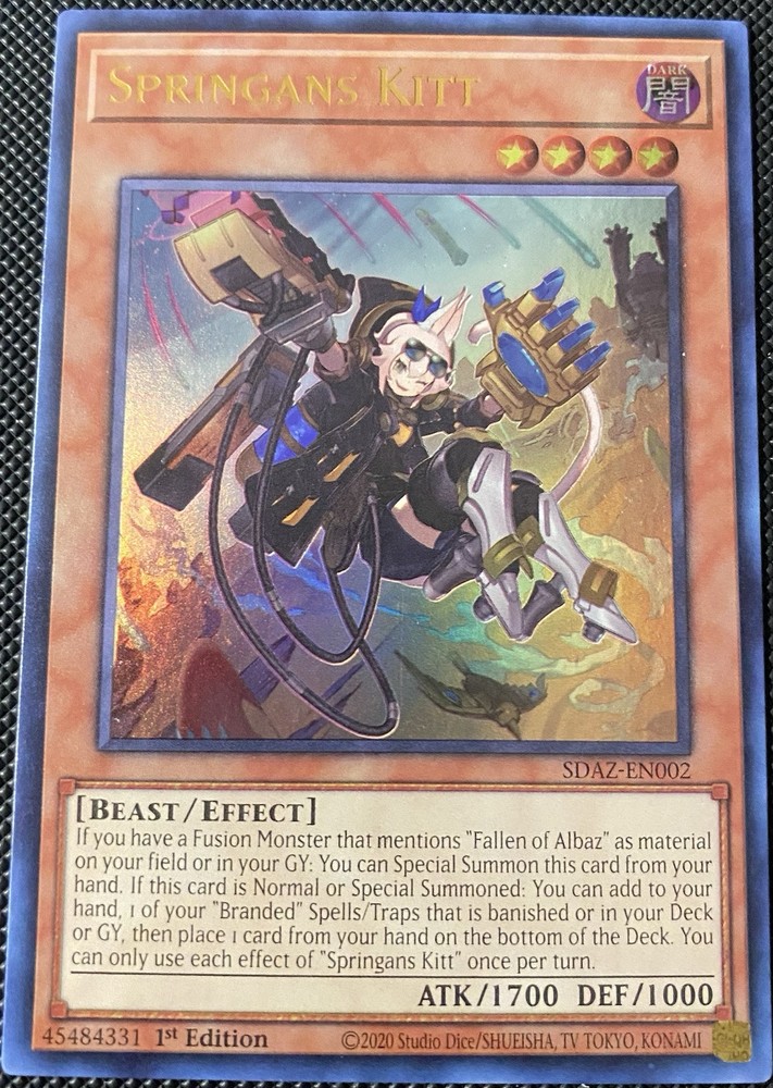 | Card Text | If you have a Fusion Monster that mentions "Fallen of Albaz" as material on your field or in your GY: You can Special Summon this card from your hand. If this card is Normal or Special Summoned: You can add to your hand, 1 of your "Branded" Spells/Traps that is banished or in your Deck or GY, then place 1 card from your hand on the bottom of the Deck. You can only use each effect of "Springans Kitt" once per turn. |
