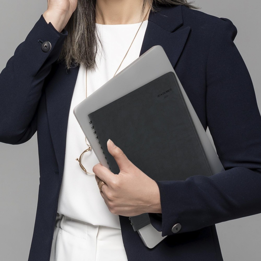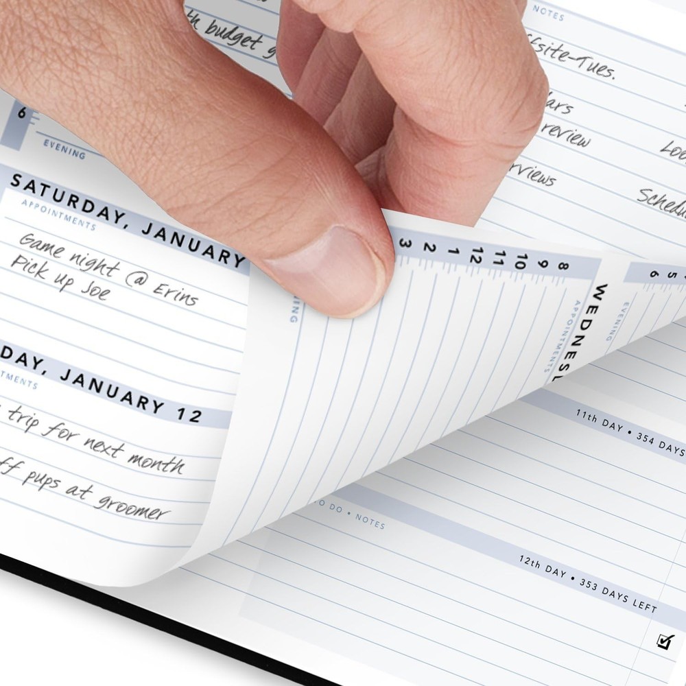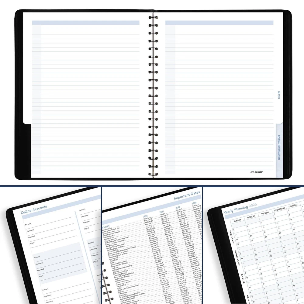 YEAR ROUND PLANNING – Planner covers 12 months from January 2025 — December 2025. Special planning help with organization and accomplishments. High-quality paper features ink bleed resistance. GUARANTEED TO LAST ALL YEAR – ACCO Brands will replace any defective planner that is returned within one year from the date of purchase. This guarantee does not cover damage due to misuse or abuse. INK BLEED RESISTANCE - Plan your schedule without fear of distracting ink bleeding. Our improved, high-quality paper is designed for ink bleed resistance, which keeps plans neat and legible. ACTION PLANNING – Tabbed sections clearly separate to-do’s, notes and special information for more list making, better organization and a feeling of accomplishment WEEKLY VIEWS – One week per two page spread has hourly appointments 8:00 a.m. – 6:00 p.m. Weekends are condensed for flexibility. Pages measure 8" x 11". SPECIAL FEATURES – Expand your organizational skills with special pages. Include 38 notes pages. STURDY DESIGN – The durable, black faux leather cover is made to last and stands up to wear and tear. Twin wire binding helps prevent snags and secures pages. ASSEMBLED IN THE U.S. – Thoughtfully designed and assembled in the U.S. using high-quality materials