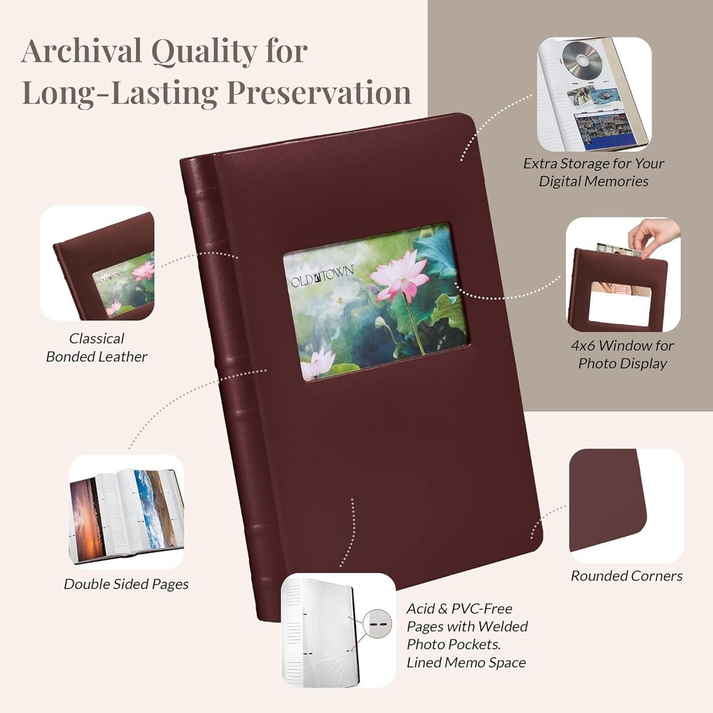 2-Pack Bonded Leather Photo Albums, Multi Size Photo Album 5x7 & 4x6 Slots, Acid-Free Photo Album 4x6 300 Photos or 100 5x7 Photos, 50 Double-sided Welded Pages, Burgundy Capture Every Memory: Preserve all your cherished moments with these 2-pack photo albums. Measuring 9x13 inches, these photo albums for 4x6 photos hold up to 300 images, or 100 5x7 and landscape photos. Elegant Design Meets Durability: Wrapped in classical bonded leather with an artistic raised spine and deluxe faux suede lining, this photo album is visually stunning and built to last. Its rounded corners are designed to minimize crushing and damage. Versatile Display for Photos: With the bi-directional pages in our multi size photo album, you can easily arrange postcards, pictures, and other keepsakes of various sizes. Plus, the lined memo space allows you to add personal notes or dates. Archival Quality: The leather photo album includes 50 double-sided welded pages. The picture albums feature acid-and-PVC-free pages to ensure that your photos remain vibrant, clear, and protected from fading or discoloration over time. Album for Photos with Extra Storage: Create a personalized photo album by showcasing a favorite photo or special logo in the 4x6-inch cover window. An additional back page offers space for 2 CDs and 2 index cards, keeping your memories neatly organized.