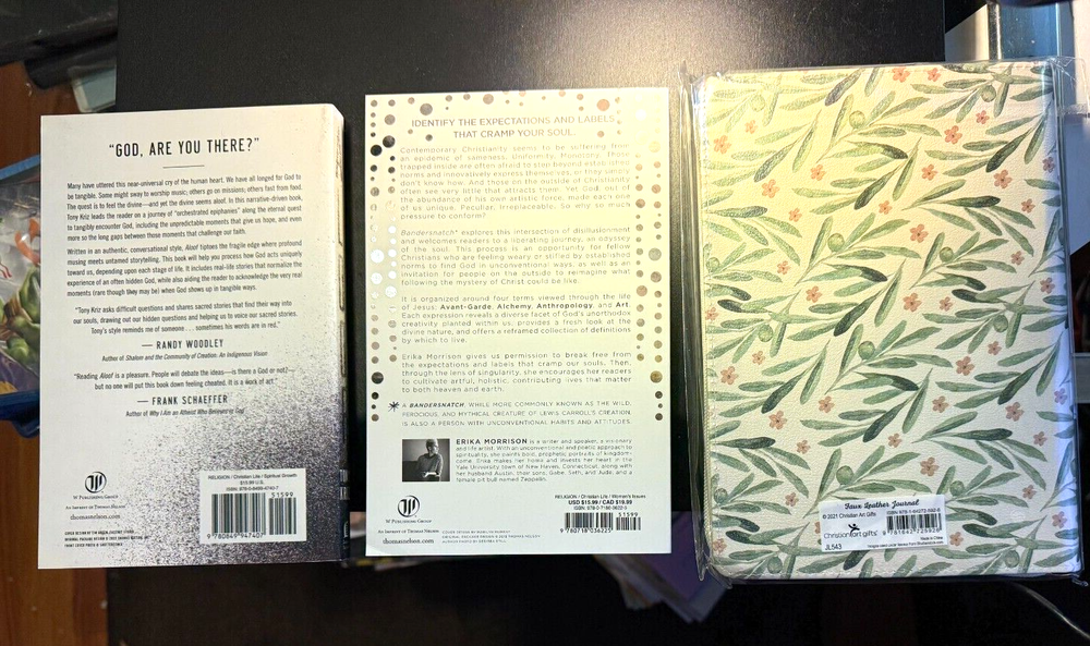 Gift Set 3 Items: 1. Journal with scriptures/Zipper - Jeremiah 29:11, 2. Book- ALOOF, Finding our life with a God that hides , 3. BOOK - BANDERSNATCH 1. For I Know The Plans Zipper Journal Product Description Faux leather gift journal with debossed design and wrap around zip closure Art and designer lettering; inspiring design 336 lined pages with Scripture Ribbon marker 8.75" x 6.5" "For I know the plans I have for you" declares the Lord. Plans to prosper you and not to harm you. Plans to give you hope and a future" Jeremiah 29:11 Patterned border design Product Information Title: For I Know The Plans Zipper Journal Format: Gift Number of Pages: 336 Vendor: Christian Art Gifts Publication Date: 2021 Weight: 1 pound 4 ounces ISBN-13: 9781642725926 Stock No: WW725929 Retail price: $19.99 2. Book: Aloof: Finding Our Life with a God That Hides Product Description Written in an authentic, conversational style, Aloof tiptoes the fragile edge where profound musing meets untamed storytelling. This book will help you process how God acts uniquely toward us, depending upon each stage of life. It includes real-life stories that normalize the experience of an often hidden God, while also aiding the reader to acknowledge the very real moments (rare though they may be) when God shows up in tangible ways. Product Information Title: Aloof: Figuring Out Life with a God Who Hides By: Tony Kriz Format: Paperback Number of Pages: 256 Vendor: W Publishing Publication Date: 2014 Dimensions: 8.38 X 5.50 (inches) Weight: 8 ounces ISBN: 0849947405 ISBN-13: 9780849947407 Publisher's Description " God, are you there?" is a near universal cry of the human heart. We have all longed for God to be tangible. Some might sway to worship music, others go on missions, others fast from food. The universal quest is to feel the divine . . . and yet the divine seems aloof, even shy. In this narrative-driven book, Tony Kriz leads the reader on a journey of “orchestrated epiphanies” along the eternal quest to tangibly encounter God, including the unpredictable moments that give us hope, and even more so, the long gaps between those moments that challenge our faith. Written in an authentic, conversational style, Aloof is easily accessible to those who don’t know much about the Bible, yet the message is still theologically informed and culturally relevant. This book will help you process how God acts uniquely towards us, depending upon each stage of life. The chapters include contemporary real-life stories that normalize the experience of an often hidden God, while also aiding the reader to acknowledge the very real moments (rare though they may be) when God has shown up in a tangible way. Book- B andersnatch: An Invitation to Explore Your Unconventional Soul Product Description We're all created differently, with individual personalities, loves, and talents. But why does it sometimes feel like the church wants us to fit in neat little boxes? Why is there so much pressure to conform? In Bandersnatch , author and speaker Erika Morrison gives us permission to break free from the expectations and labels that cramp our souls. Reimagine what following the beautiful mystery of Christ can be. Paperback. Title: Bandersnatch: An Invitation to Explore Your Unconventional Soul By: Erika Morrison Format: Paperback Number of Pages: 224 Vendor: Thomas Nelson Publication Date: 2015 Weight: 9 ounces ISBN: 0718036220 ISBN-13: 9780718036225