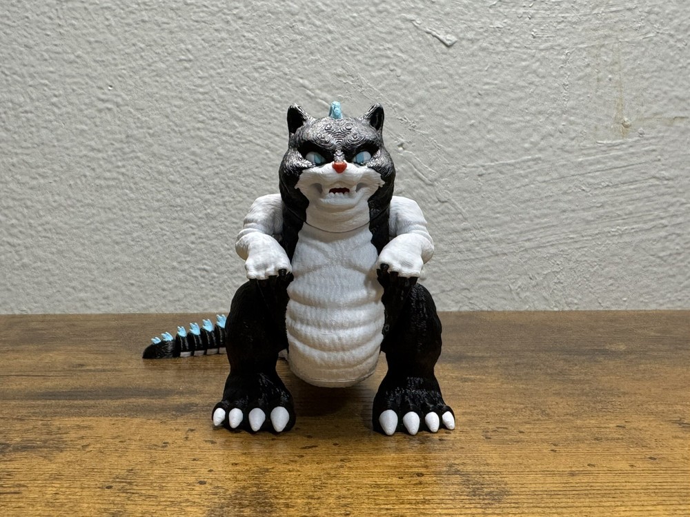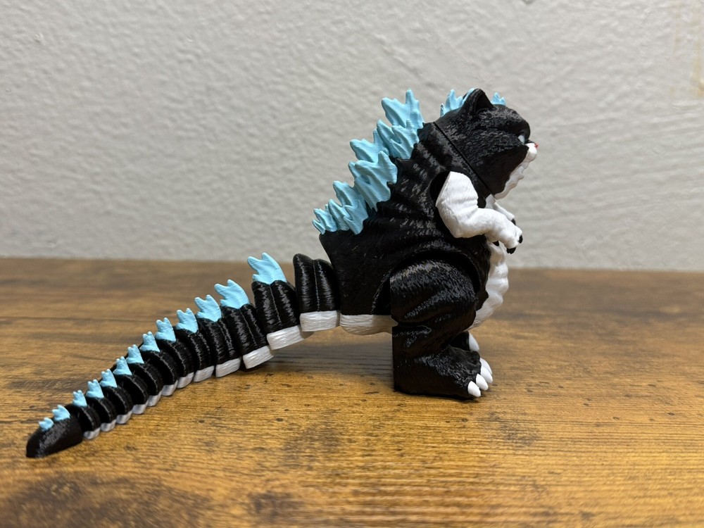 Unleash the purrfect blend of feline charm and monstrous might with this unique 3.5-inch Catzilla toy! Inspired by the legendary Godzilla, this 3D-printed figure is a must-have for collectors and fans alike. Each piece is meticulously crafted and printed on demand, ensuring a high-quality and detailed finish. **Features:** - **Size:** 3.5 inches tall - **Material:** Durable 3D printed plastic - **Design:** A whimsical fusion of a cat and Godzilla, featuring intricate details such as blue dorsal spines, a fierce expression, and a robust tail. - **Articulation:** Fully articulated limbs and tail for dynamic posing. - **Color:** Predominantly black and white with blue accents on the spines and tail. - **Handling Time:** Please note that each Catzilla is printed on demand, requiring a 4-day handling time before shipping. **Why You'll Love It:** - **Unique Collectible:** Stand out with this one-of-a-kind Catzilla figure that combines the cuteness of a cat with the iconic features of Godzilla. - **Perfect Gift:** Ideal for fans of Godzilla, cat lovers, and collectors of unique toys. - **High-Quality Print:** Each figure is printed with precision to capture every detail, ensuring a durable and visually appealing collectible. **Warning:** This product is made of plastic and may warp or deform if exposed to extreme heat. Please avoid leaving it in high-temperature environments, such as inside a car on a hot day. Add this adorable yet fearsome Catzilla to your collection today and let the monster mayhem begin! **Note:** Due to the made-to-order nature of this product, please allow for a 4-day handling time before your item is shipped.