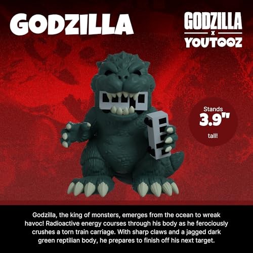 Youtooz Godzilla Collection: Radioactive energy courses through his bulky body which stands powerfully at 3.9 inches tall, ferociously crushing a torn off train carriage in his mouth. Posed with a sharp clawed hand reaching forward, he holds another carriage in the other preparing to finish it off next. His dark green reptilian body is covered in the thickest indestructible scaled hide, with archaic jagged spines running down his back onto his sturdy tail. Youtooz Custom Art Packaging: The exterior of his packaging shows him laying waste to Topkyo, violently ripping a train from its tracks while grey flames rage through the sky above the city. The interior sees the Godzilla’s stark black silhouette against a vibrant red background. While each panel of the protective sleeve is adorned with images of Mothra, Mecha Godzilla and King Ghidora reminiscent of classic movie posters. Youtooz Vinyl Material: This 3.9 inch figure is made with smooth & durable vinyl to ensure long shelf life. Youtooz Godzilla Packaging: The collectible ships in a matte, embossed, protective sleeve and a custom sized plastic protector for maximum protection during shipping. Youtooz Action Figure Gifts: This Godzilla collectible is the perfect gift for anyone who is a fan of the Godzilla franchise.