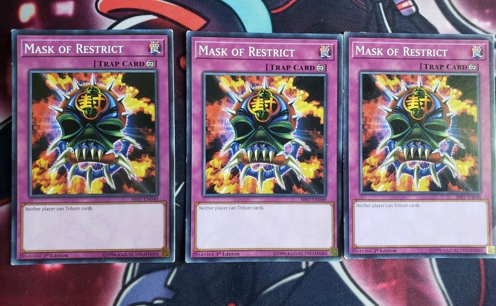 3 copies of Mask of Restrict from the Zombie Horde Structure deck. Cards are lightly played(minor edge wear) and first edition...