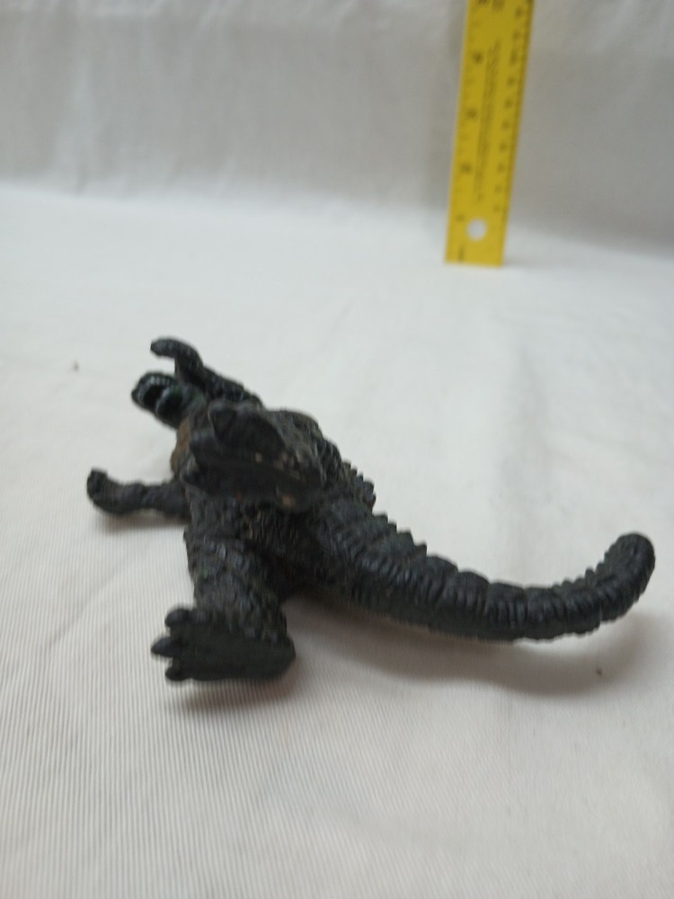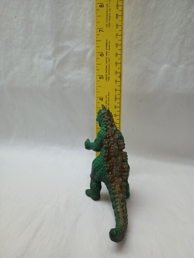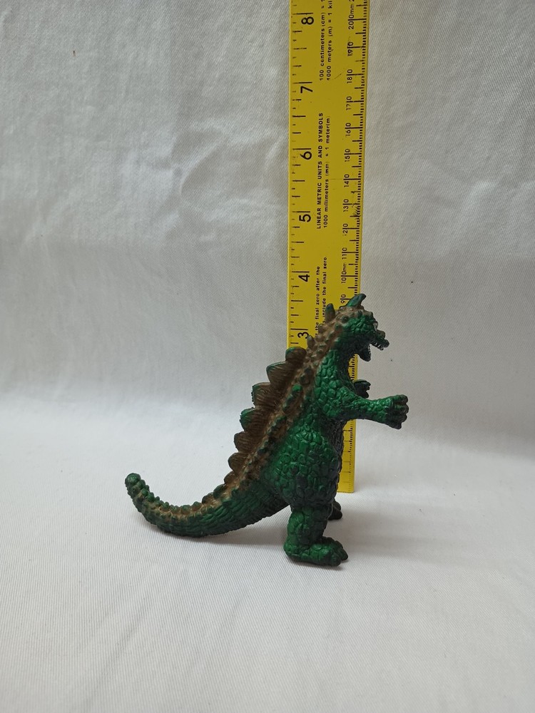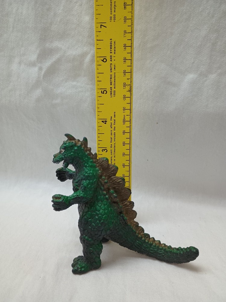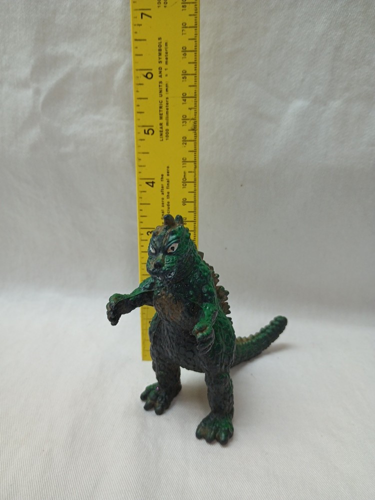 The product is a vintage 4" Godzilla action figure made of plastic in China. It features a green color with gold accents, part of the Godzilla franchise. It is suitable for all age levels and is an original reproduction. This figure does not come signed and is a collectible item for fans of Godzilla.