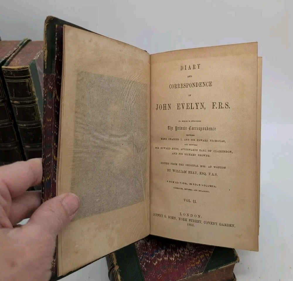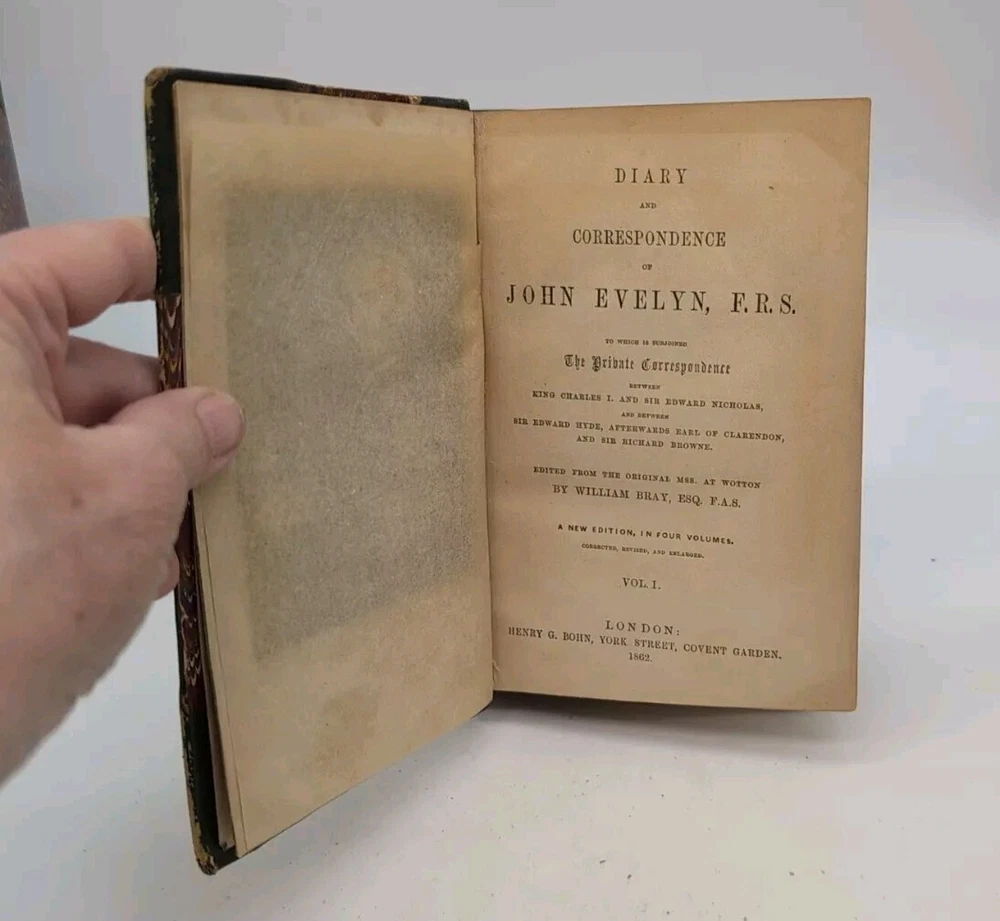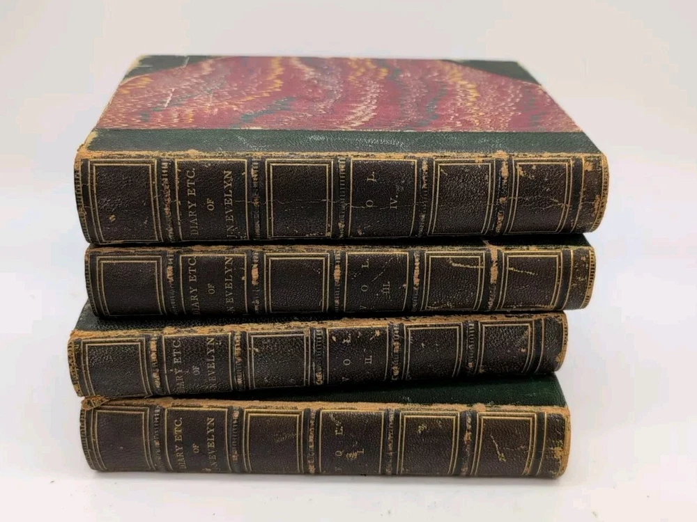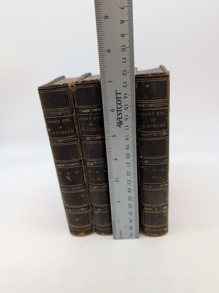 The product is a 4-volume set of John Evelyn's Diary, bound in quarter leather and published in London in the mid-19th century by Henry G. Bohn. This collector's edition set includes volumes 1 and 2 from 1862 and volumes 3 and 4 from 1863. The diary covers English history and provides readers with insights into the past through the eyes of the author, making it a valuable addition to any collection focused on English history and literature. Condition is pre-owned with some wear. Please review all photos before purchase as there are no returns. Ships with USPS Ground Advantage.
