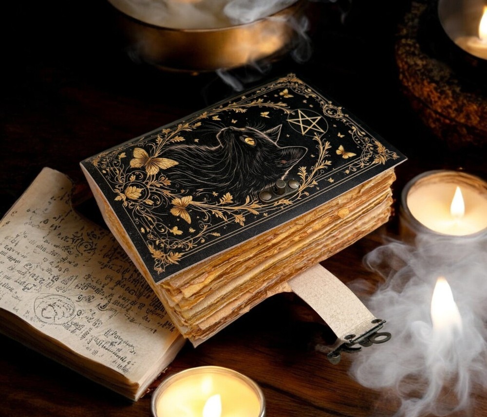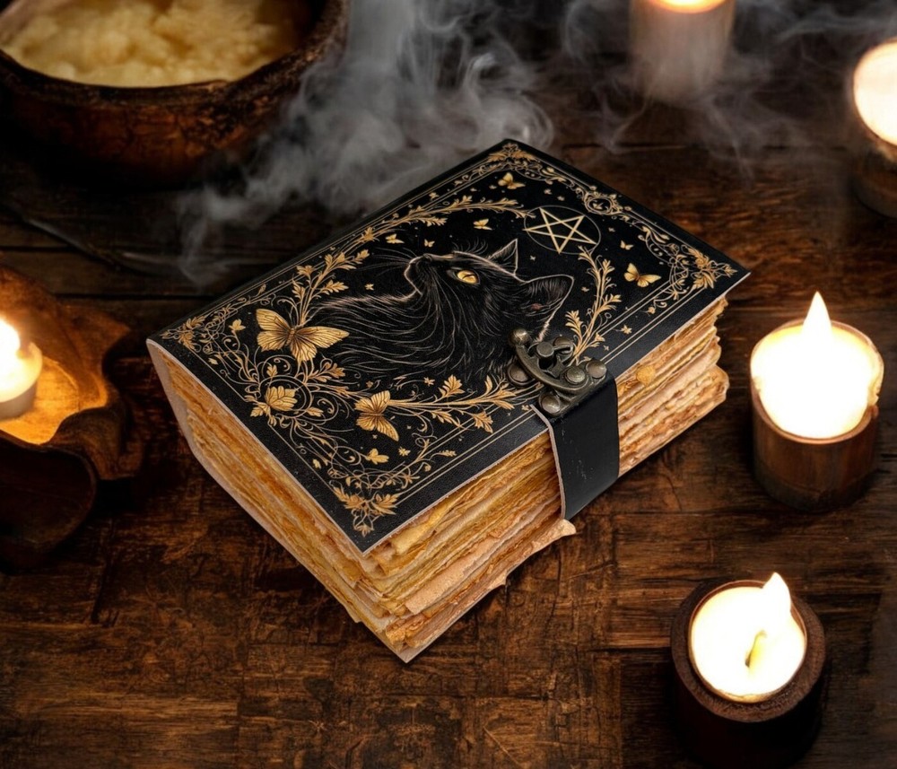 STYLISHLY MEDIEVAL HANDMADE VINTAGE PAPER - Ancient looking rustic cotton paper combined with the beauty of distressed leather, hand-stitched by Artisans, creates a keepsake you will cherish forever. Makes a great gift for the men, women, and Wiccans in your life! Cat Printed LEATHER PRINTED DESIGN - Perfectly print with Cat Printed designs, this journal makes a thoughtful gift to anyone of different cultures. IMMACULATE CRAFTMANSHIP - These journals are built from 200 pages of excellent quality handmade vintage papers with 150 GSM thick, and rich, durable handcrafted genuine brown leather covers. STRONG, STURDY BINDING & SMALL BRASS C-LOCK- Great quality journals always start with their binding. For the Vintage Leather Cat Printed Journal, the binding is stitched by sturdy hands to make sure that the papers are safe and secure. Many Uses - Can be used as a notepad, journal, writing notebook, sketch book. 1.25 inch thickness, easy for handwriting, drawing or sketching and compact for carrying in your bag. Ideal for alternative Artist Sketchbooks, Photo Album, Traveling Notes, Business Executive, Logbook, Poetry Work, Journalists, Food Planner, Instagram Scrapbook and Bible Journaling.