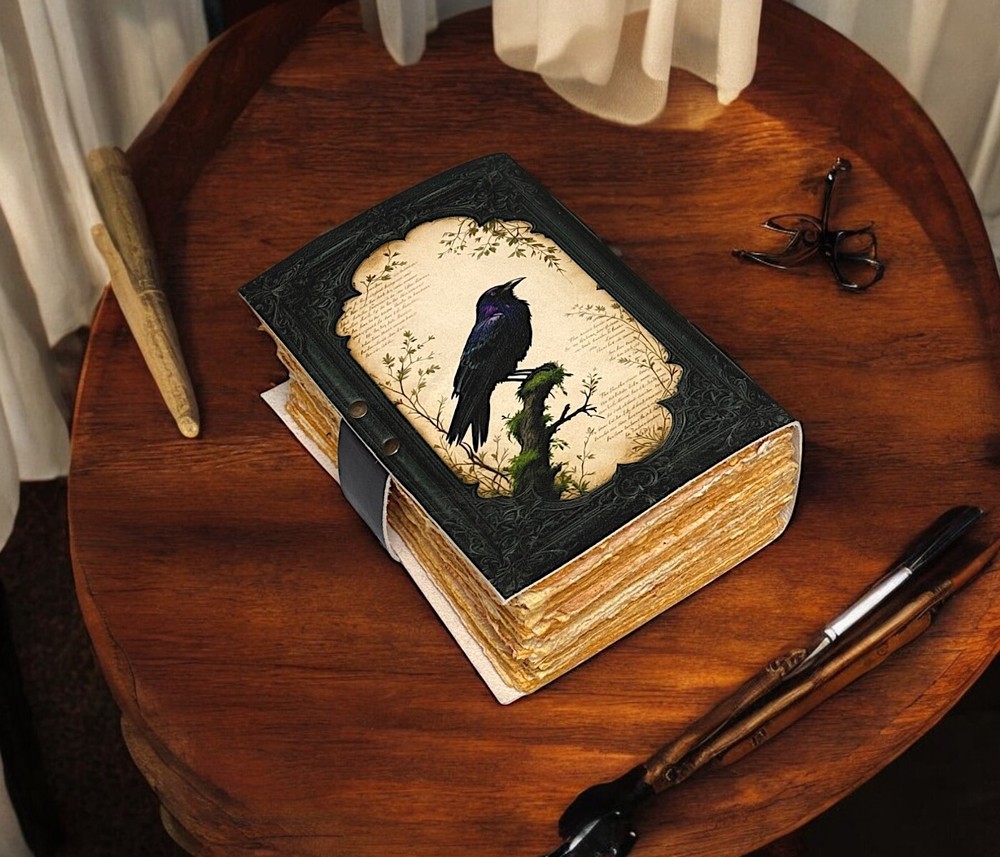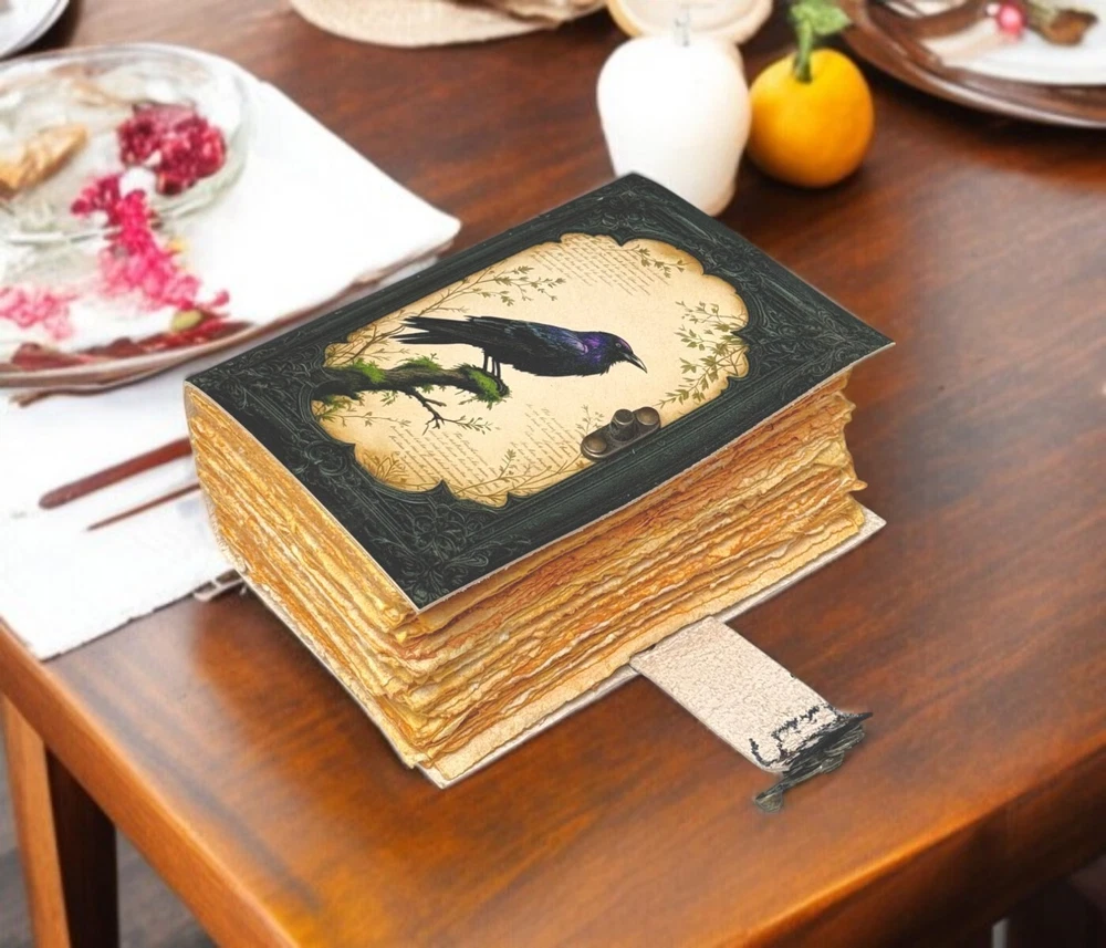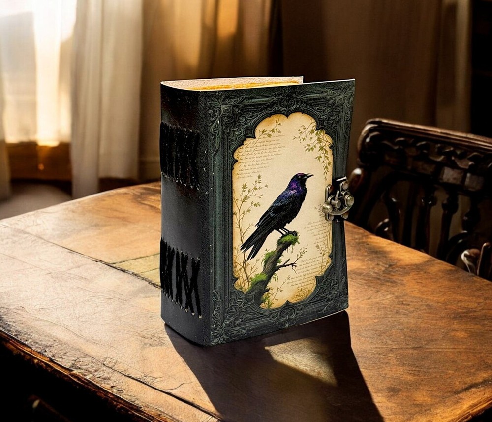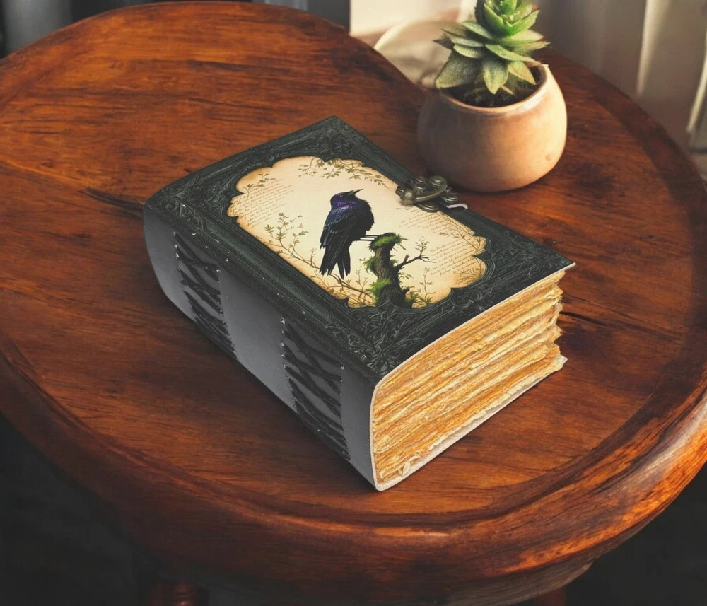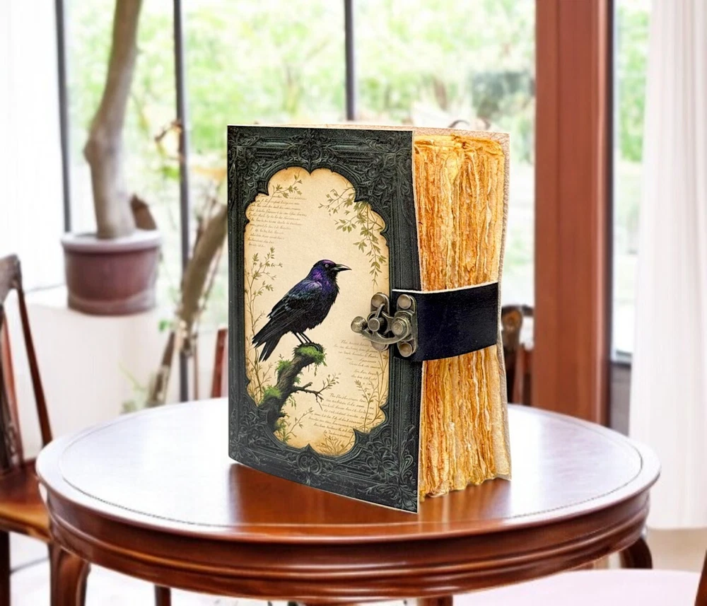 400 Page Large Grimoire leather journal, Print Raven, Blank spell book book of shadows Leather Celestial Gifts For Him Her • Print - Raven • Vintage lock closure • Genuine leather • Vintage deckle edge old paper • handmade rustic cotton paper • 100 Sheet (200 pages both side) ●Leather journal witchcraft book of shadows notebook is made with 200 pages of Antique Paper which looks like it was pulled from history. You will fall in love with the the antique handmade cotton paper which is unique to our Vintage Journal Notebook. ● The vintage clasp lock will keep all your valuable writing locked inside. Sturdy hand stitched binding to make sure that no paper comes out loose from your spell notebook. ● The witchcraft supplies journal is printed with a special seven stone called “Chakra healing” which helps to reveal inner truth within yourself and encourage self-awareness and self expression. We have taken extra to make sure that the emboss is perfect in every piece. ● Sketch, Doodle, Write on your Leather Blank Spell Journal with a Calligraphy Pen Fountain Pen, Brush Pen, Ball Pen, Acrylic Colours, Watercolor and many more. We guarantee no bleed through. ● Can be used as a notepad, journal, writing notebook, sketch book. 1.25 inch thickness, easy for handwriting, drawing or sketching and compact for carrying in your bag. Ideal for alternative ● Artist Sketchbooks, Photo Album, Traveling Notes, Business Executive, Logbook, Poetry Work, Journalists, Food Planner, Instagram Scrapbook and Bible Journaling. ● Best Gift For Your Companion: A Journal Is Like A Trusted Friend. You Can Use It To Solve Queries, Get Inventive, Or Record Valuable Memories For Them To Last Forever Or You Can Just Use It As A Gift For Your Wife, Son, Or A Daughter Or For Some Enthusiastic Writer In Your Family. Even For Looking For A Miraculous Spell Book Or A D&D Gamer Looking For His Quest Book. ● Perfectly Sized For Multi-Purpose Use: Length 5", Width 1", Height 7" Inches, This Easy To Carry Personal Diary Is Perfect To Use As A Health Journal, Sketchbook, And Poetry Journal. It’S An Ideal Journal Which Records Your Daily Thoughts And Life Lists. And Also Good For Designing, Doodling, Or Calligraphy Of Your Choice.