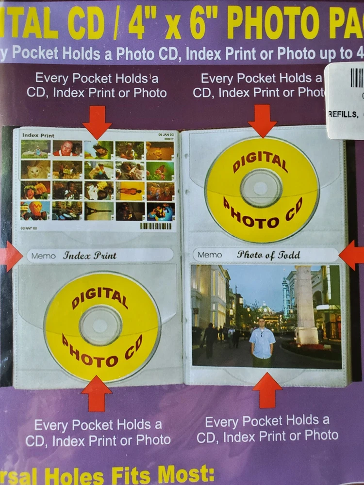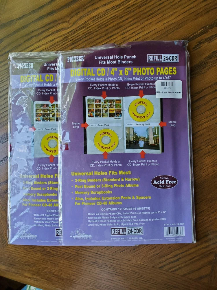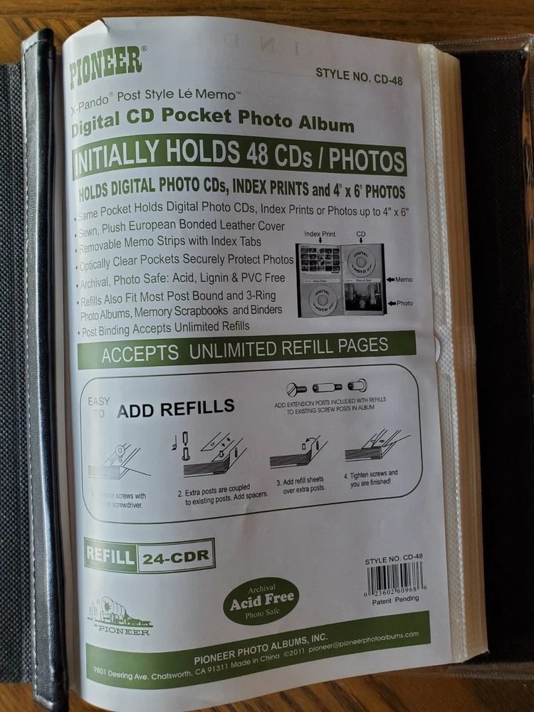 4 Pioneer Albums hold 48 CD/DVD's or Index Prints or Photos. Comes with 2 additional packets to hold an additional 24 CD/DVD/Index Prints/Photos. This Pioneer Bonded Leather Photo Album comes with 12 pages to hold up to 48 digital photo CD's, DVD's, 4x6 images or index prints. 48 total pockets Sewn, plush black European bonded leather cover Optically clear pockets with scratch free white background to protect CD's Includes removable memo labeling strips with index tabs Dimensions: 7-7/8 x 11-1/4 Post binding photo album accepts up to 4 packs of refills MODEL #48CDR Refills also fit most post bound albums, 3-ring albums, memory scrapbooks and Binders Archival, photo safe: acid, lignin and PVC free 2 refill packs included