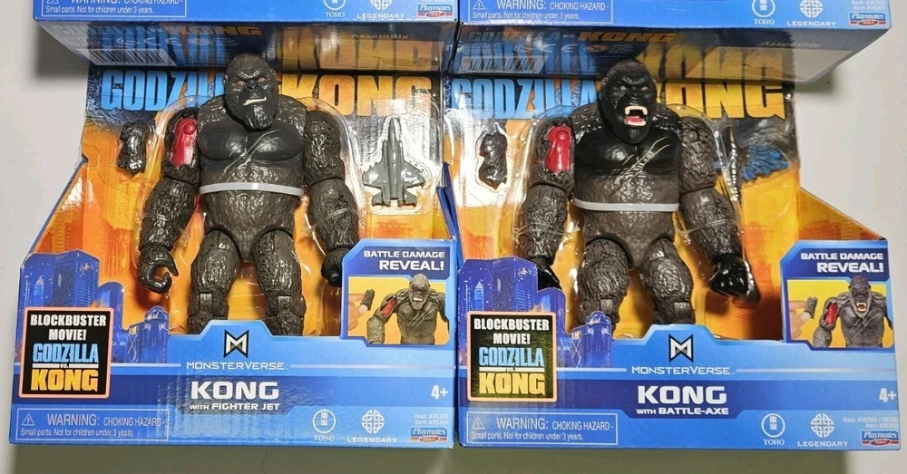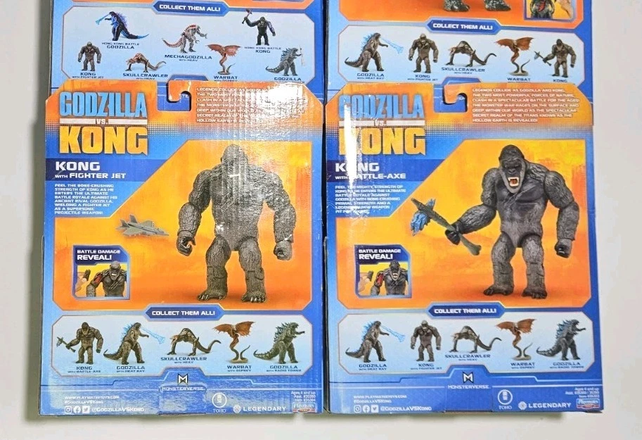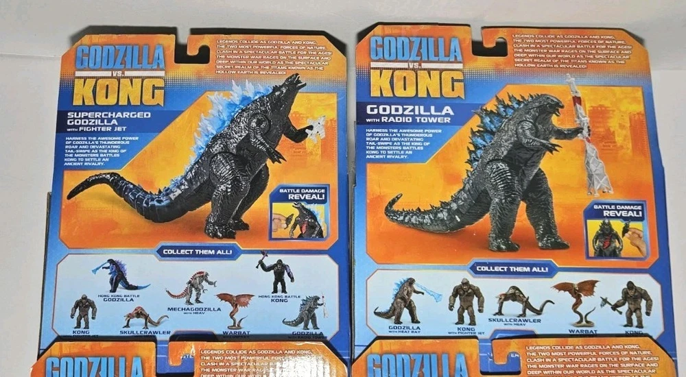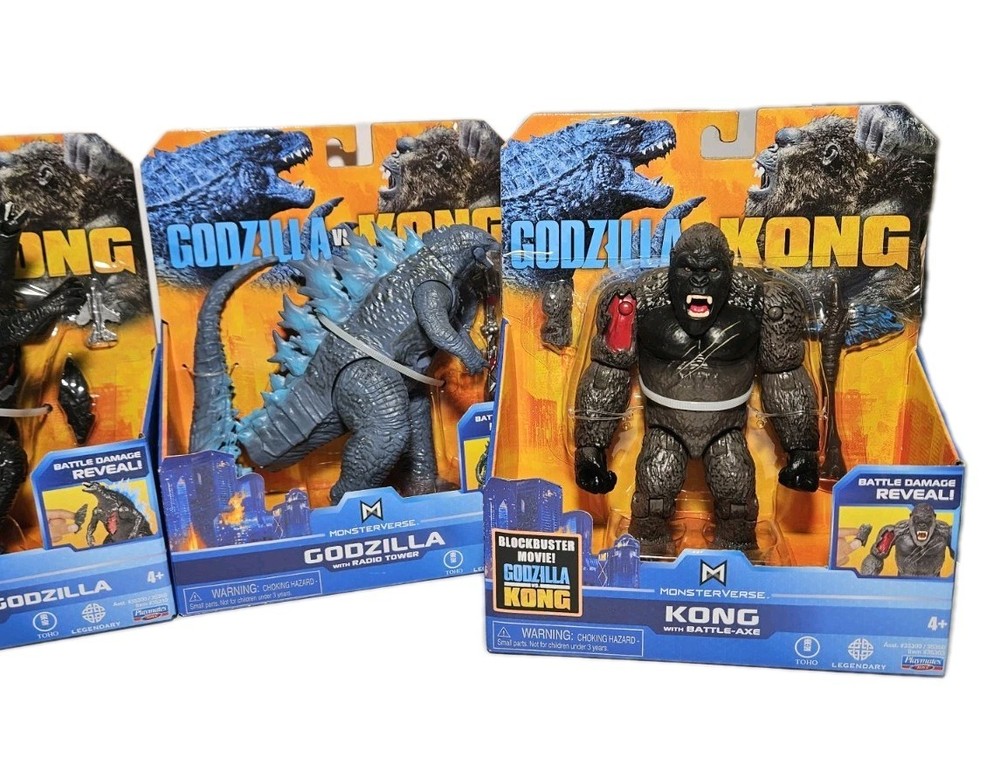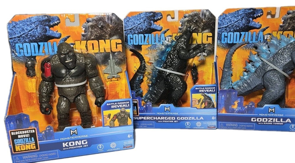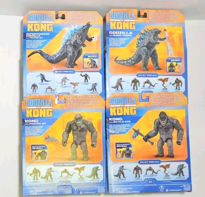 4x Godzilla vs Kong Figures: Godzillla Radio Tower Kong Battle Axe Fighter Jet Includes: One (1) - Godzilla with Radio Tower 6" Action Figure, One (1) - Supercharged Godzilla with Fighter Jet Action Figure, One (1) - Kong with Battle Axe 6" Action Figure, and One (1) - Kong with Fighter Jet Action Figure This FOUR Figure Lot is a great birthday or Christmas gift! All toys are brand new in original packaging Ships FREE via USPS Ground Advantage or UPS Ground depending on location!