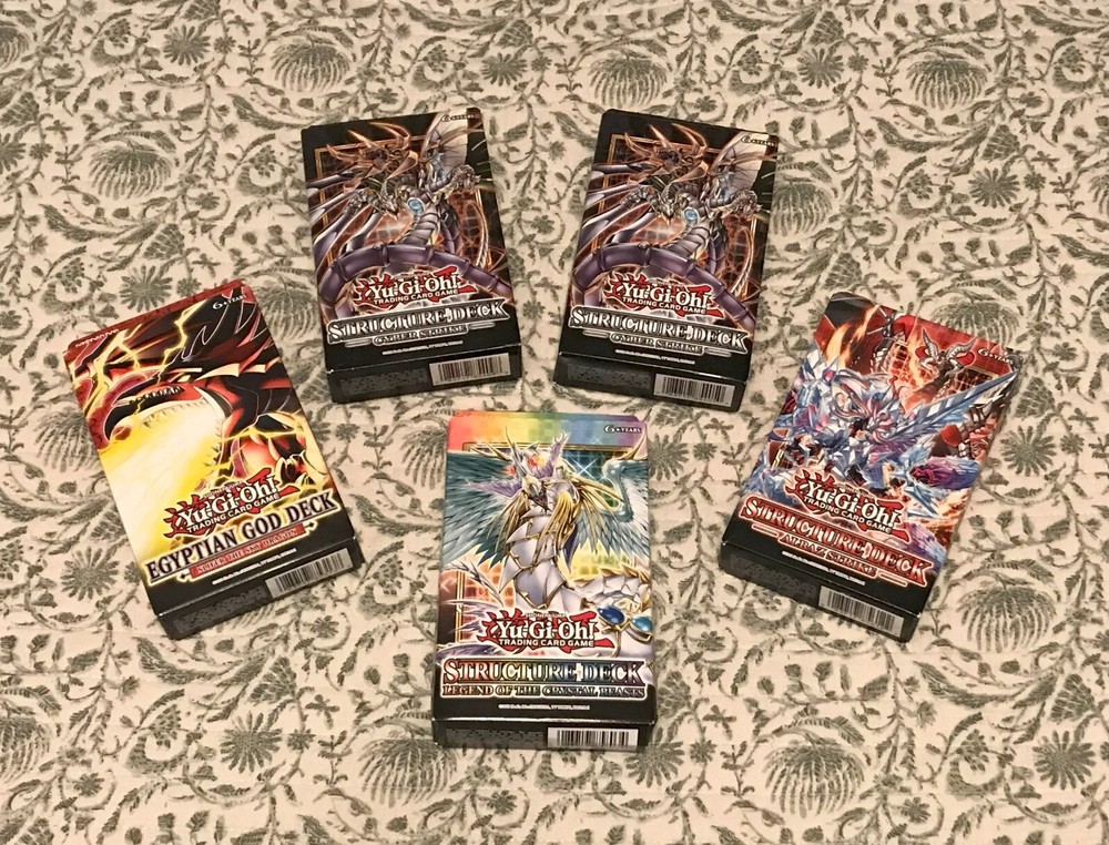 Structure Deck: Legend of the Crystal Beasts contains: • 1 Preconstructed Deck of 48 cards • 1 Double-sided Playmat/Dueling Guide Egyptian God Deck: Slifer the Sky Dragon contains: • 1 Preconstructed Deck of 40 cards • 1 Double-sided Game Mat/Dueling Guide Structure Deck: Albaz Strike contains: • 1 Preconstructed Deck of 48 cards • 1 Double-sided Playmat/Dueling Guide Each Structure Deck: Cyber Strike contains: • 1 Preconstructed Deck of 48 cards • 1 Double-sided Playmat/Dueling Guide