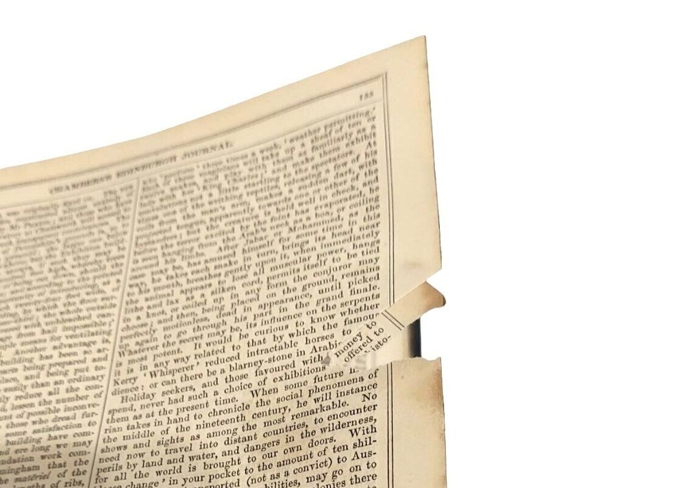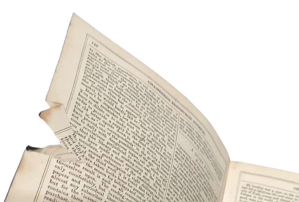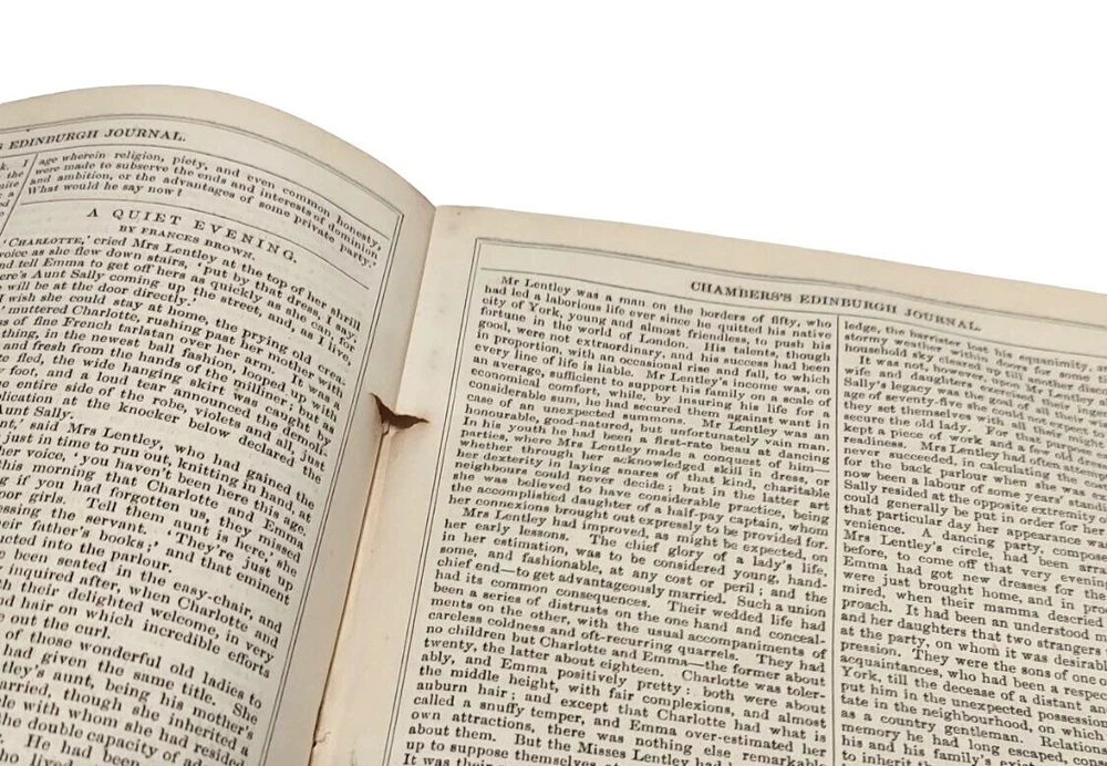 6 bound volume of Chamber's Edinburgh Journal Conducted by William and Robert Chambers Volume VII (Jan. to June 1847) Volume IX (Jan. to June 1848) Volume X (July to Dec. 1848) (spine is marked Vol. XI - title page is marked Vol. X) Volume XIV (July to Dec. 1850) Volume XV (Jan. to June 1851) Volume XVI ( July to Dec. 1851) Each weekly volume is full of essays, short stories / tales, scientific/historical articles, poetry, and anecdotes. Hardcover with leather spine and corners. Decorative covers. Plain paper end pages. Gilt accents. Decorative patterns on the edges of the closed page block. This is one of several books we are currently listing in this or a similar type of binding. Would be stunning grouped together in an office or library. Each hardcover is over 400 pages. Each is printed in London. A few of the stories and articles included in these volumes include: Cancer Said to be Cured by Mesmerism To an Old Volume of Robinson Crusoe (poem) The Cretan Daughter The Two Homes: A Story for Wives The Death Warning: A Legend of Saco Island Hint to Temperance Societies Police Statistics of Manchester The Lentil in Scotland The Sheep - Farmer in Australia Ridicule as a Weapon Tales of the Coast Guard Condition: Good condition. Antique volumes. Covers have rubbing and wear to the decorative boards. Age toning to the pages. Pages are not brittle but they need to be handled with caution - they are printed on a paper closer to newsprint than other books I have listed. Corner tips and spine ends have wear and the boards are exposed in places. A few pages have creased corners. Volume X/XI has a loose page that is laid into place (page 15-16) and this page has a tear in the edge along with some chips on the edges. Page 245-6 of volume VII has a short tear in the gutter with a long crease across the page. Pages 135-7 of Vol. XIV have short tears with creasing. Otherwise tight binding. Please view all photographs and consider them as part of the description.