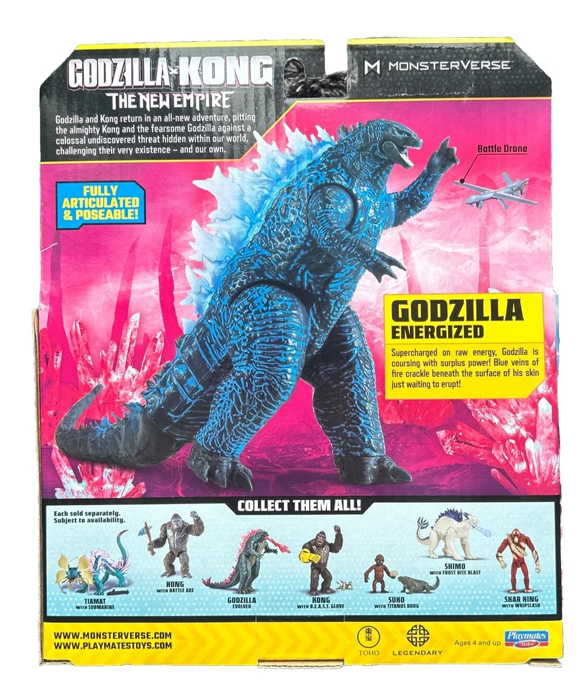 Introducing the 6" Energized Godzilla figure from the Godzilla vs Kong: The New Empire franchise. This action figure comes in its original packaging and includes a battle drone. The figure is made of plastic and stands at a height of 6 inches. It is recommended for ages 4 and up and is perfect for fans of the Godzilla franchise. The figure features a blue color scheme and is part of the Playmates Toys brand. It is a must-have for collectors and fans alike.