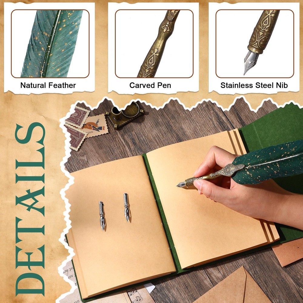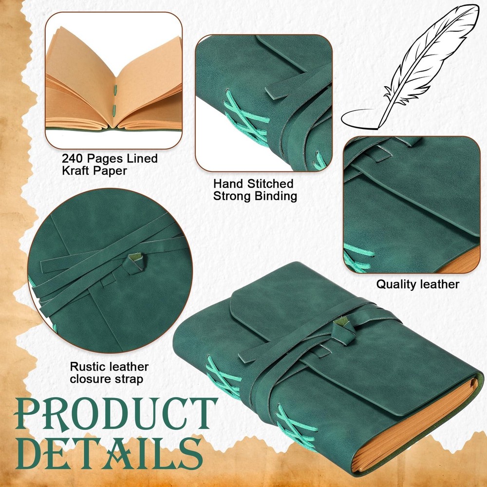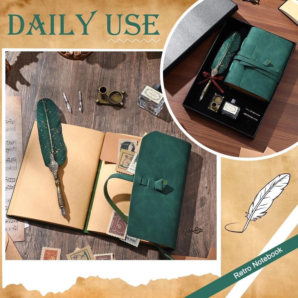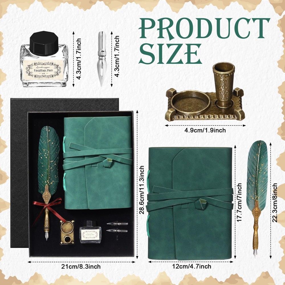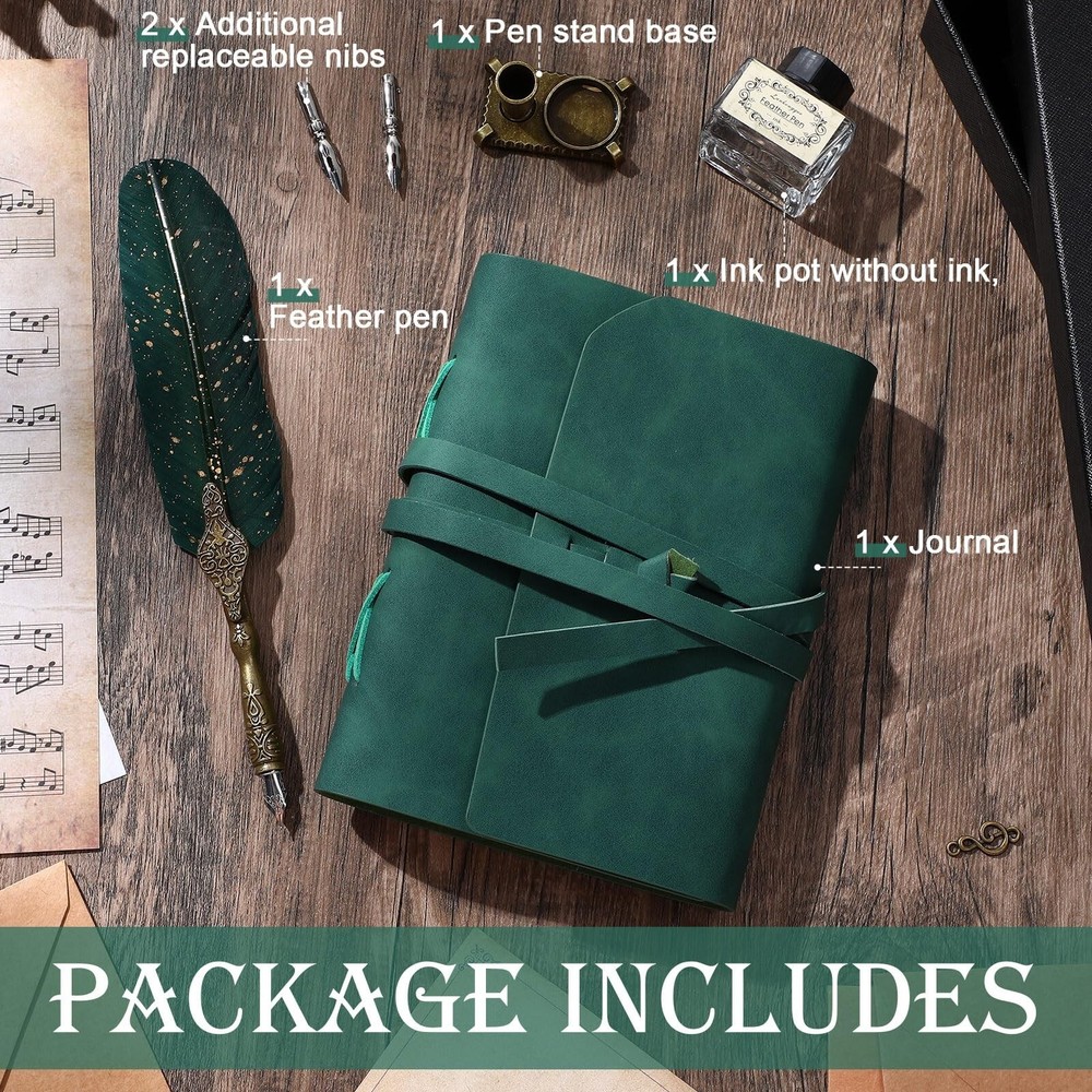 6 Pcs Vintage Leather Bound Journal Feather Pen Set Gifts 220 Pages Vintage Journal Diary Leather Notebook Feather Pen in Gift Box Back to School Supplies for Men and Women(Dark Green) Product Details Color: Dark Green Brand: Mooliwe MPN: Mooliwe-Pen Set-13 UPC: Does not apply EAN: Does not apply Brand: Mooliwe Color: Dark Green Theme: Book Sheet Size: 3 x 5 Pages: 220 Pages Cover Material: Leather Style: Vintage Ruling Type: Ruled Special Feature: Soft Cover, Portable Number of Items: 2 Manufacturer: Mooliwe Brand: Mooliwe Item Weight: 1.65 pounds Product Dimensions: 7 x 4.7 x 1.96 inches Color: Dark Green Cover Material: Leather Number of Items: 2 Ruling: Ruled Sheet Size: 3 x 5 Manufacturer Part Number: Mooliwe-Pen Set-13 Date First Available: June 17, 2024 Vintage Leather Journal Pen Set: our vintage leather journal pen set include 1 vintage journal, 1 feather pen, 1 ink pot, 1 pen stand base, and 2 additional replaceable nibs for easy maintenance and longevity; Come in gift box packaging, giving a vintage appeal for a good writing experience High Material: this leather vintage journal is crafted from crafted with PU leather, this leather journal offers an exterior with natural; The texture and color of both the leather and paper may naturally differ, adding to the individuality of each journal; Each feather on our pen is sourced naturally, adorned with golden powder, reflecting beauty in every light Vintage Kraft Paper: the notebook's inner paper adopts vintage kraft paper complementing the notebook cover; With a thickness of 240 inner pages, it provides a moderate thickness, and the writing experience is smooth without easy printing or dyeing; Compact 7 x 4.7 inches, easy to carry when travelling or in your daily life; Belt wrap around closure to keep the papers of the journal safe, handstitched binding and meticulous leather binding method to make sure that no paper comes out loose Rediscover the Joy of Writing: the intricate design of this retro carving quill pen will bring back the pleasure of penmanship and spark your creative inspiration; It is good for capturing your thoughts, memories, and creative ideas; Break away from the monotonous typing and texting, and enjoy the rustic elegance and durability of our journals Thoughtful Gift Choice: encased in a beautifully simple yet elegant gift set, this quill pen and leather journal set come in gift box packaging, serving as a meaningful gift for your writers, artists, teacher and travelers, or for someone starting an adventure and a good gift for back to school gifts; It's good for signing, drawing, or writing and ideal for occasions like Halloween, Christmas, Thanksgiving, birthdays and so on, truly a symbol of sophistication and style