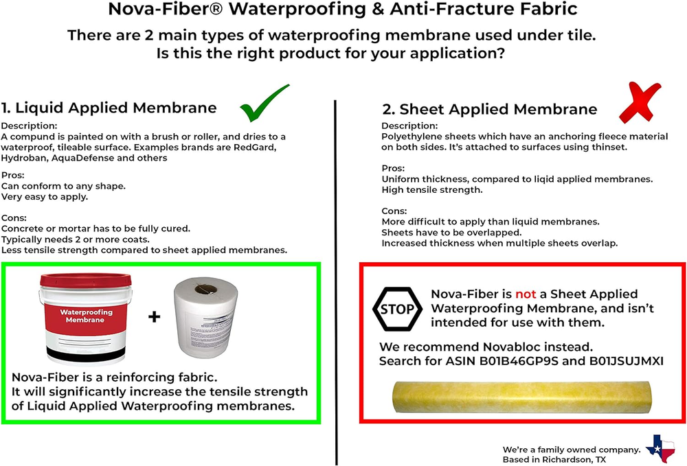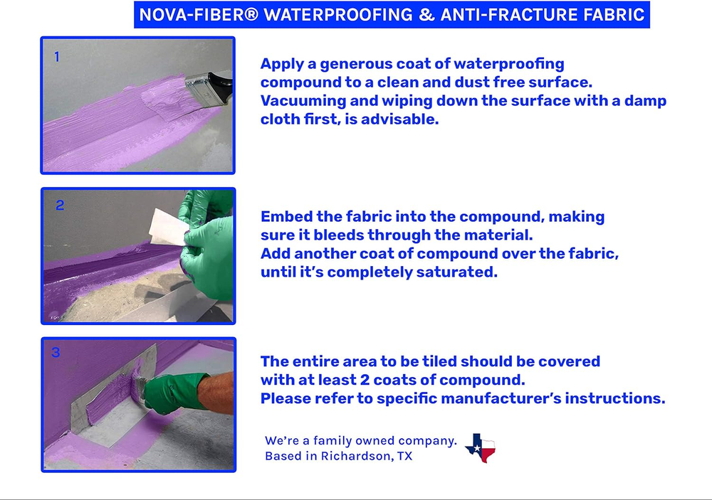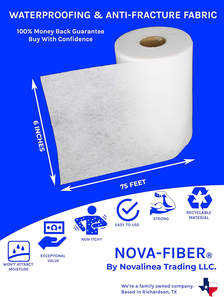 ✅New and improved version, now even denser, stronger, longer and more flexible than before ✅Now contains no fiberglass, just like the membrane manufacturer's own product ✅Matches performance of oem product, use with any liquid (latex based) waterproofing membranes ✅Works perfectly with Redgard, Hydro Ban, Hydro Barrier, AquaDefense and others ✅Made from alkali resistant synthetic fibers. Outperforms fiberglass mesh tape. Product Description Our Story We're a husband and wife team based in Dallas, Texas. Our company was born from a creative spark in 2014 following a DIY bathroom project. The project turned out to be slow and frustrating, but ultimately a rewarding experience. As a result, we realized that we could source better, easier-to-use, and cheaper products than big box stores. Our primary focus has always been products related to shower and bathroom construction, such as Linear Shower Drains, Shower Niches, and various waterproofing products. How does Nova-Fiber work? Our product is made from a hydrophobic synthetic material, where the individual fibers are treated to repel water. Nevertheless, the fabric allows the liquid compound to fully penetrate and encapsulate it. In a typical shower installation, Nova-fiber greatly increases the tensile strength of the dried waterproofing compound, and reinforces corners and transitions between the backerboard and mortar bed. What makes Nova-Fiber different from other brands on the market? Having worked with the materials yourself and listening to our customers gives us an edge over our competitors. In short, we've learned what works well, and what doesn't. Some fabrics tend to be too thick, absorbing excessive amounts of waterproofing compound (which is very expensive) and swelling like a sponge. This makes them more difficult to work around sharp transitions, and can result in a lumpy and uneven surface. Other fabrics can be too stiff, resulting in the edges curling up and not staying put when wetted with the liquid compound. Fiberglass based fabrics have some benefits, however are very unpleasant to handle, and lose considerable strength if they are folded or creased. There are also surface applied sheet membranes (Kerdi etc.), they are not designed to work with liquid membranes at all, They are completely non-absorbent and will simply delaminate. Start your project today for the shower of your dreams Quick and Easy Nova-fiber is designed for strength and ease of use. Use with any liquid waterproofing compound It doesn't matter if it's Red, Green, Blue or whatever; Nova-fiber works with all of them. Economical A roll of Nova-Fiber will cover lots of corners, transitions, niches etc.. But more importantly, it's frugal with your waterproofing compound. Beautiful results A beautiful and long lasting shower built the right way.