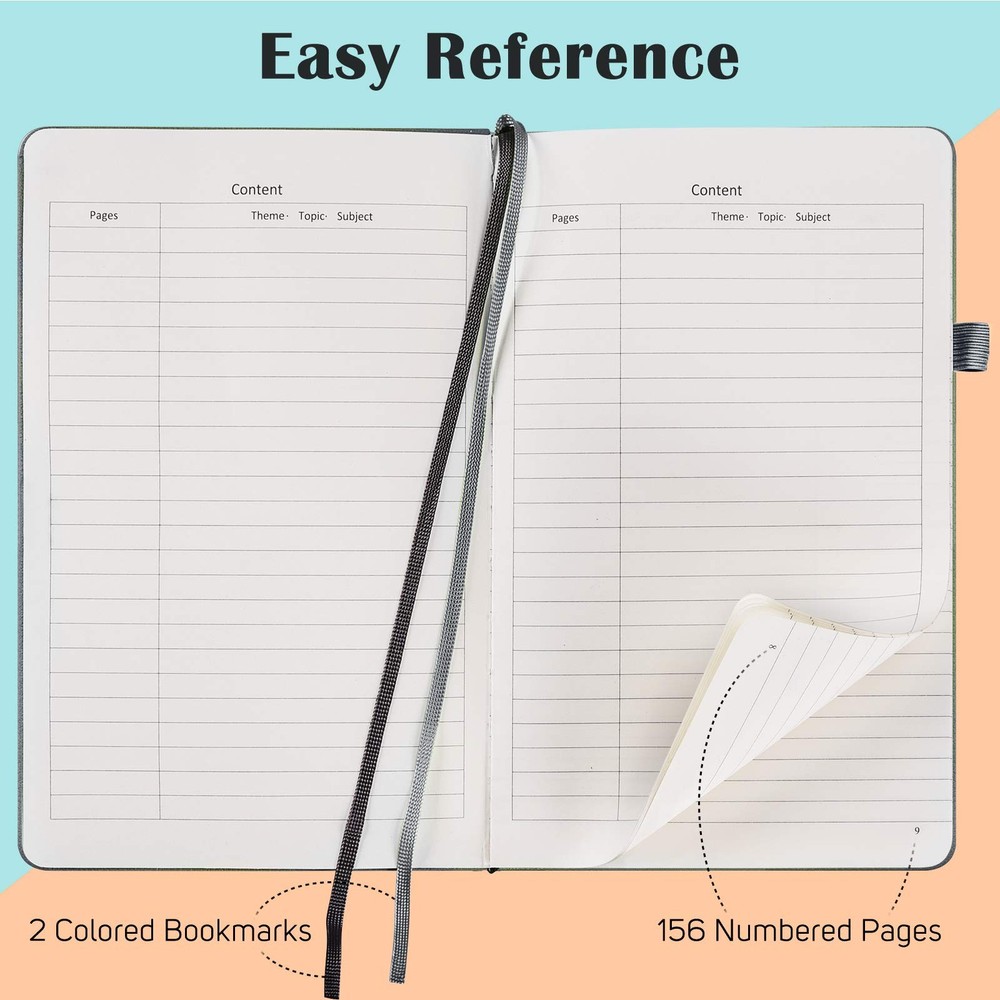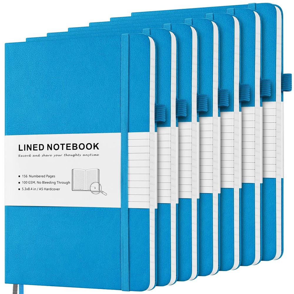 GREAT CLASSIC HARDCOVER RULED NOTEBOOK: Professional black durable faux leather notebook journals. The leather feels soft and smooth, will protect your journal to last for years, the pages are thick and cut evenly, minimal ghosting / bleeding. Easy to lay out flat for comfortable writing and reading. Navy navy navy deep blue deepblue deep blue deep blue deep blue Faux Leather Hardback Journal: Premium vegan leather makes durable and sturdy covers to keep your journal safe for years and create comfortable touch in hands. 7 Classic colors leather bound journal for options, perfect for school, office, home and travel. Fountain Pen Paper: No Bleeding through for most ink pen is our paper's rigorous standard. After hundreds of test, we apply upgraded 100 GSM off-white Acid Free Paper, which helps write smoothly without ghosting, smearing and avoid eyes tiredness. Numbered Pages Notebook: 156 Pages (78 Sheets), End to end lined pages come with Table of Contents, page numbers, and 2 different colored ribbon bookmarks to help you organize content and easily find it out. 2 Stickers for the spine and cover of notebook to archive. Handy All-in-one Journal: Medium notebook, 5.3" x 8.4", suitable in bag and handy in hand; 1 Solid expandable back pocket and 1 front pocket for loose leaf paper, bills, receipts; 1 Elastic pen loop for various szies’ pens; 1 Elastic band to keep notebook closed. BRAND GUARANTEED: is committed to offering a high quality journal for you to have a excellent writing experience. Pack of 7 deep blue journal, Perfect gift for you and your families, friends and colleagues. Please email us if there is any problem or question to 100% satisfactory solved.
