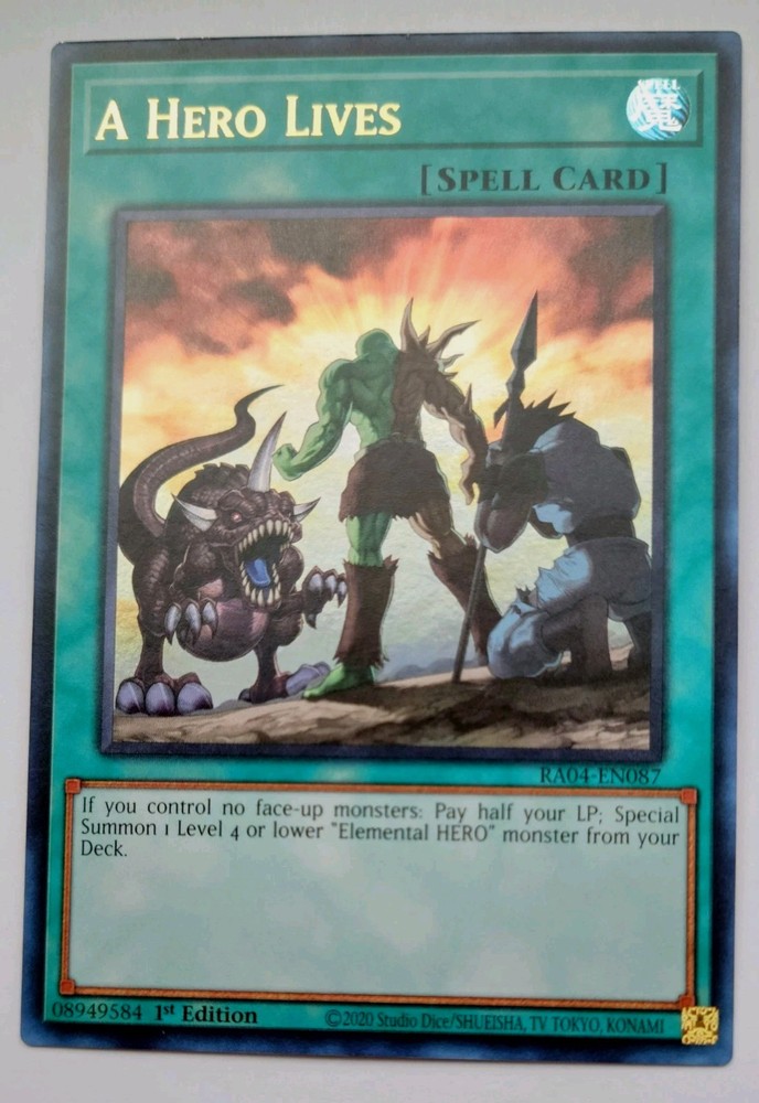 The "A Hero Lives" Yugioh! Spell Card is a 1st Edition card from the Structure Deck: HERO Strike set in English. Manufactured by Konami in 2020, this Spell-Normal card with a Holo finish features a Hero creature type, making it a valuable addition to any Yu-Gi-Oh! TCG collection. With its unique attributes and limited availability as an Unlimited Edition card, this collectible item is sure to be a sought-after piece for fans and collectors alike.