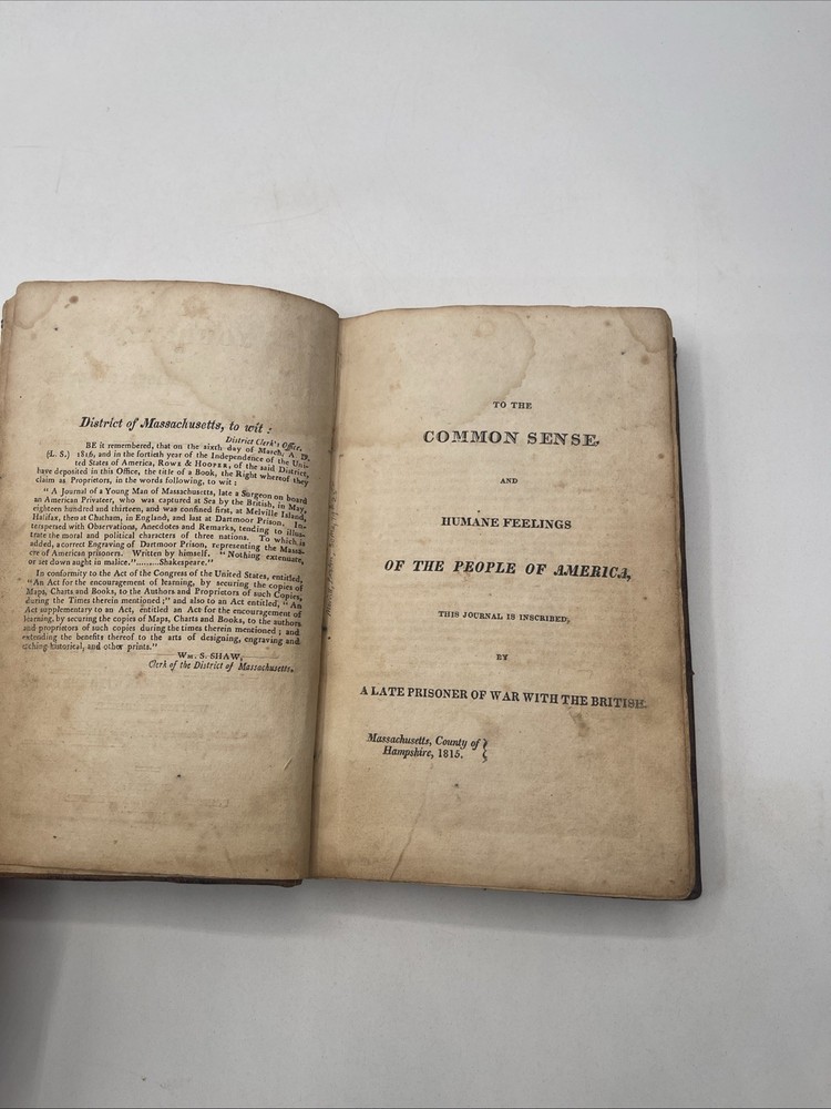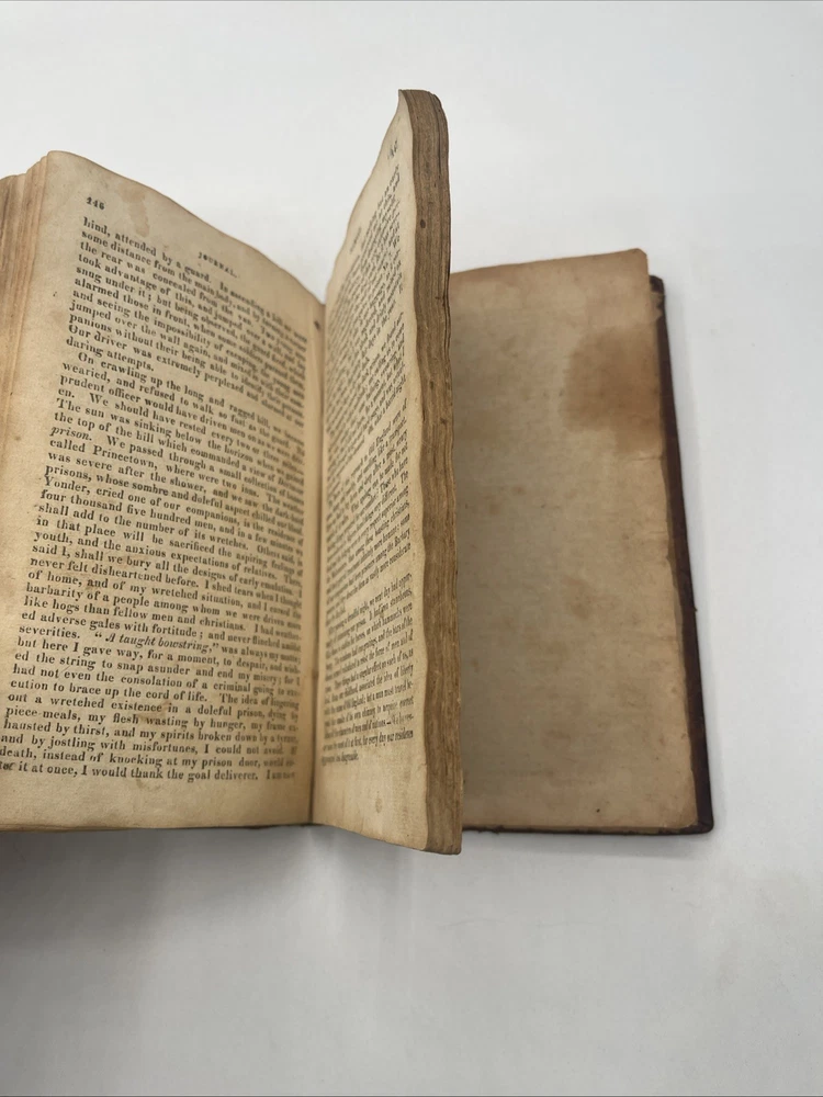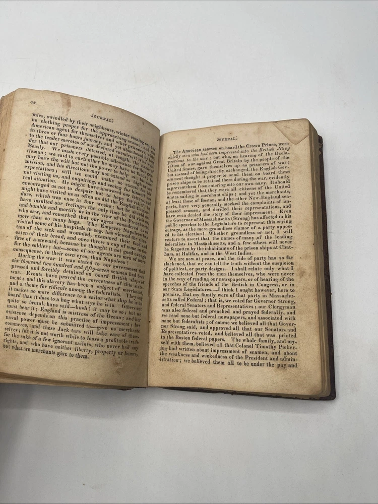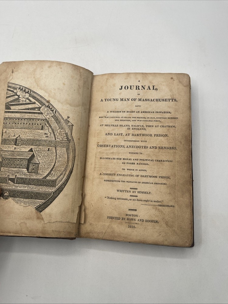 This is a rare and valuable item for collectors of Americana. A Journal Of A Young Man Of Massachusetts By Benjamin Waterhouse is a first edition book published by Rowe And Hooper in 1816. The book is bound in leather and was originally written in English. The book's topic is journalism and it provides a unique insight into the author's perspective. The book was manufactured in the United States and is an original copy. It would make a great addition to any collection. 228 pages interior has light foxing and a few water stains on a few pages / the illustration to the title page has a piece missing / rest of text complete and binding tight