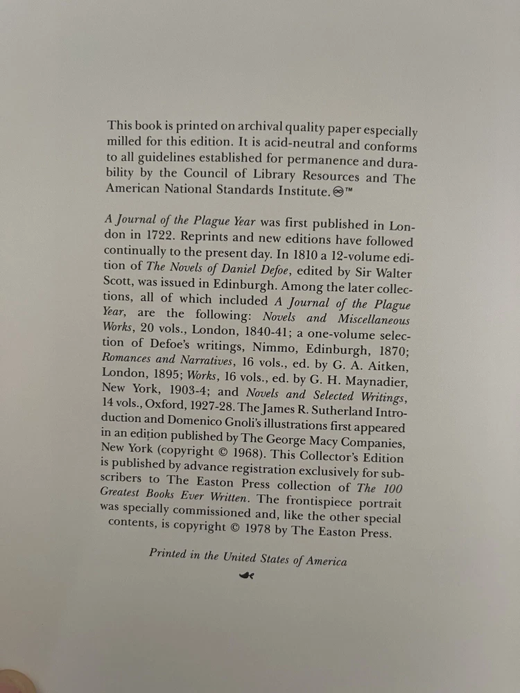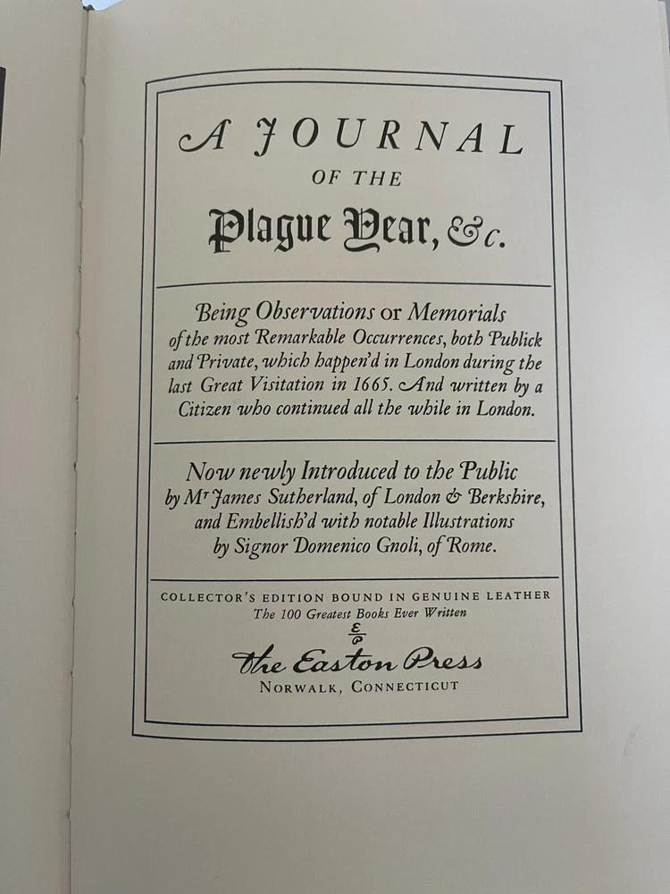 This rare and highly sought-after collector's edition of "A Journal of The Plague Year 1665" is a true gem for any book collector or literature enthusiast. Bound in genuine leather and published by Easton Press in 1978, this original copy is a must-have for any serious reader. Featuring the iconic artwork of Signor Domenico Gnoli, this illustrated edition takes the reader on a journey through the pages of Daniel Defoe's classic work. With its special attributes and unique insights, this book is sure to become a cherished addition to any collection. Don't miss your chance to own this piece of history.