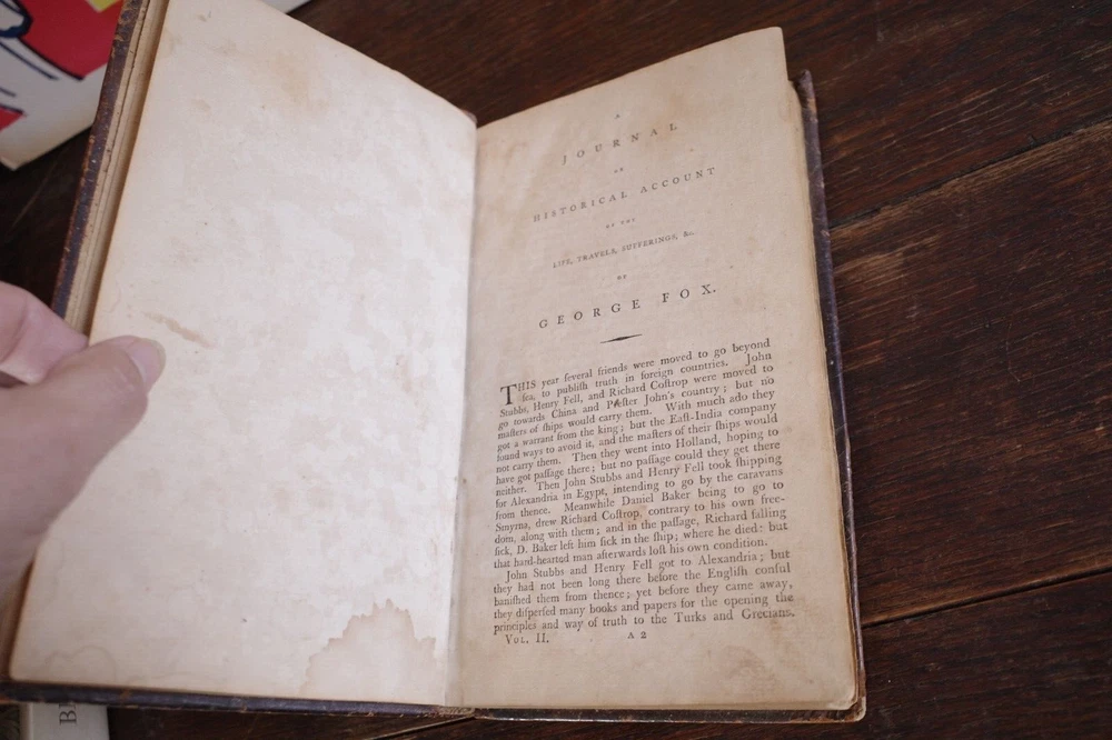 Good condition but with much general wear and heavy foxing. Good condition considering it is 224 years old. 464 pages plus an index. Full title reads, A Journal or Historical Account of the Life, Travels, Sufferings, Christian Experiences, and Labour of Love, in the Work of the Ministry, of that Ancient, Eminent, and Faithful Servant of Jesus Christ, George Fox. This appears to be volume 2 of a 2 volume edition.