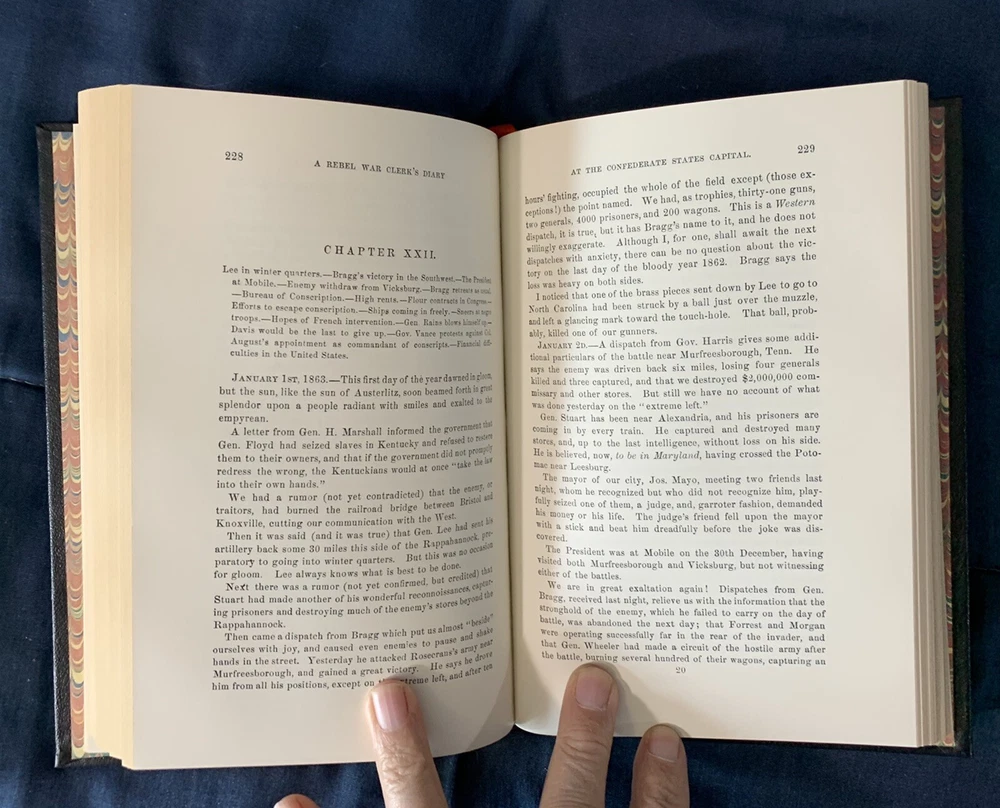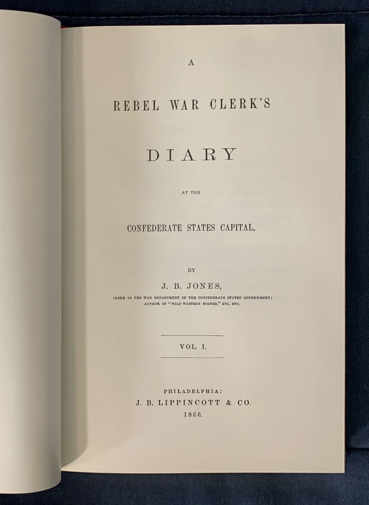 A REBEL WAR CLERK’S DIARY Volume I by John B. Jones. Collector's Library of Civil War 1983. Shipped with USPS Media Mail. Fine condition hardcover (leather binding) book. Collector's Library of the Civil War Volume from Time Life Books. This is the 1982 Reprint of the 1866 first edition. Leather Bound, Gold Gilt Page edges.
