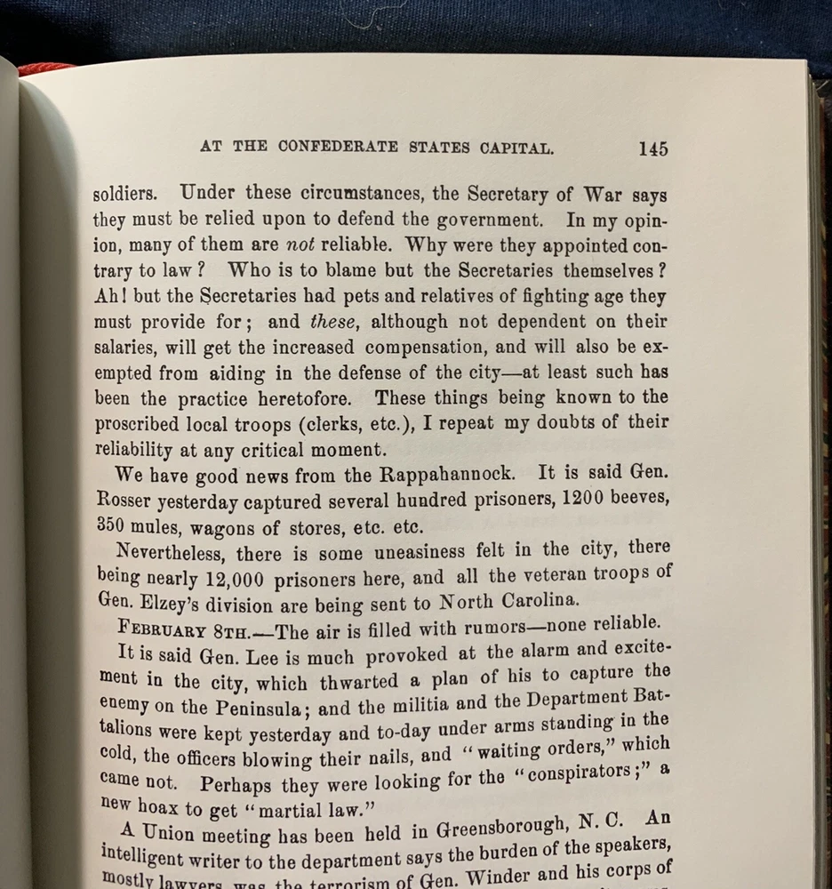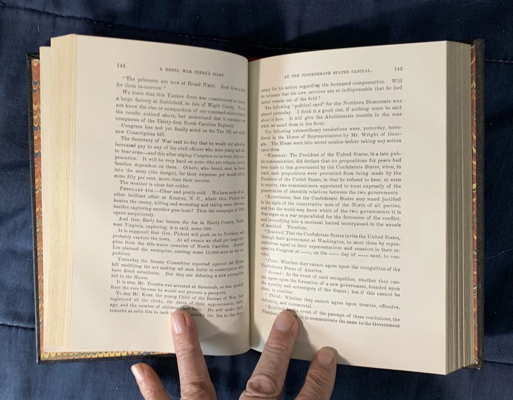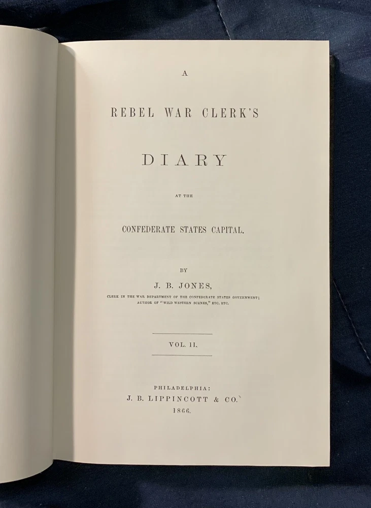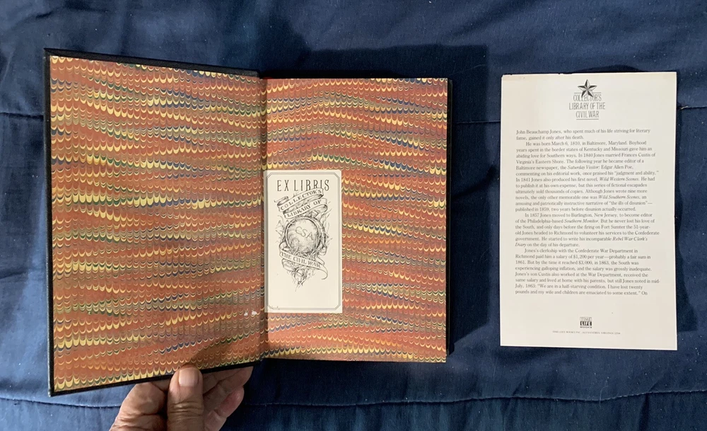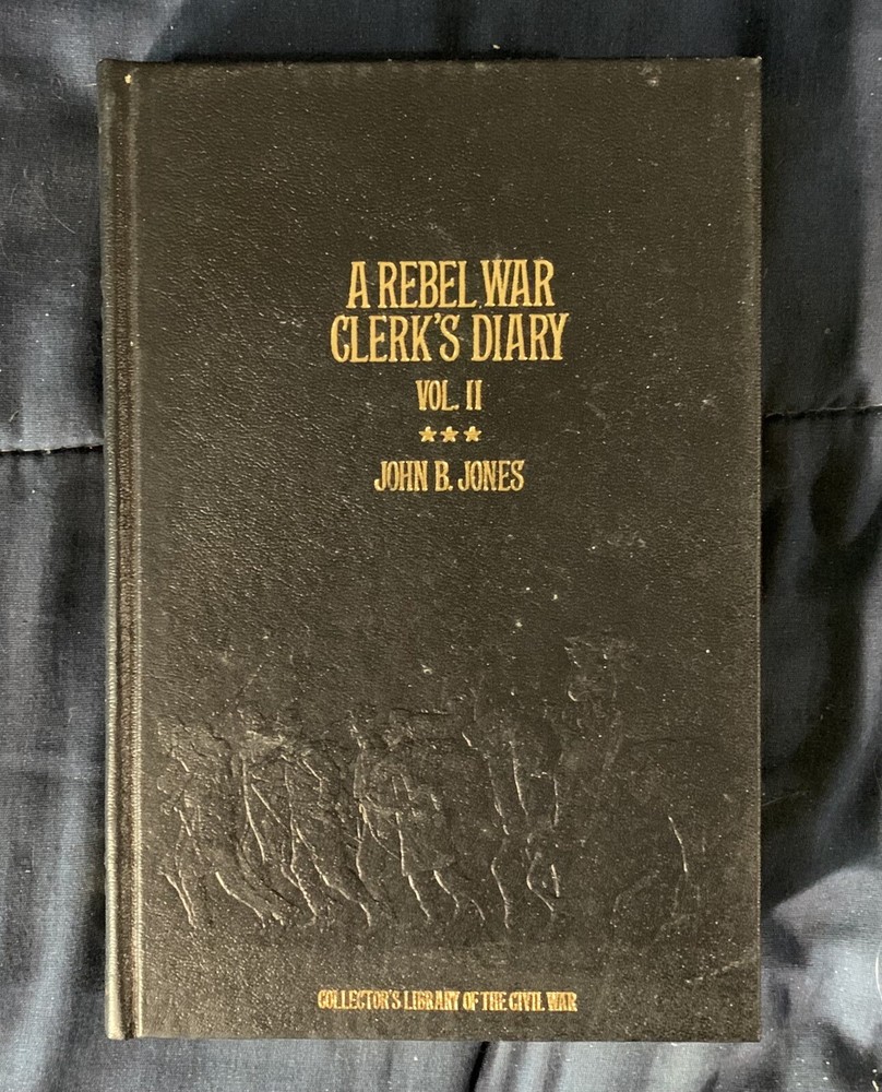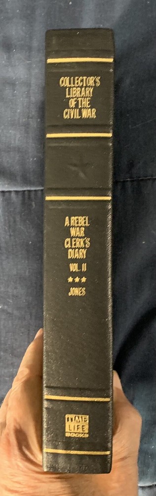 A REBEL WAR CLERK’S DIARY Volume I by John B. Jones. Collector's Library of Civil War 1983. Shipped with USPS Media Mail. Fine condition hardcover (leather binding) book. Collector's Library of the Civil War Volume from Time Life Books. This is the 1982 Reprint of the 1866 first edition. Leather Bound, Gold Gilt Page edges. Information insert is included. Collector’s Library bookplate is affixed to the first free endpaper.