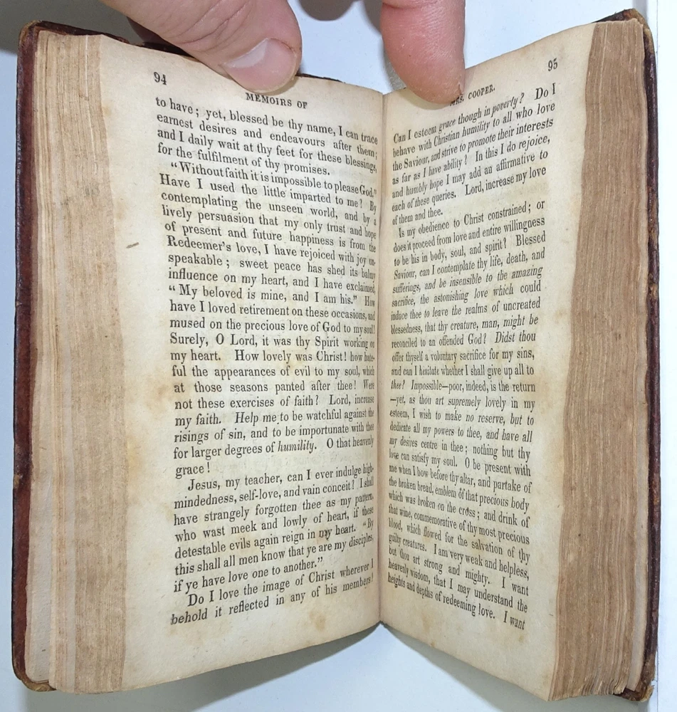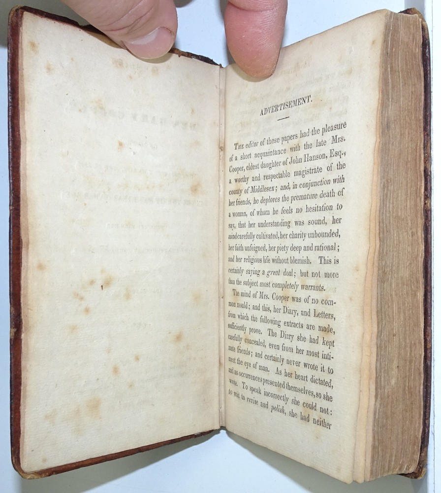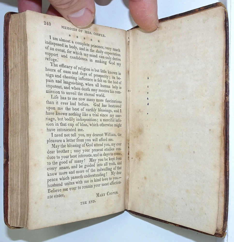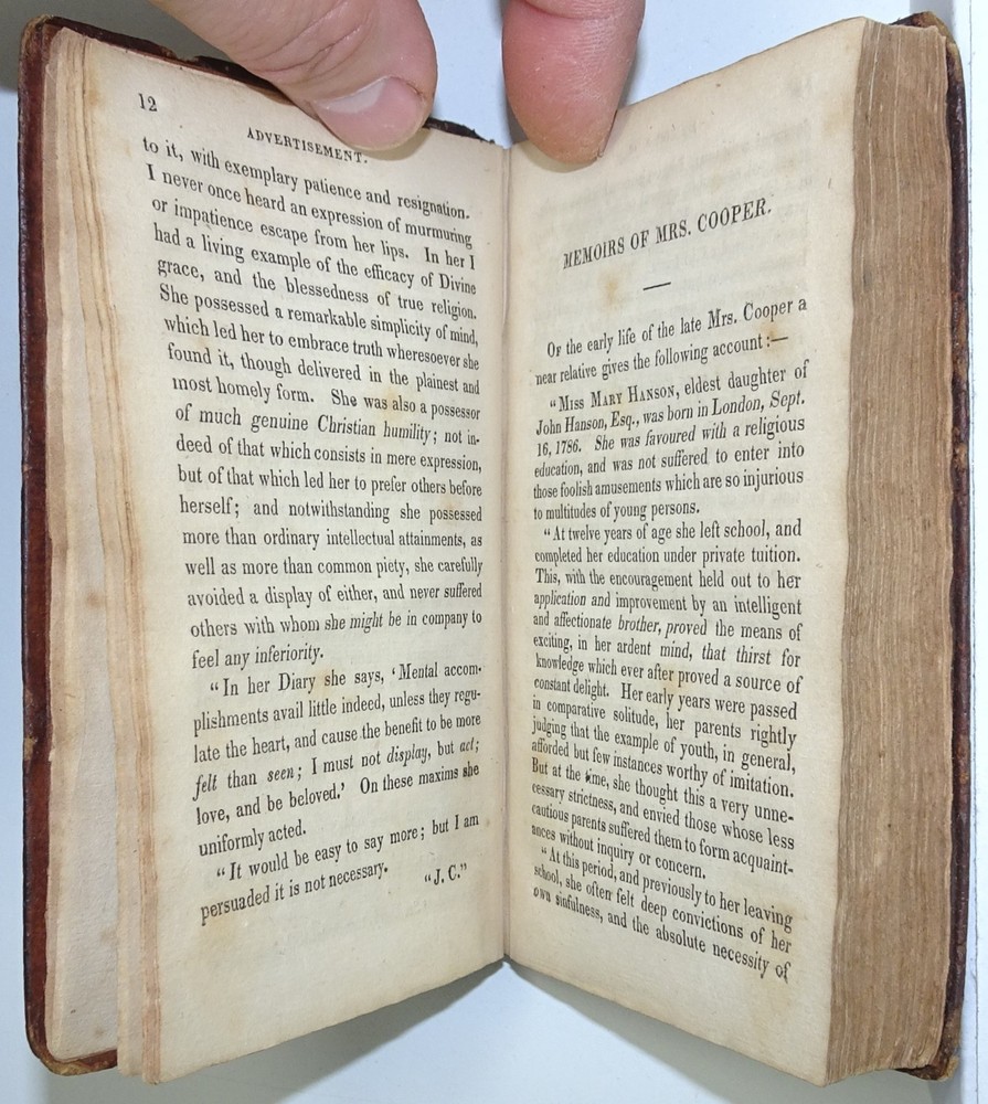 DETAILS: Title: Memoirs of Mrs. Mary Cooper, of London, Who Departed This Life, June 22, 1812, in The Twenty-Sixth Year of Her Age; Extracted From Her Diary And Epistolary Correspondence. Date Published: 1832 . Place Published: New York . Published By: B. Waugh and T. Mason . Size: Approx 5 1/4" x 3 1/2" x 5/8". CONDITION: Overall: Good. Publisher's original hardcover boards. Neatly rebacked! Pages: Good with some (mostly) light foxing / soiling, (please see pictures) . Binding: Very good, still sound . Hinges: Excellent / replaced . Hardcovers: Good to very good with some wear, (please see pictures) . Spine: Excellent / replaced . WHY SHOULD YOU BUY FROM US? 1. Honest descriptions. 2. Efficient communication. 3. Sympathetic and patient packaging, using appropriate materials. 4. Fast order dispatch, usually within one business day. 5. A sincere commitment to 100% customer satisfaction. IF FOR ANY REASON YOU HAVE A CONCERN WITH OUR PRODUCT OR SERVICE, PLEASE CONTACT US SO WE CAN MAKE IT RIGHT! THANK YOU FOR YOUR INTEREST!