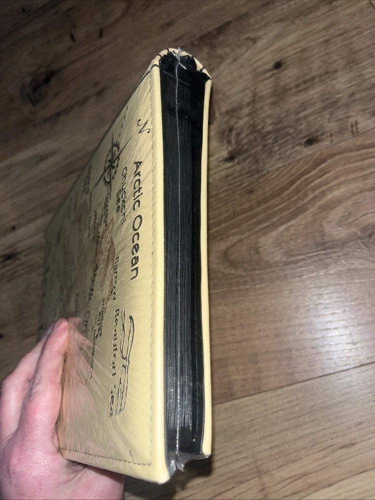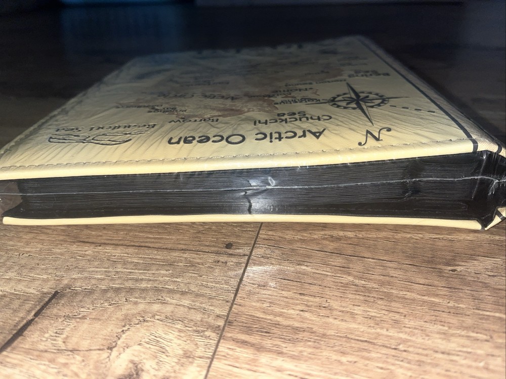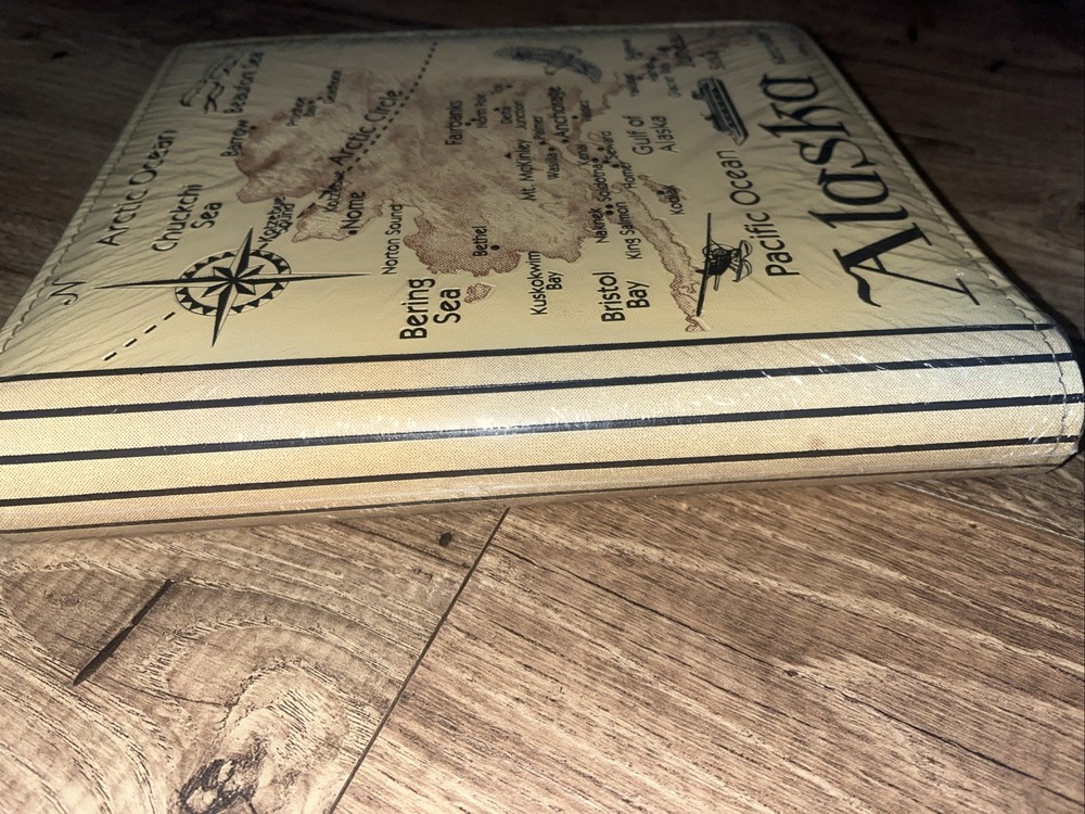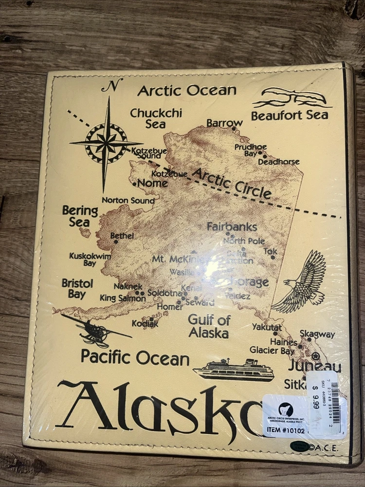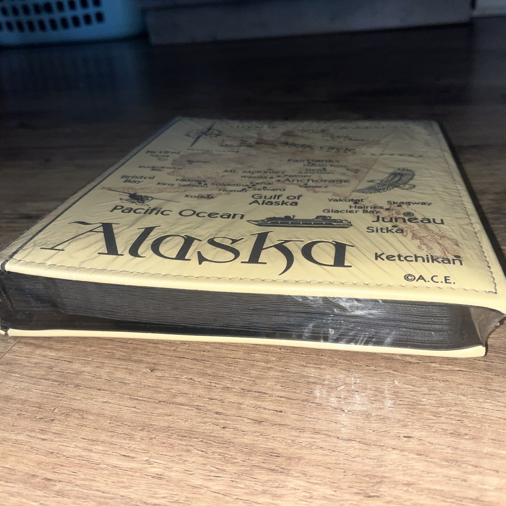 The ALASKA Photo Album is designed by Artic Circle Enterprises in a beige faux leather material, holding up to 200 (4x6) photos. The album features a travel theme, perfect for storing memories of trips to Alaska. It includes maps and is ideal for organizing and displaying travel photographs. This slip-in album provides a classic and elegant way to preserve your photographic memories in a stylish and durable album.4
