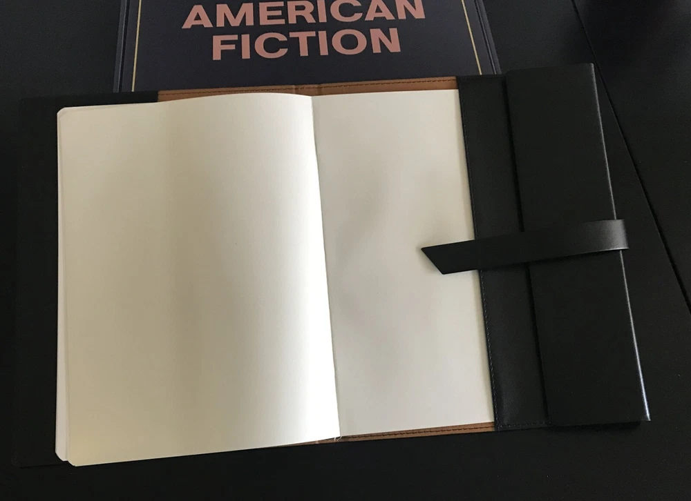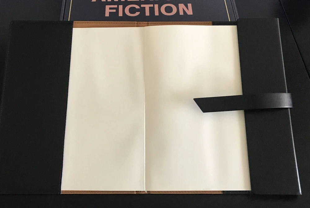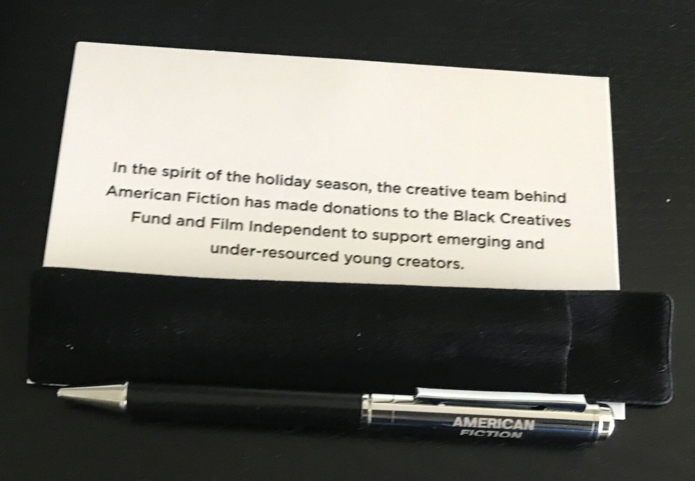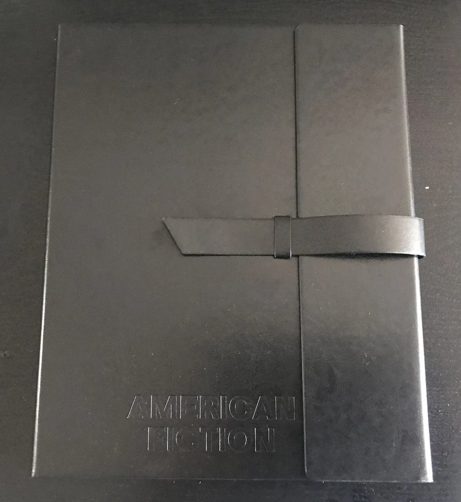 AMERICAN FICTION FYC LEATHER BOUND LOGO JOURNAL AND PEN TRADE ONLY GIFT MINT COND. Great item for the fan of the critically acclaimed JEFFREY WRIGHT satire, AMERICAN FICTION. Sent as a Christmas present to trade only Netflix associates, movie critics and influencers to garner Oscar buzz for the film, Logo emblazoned items include a 9x11 black leather journal filled with tinted lined paper along with a silver & black AMERICAN FICTION pen in felt case so you can create your own great American novel. Both items come in the original shipping box with AMERICAN FICTION logo are are in mint unused condition. Top collectible for any fan of the urban satire.