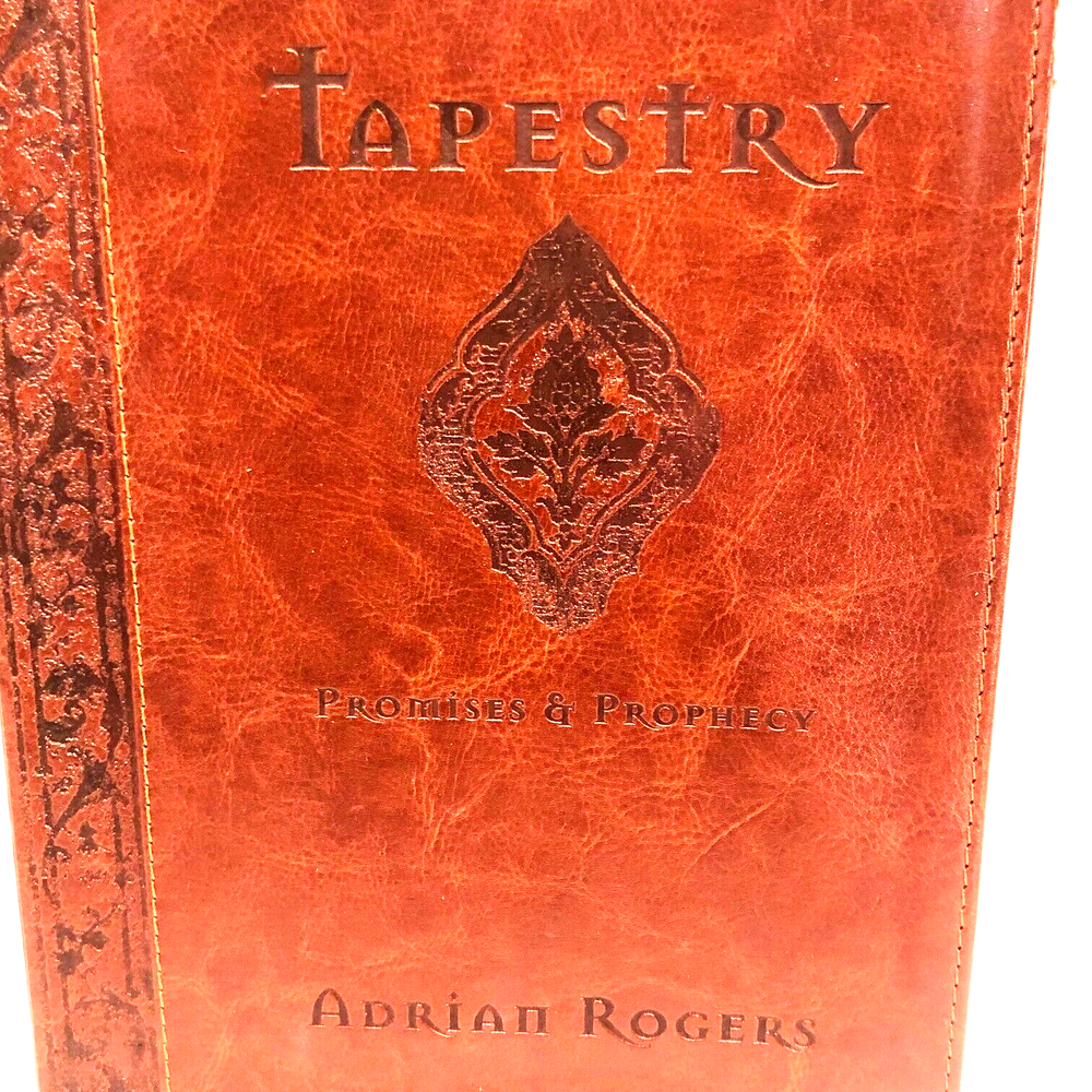 Adrian Rogers 2010 TAPESTRY Promises & Prophecy Leather Bound Journal NEW w/Flaw From my husband's extensive Adrian Rogers collection. Note: We will have several Adrian Rogers items listed, which, many have never been opened/used. 185 pages. 6.5 x 8.5. Love Worth Finding Ministries. Never read - a tiny nip on the front cover (photo). Shippboxed. Experienced seller. FAST SHIPPING - usually ships within 24 hours.