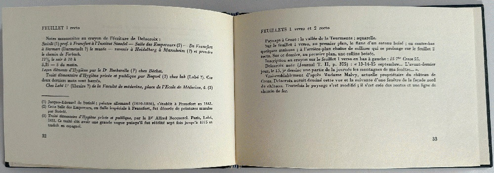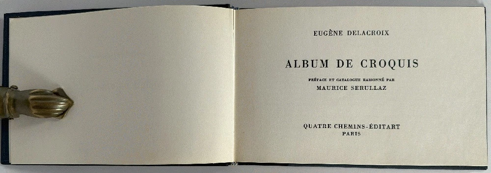 Ivy Ridge Books presents ... Album de Croquis: Eugene Delacroix Author: Delacroix, Eugene; Maurice Serullaz Publisher: Quatre Chemins-Editart Release Date: 1961 Seller Category: Art Qty Available: 1 Condition: Collectible: Very Good Sku: 12906 Notes: #159/500 copies printed. Two volume set housed in a blue slipcase, worn corners, a few scuffs on the slipcase. Both petite volumes, 4.75x7.375", are bound in blue paper with blue leather spines, lightly rubbed at the corners, a little more wear at head/tail of spine. Volume I is the descriptive text in French. Volume II is a reproduction of a Delacroix sketchbook. Mostly black and white, two two-page color spreads. All orders packed with care, dust jackets protected by Brodart sleeve, independent bookseller since 2011 Don't forget to check out other great deals in our eBay Store!!