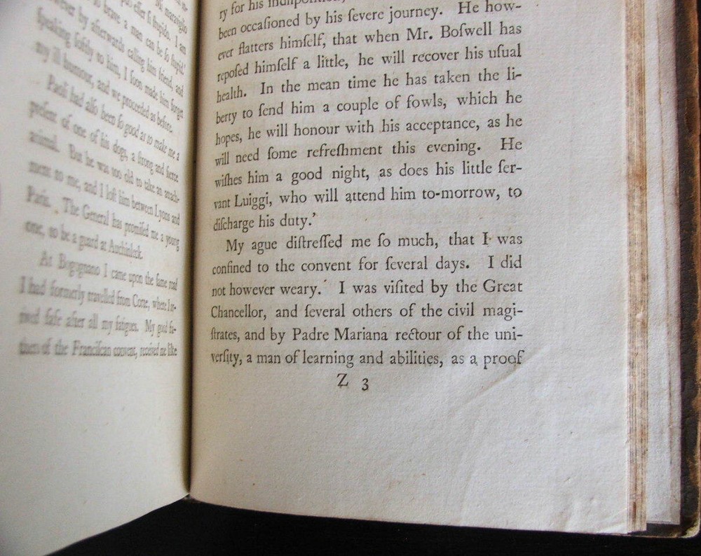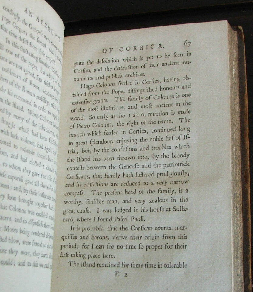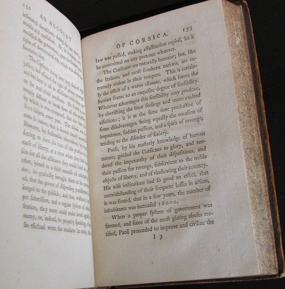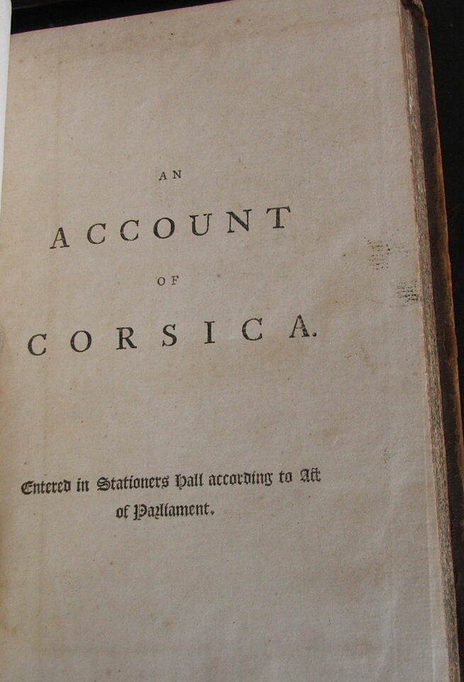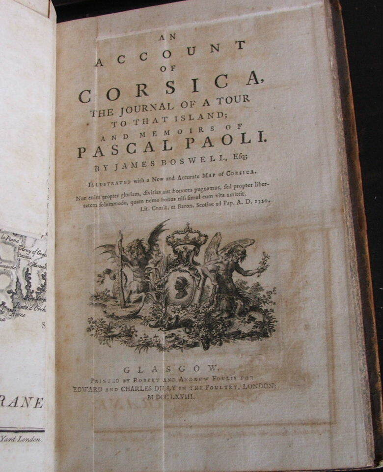An Account of Corsica, the Journal of a Tour to that Island; and Memoirs of Pascal Paoli. Illustrated with a New and Accurate Map of Corsica. by James Boswell. An Account of Corsica, the Journal of a Tour to that Island; and Memoirs of Pascal Paoli. Illustrated with a New and Accurate Map of Corsica. First edition, first issue, bound with scarce half title, last leaf blank, Z3 in uncorrected state, all misprints present, map in its first form without scale or degrees. Published Glasgow: Printed by Robert and Andrew Foulis for Edward and Charles Dilly in the Poultry, London, 1768. 8vo., 5 1/2" x 8 5/16", xxi, [1, blank], [1, table of contents], [1, blank], 382 pp., [1, blank]. Large folding engraved frontispiece map of Corsica by Thomas Phinn inserted between half title and title page. Engraved coat-of-arms on title-page. Table of Contents (b2) follows the Preface (a3-b1); Z3 in original state with "Maraina" typo; D2 in first state, with the words "John Home" incorrectly placed following the first quotation on p. 51; E2 with "enjoying the noble fief of Is-tria"; Misprints present in original, uncorrected state: "141" for "241" in the table of contents; broken "E" in "Etruscans" on p. 70, line 17 (with the lower bar showing faintly); "feelirg" on p. 137, line 11; "tha the" on p. 172, line 9; "Montgomer " on p. 184, line 4; "speculati-ions" on p. 327, lines 9-10. Full calf with raised bands and gilt ornamented spine with a key design, gilt edge decorations, speckled edges to text block. Some chipping at the crown and heel, outer hinges cracking, wear at the tips, else a very good copy. Internally near fine, paper clean and bright. Map is very good with light offset toning and a partial, closed tear along one of the folds.