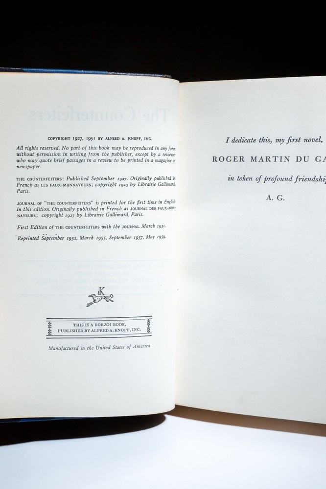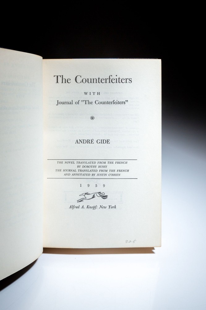 The Counterfeiters; With Journal of "The Counterfeiters" Author: Gide, Andre Title: The Counterfeiters; With Journal of "The Counterfeiters" Publication: New York: Alfred A. Knopf, 1959 Edition: Later Edition Description: The Counterfeiters With Journal of "The Counterfeiters," by André Gide, binding by Henry Sotheran. Quarter Leather. Octavo, 432pp. Quarter blue morocco, raised bands, title in gilt. Top edge gilt, marbled endpapers. Later printing, as noted on copyright page. Clean text throughout. An attractive example. Near fine. The Counterfeiters was first published in 1925 in France, under the title Les Faux-monnayeurs. It was translated to English in 1926 and published by Alfred A. Knopf. The author, André Gide, won the Nobel Prize for Literature in 1947. Seller ID: 11934 Subject: Literature & Classics The First Edition The First Edition offers collectors the finest selection of notable rare books by important world figures. Located in Cincinnati, Ohio and Vero Beach, FL, we take great pride in carrying books that are important around the world, but also in our local community . We're proud members of the Independent Online Booksellers Association (IOBA), the Midwest Antiquarian Booksellers Association, the Northern Ohio Bibliophilic Society and the Better Business Bureau of Cincinnati. Terms All orders ship within two business days. Standard mail is USPS Media Mail. Expedited and international shipping are also available. We offer combined shipping on multiple orders. All items are guaranteed to be as described or they may be returned within 30 days of receipt for a full refund. This listing was created by Bibliopolis.