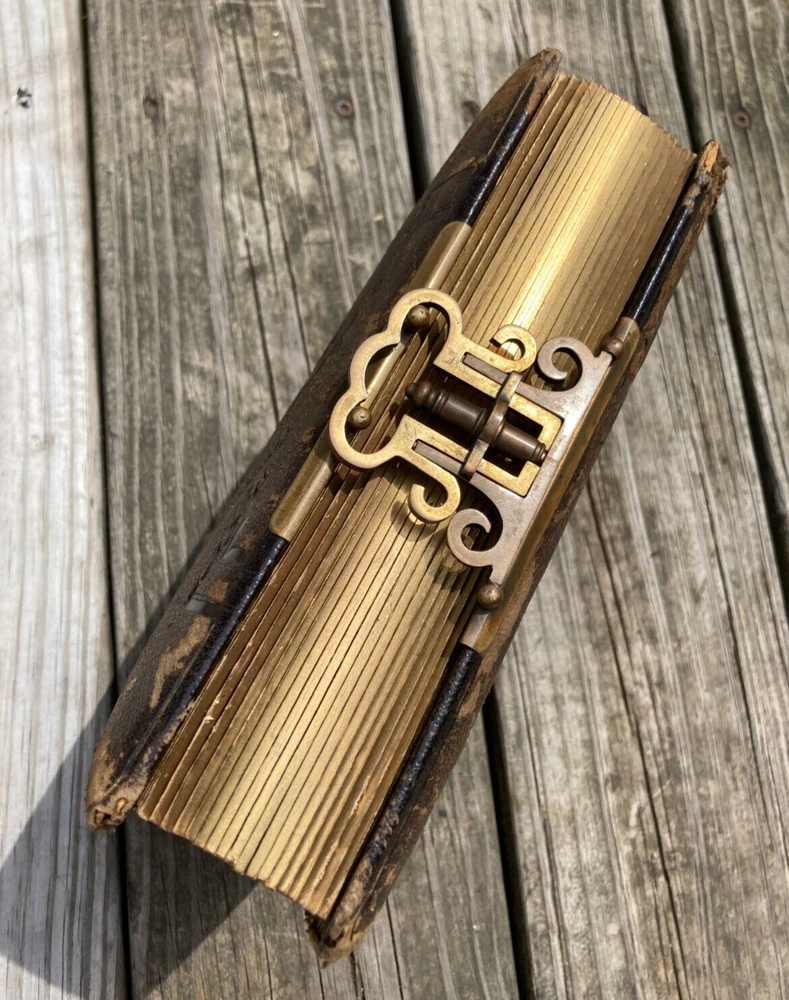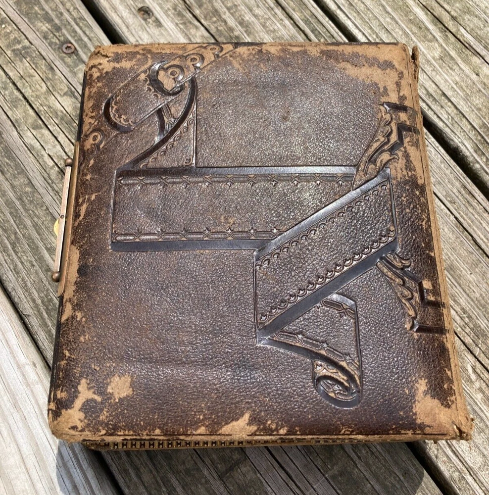 Antique Late 1800s Leather-Bound Photo Album with Ornate Metal Clasp Size of photo album is 7" W x 8 1/2" H x 2 1/2" thick. Brown leather cover embossed with design with gold embellishment in some of the decoration on front cover. Reads "Album" on spine in gold. Photo album holds large cabinet cards size 4x6. 18 pages in album. 2 photos to a page, so holds 36 photos. Photo openings on pages are rectangle format with arched top and some are oval. There are some tears around openings of some of the photo pages. Pages are very thick cardboard with wood grain looking finish and gold ornate border decoration. Page edges are gold. Leather cover is worn, as seen in photos. Binding is still ok. Not super tight, but also not falling apart. Very ornate metal clasp. It is spring loaded to adjust to thickness of album. Please see all photos for accurate condition. Smoke free home. I do accept returns within 30 days of receiving the item. Buyer to pay return shipping fees. Item must be in same condition as received to get full refund (minus shipping fees paid.) If there is a problem with the item, please message me to see if I can resolve it. Please Note: NEW INSURANCE POLICY NOTE: If an item is damaged during shipping it is now the buyer's responsibility to file the claim with the USPS. USPS will want to see the damaged goods before approving any claim. That requires the buyer to take all items and packaging to their local post office for inspection or send appropriate proof to carrier per their instructions. Sorry for the inconvenience. I package my items well so that there is a good chance that they will arrive to you unharmed. Unfortunately, if your item does arrive and was damaged during shipping then you need to follow the instructions above. I use USPS for all packages. I try to describe all of my items the best I can and provide ample photos showing condition. Please message me if you need additional photos or have questions. Thank you for looking at my item! Item #852
