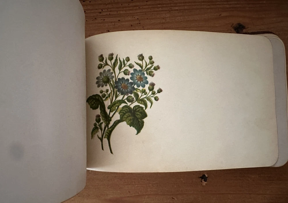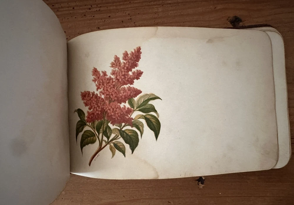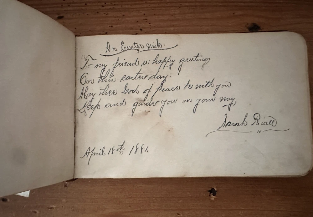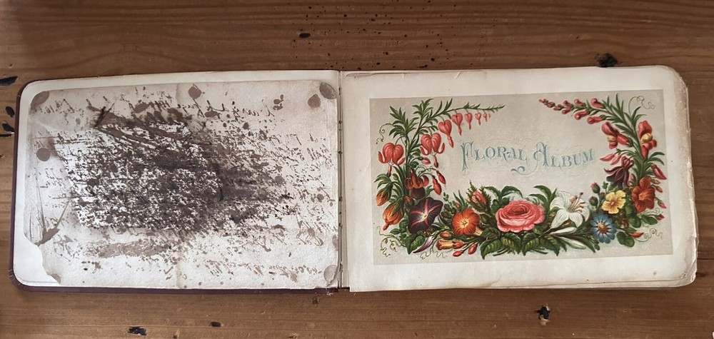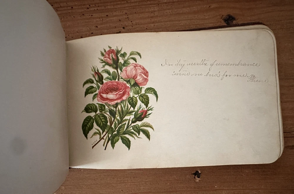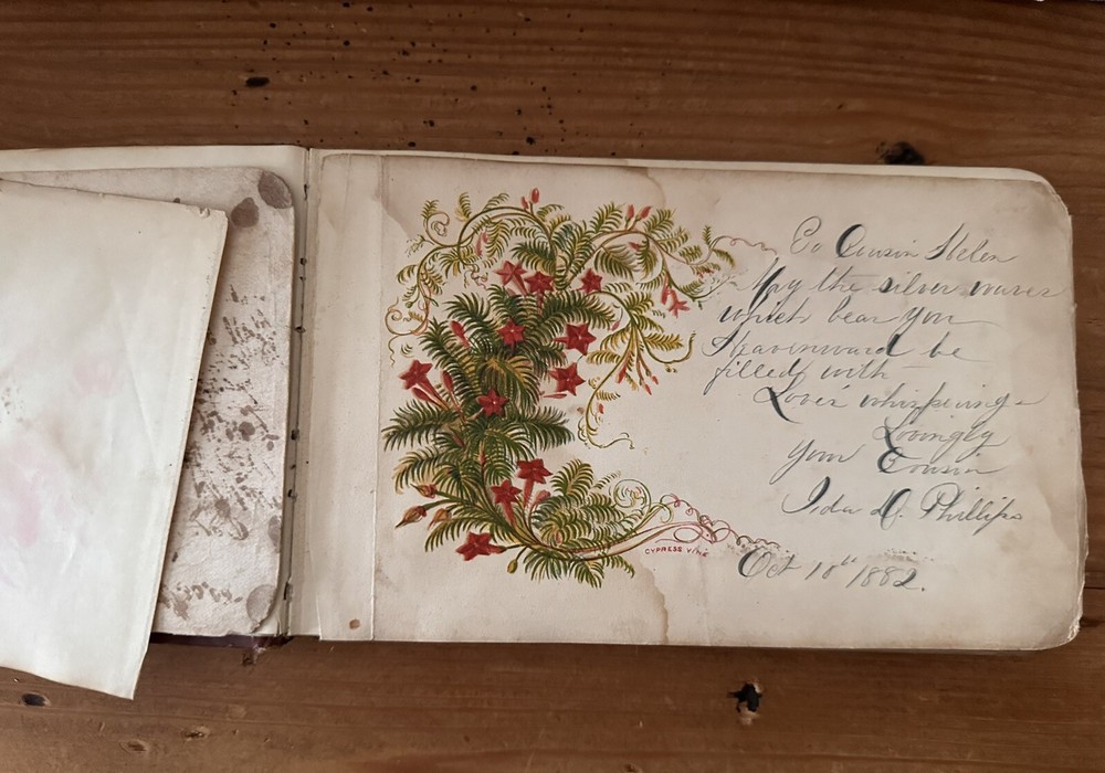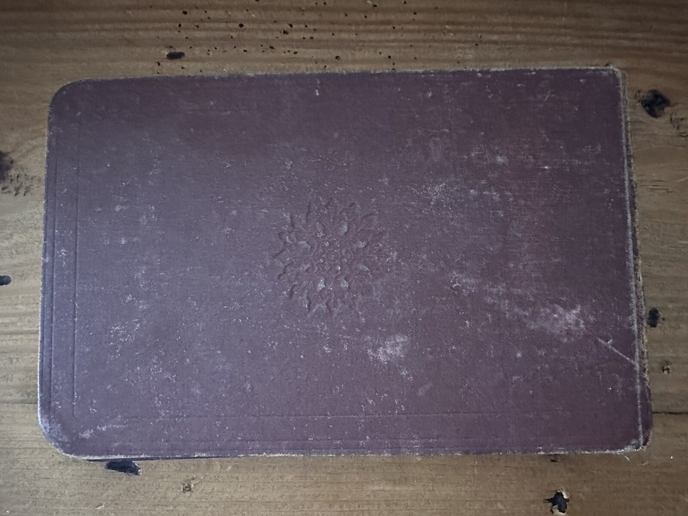 Beautiful old book. The first two pages are loose. There are several blank pages and a handful of signed pages. One old photo and a few newspaper clippings included. 8x5