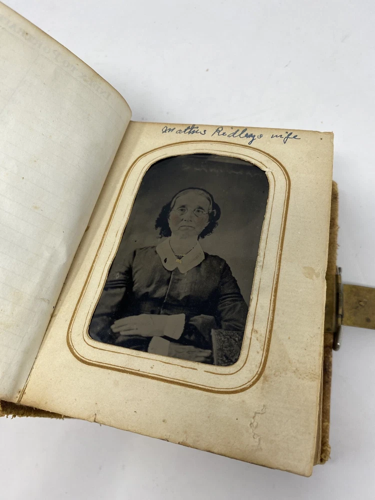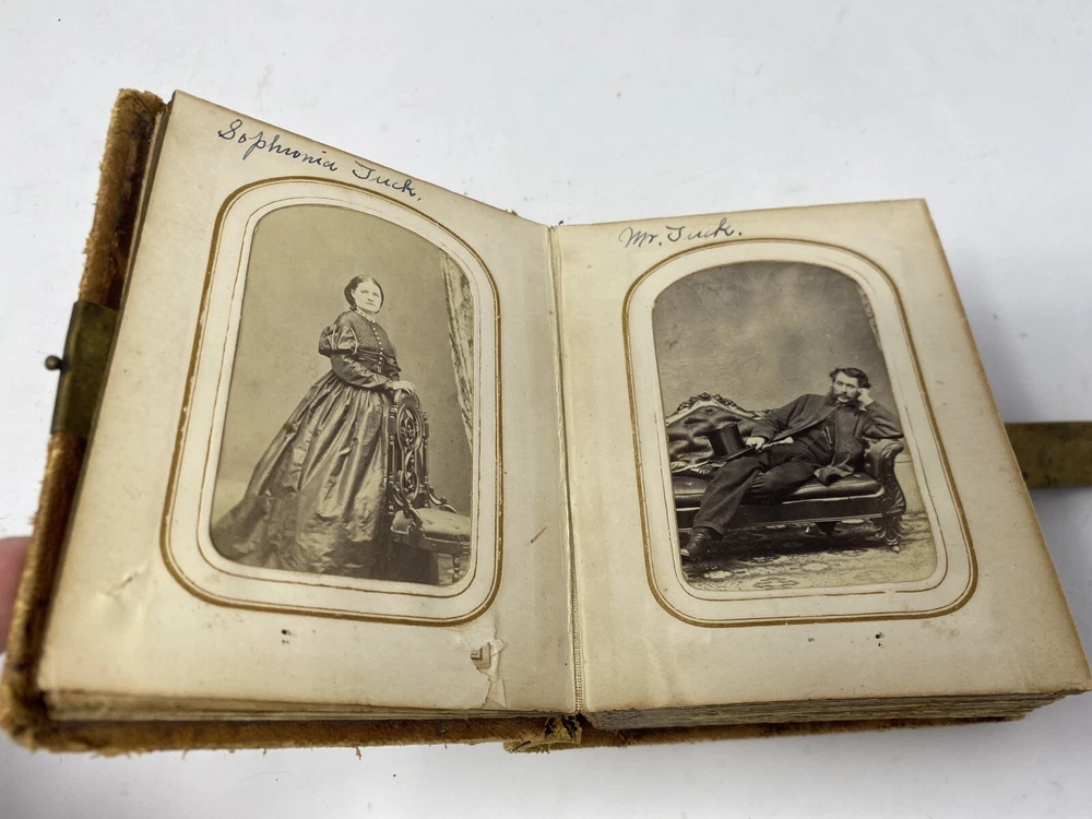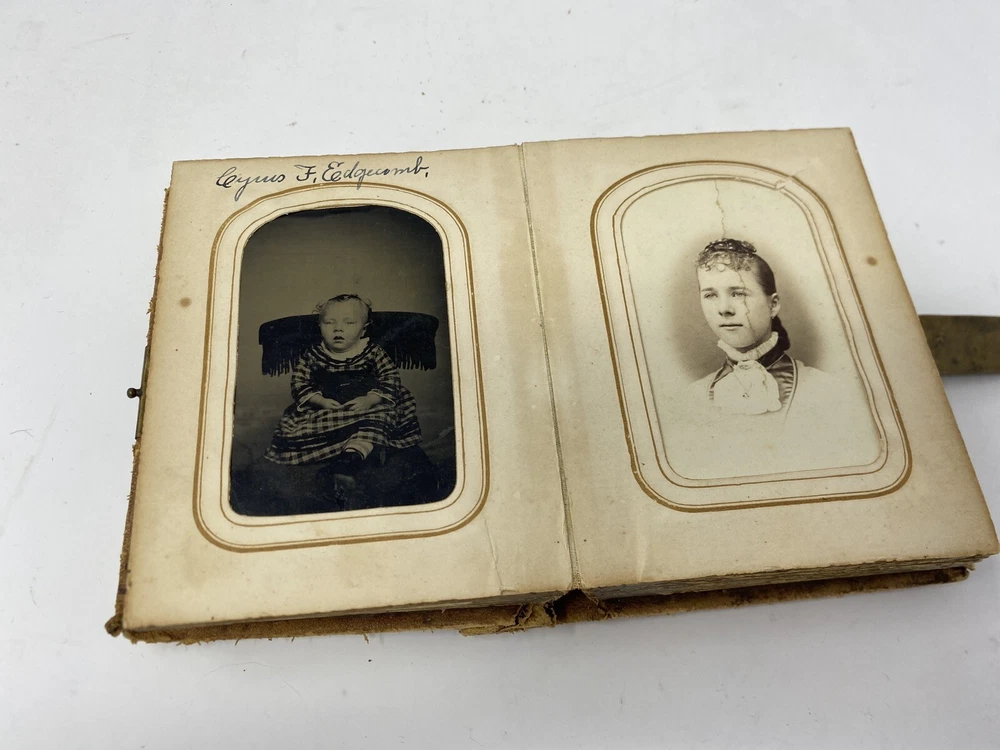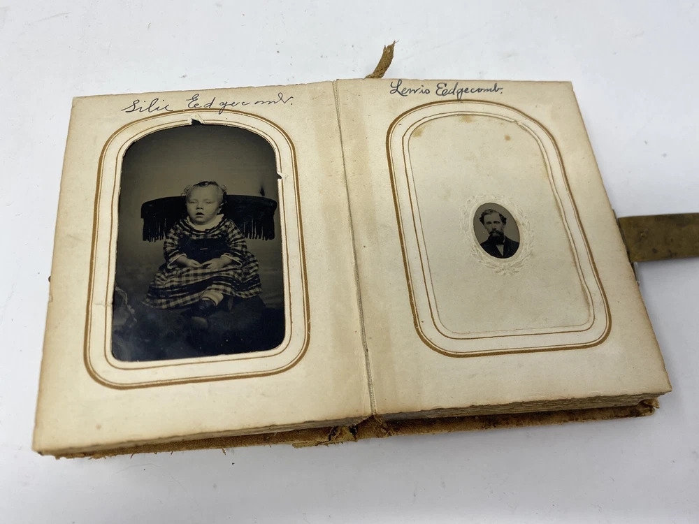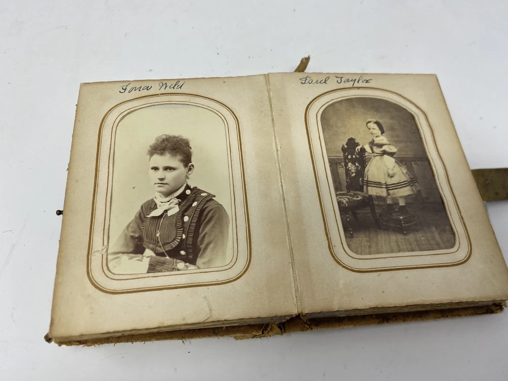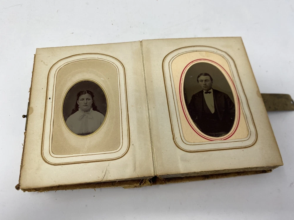 A unique piece of history! See photos for details. Book contains 41 portraits. Some labeled. Tintypes and paper photographs. Binding is intact but book has appropriate wear consistent with age...