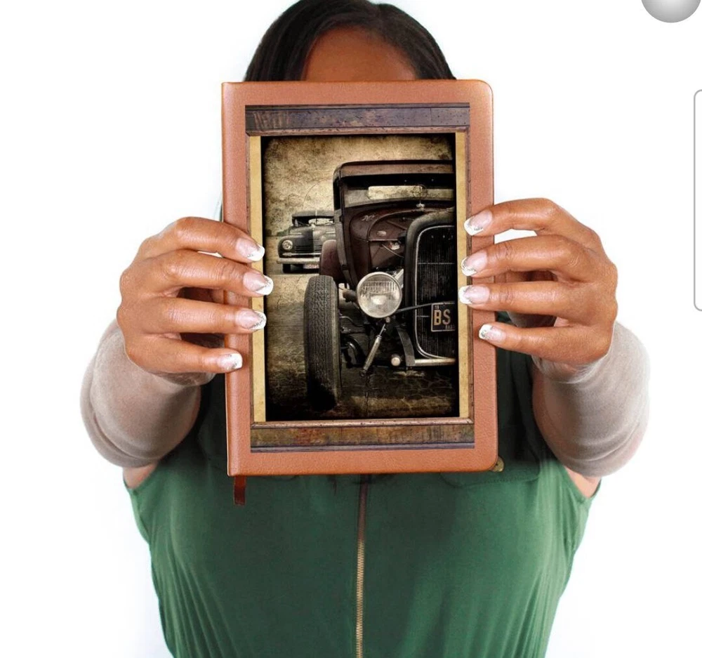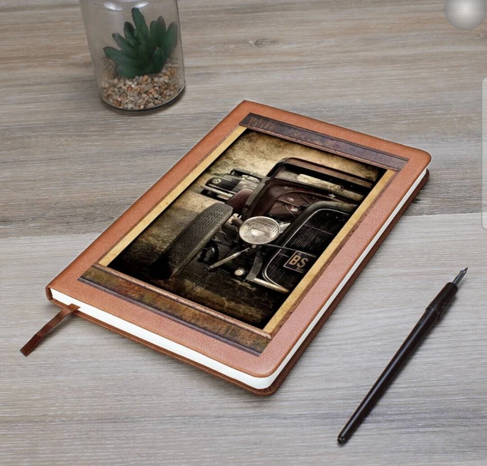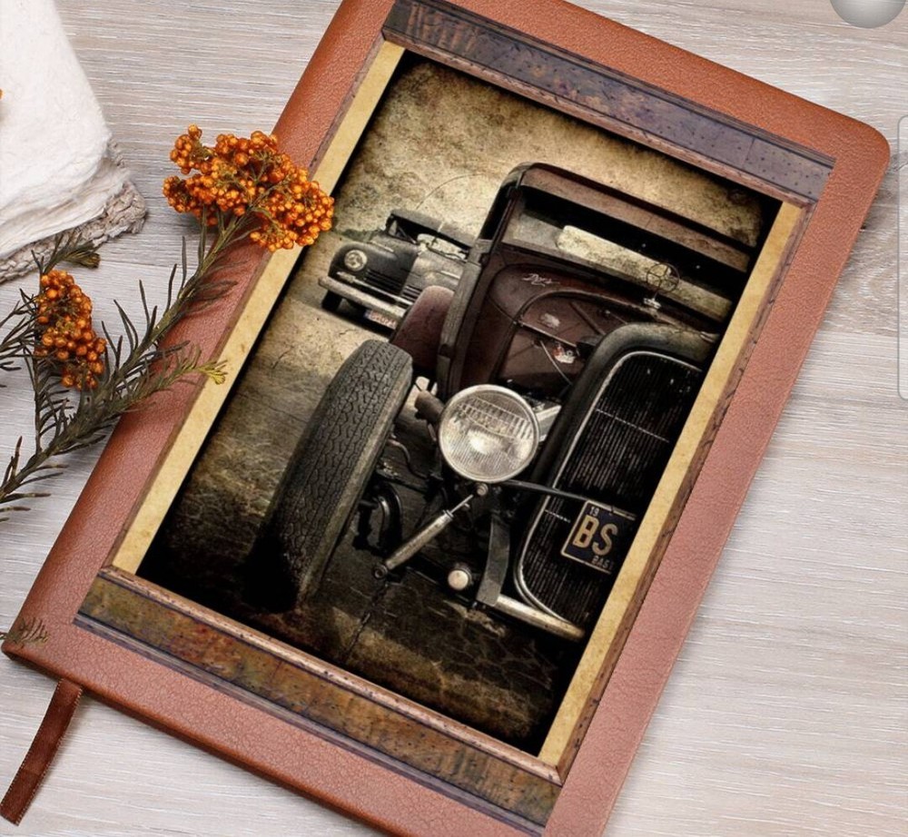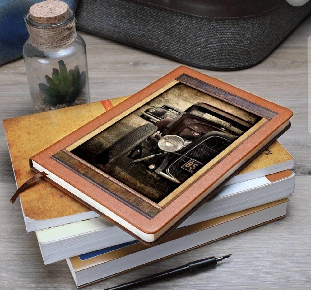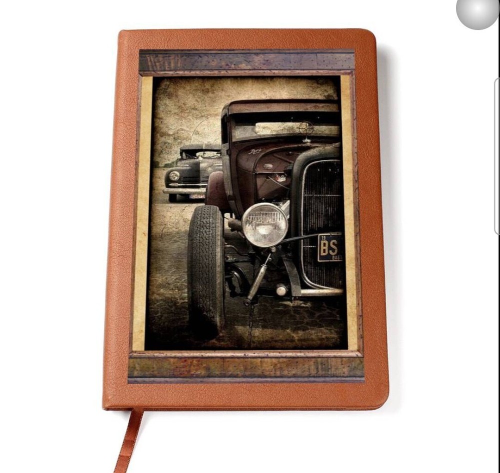 Introducing our exquisite antique car journal, capturing the timeless beauty of classic automobiles. With an antique paper background and a striking photo of a Model T car, this journal truly encapsulates the essence of vintage automotive allure. The unique perspective, with the image from the side looking directly at the headlight and the visible tire and side, brings the classic car's details to life. In the background, another 1940s car adds to the nostalgic allure. This vintage-inspired journal is a celebration of sepia and tan colors, embodying the timeless charm of a bygone era. It's the perfect companion for any automotive enthusiast or lover of vintage style. What better way to quiet your racing mind than with a clean slate? The Graphic Leather Journal is the perfect accessory for personal reminders, goal setting, or just getting organized. This vegan leather notebook allows you to write on the go thanks to its lightweight design. Plus, swapping between your important pages is easy thanks to the ribbon bookmark and elastic closure band. The unique front is professionally printed with vibrant colors - making your design last as long as your to-do list! Your journal will be custom made upon order and feature a professionally printed design. This present makes for a truly unique and sentimental gift that will be treasured! Product specifications: Vegan leather cover W 5.8" x L 8.5" x ⅝” (14.73cm x 21.59cm x 1.6cm) 100 sheets / 200 lined pages Brown elastic closure band Ribbon bookmark Weight: 11.33 ounces Each order is lovingly packaged and shipped with care! Powered by ExportYourStore.com
