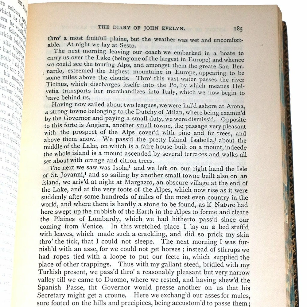 DETAILS Diary of John Evelyn (English, 1620-1706) PROVENANCE Note: English Prize (Division I) / Master: Mr. Brewerton / Class I. Speechday 1902. Gilt school seal (cover): Sigillvm Coe Libere Scole Edward VI in Brimicham. (Birmingham, England) TITLE Memoirs of John Evelyn, Esq., F.R.S. Comprising his Diary from 1641 to 1705-6 and A Selection of his Familiar Letters PUBLISHER Frederick Warne and Company (London/New York) BINDING Full green leather binding. Marbled endpapers and fore-edge. Gilt seal. LANGUAGE English SUBJECT(S) Diary AUTHOR(S) Editor: William Bray, Esq. (English, 1736–1832) PERIOD Queen Victoria (1837-1901) | Late 19th century DATE No copyright date DIMENSIONS Width 5.25 Depth 1.25 Height 7.5 inches