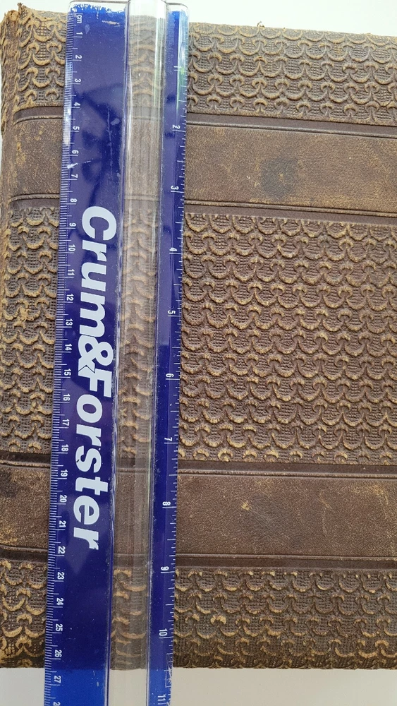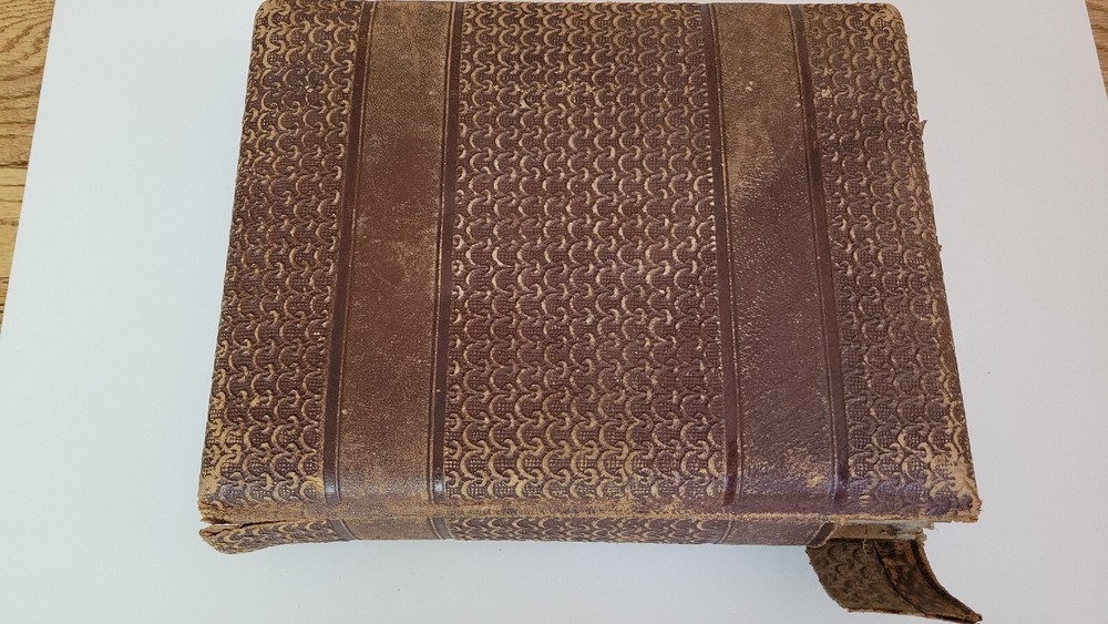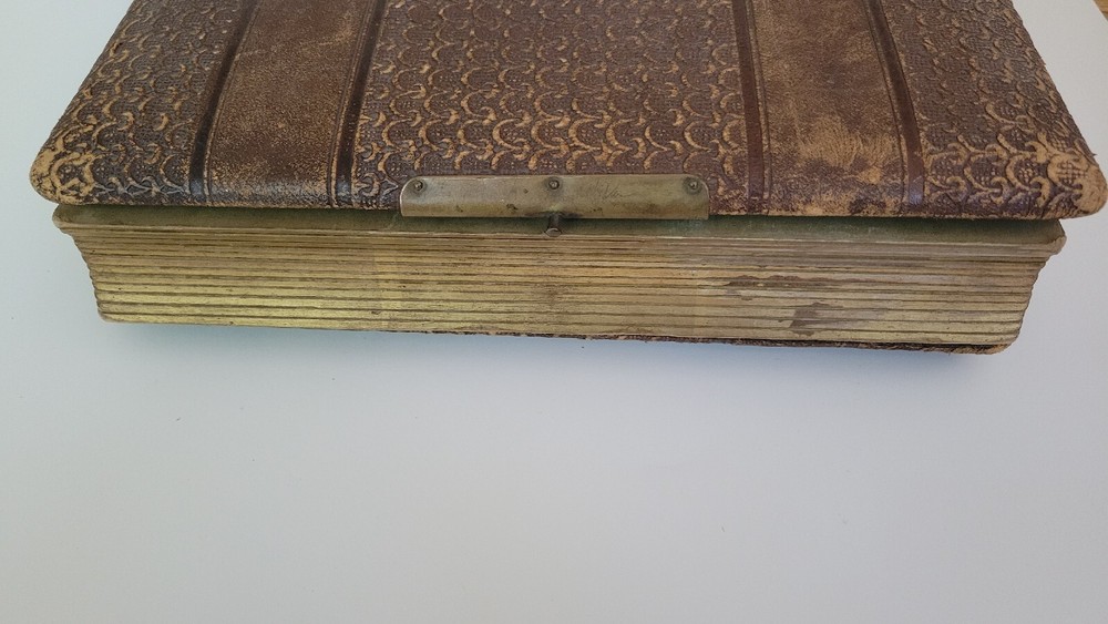 Antique Leather Bound Photo Album with 30 Photos with some age wear. The album is broken and missing some brass parts. The photos are good condition. The album size around 11" x 8 1/2" x 2 3/4". Thank...