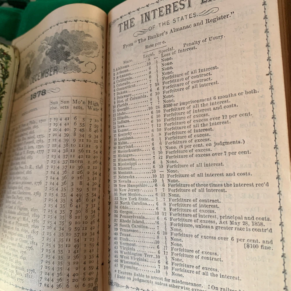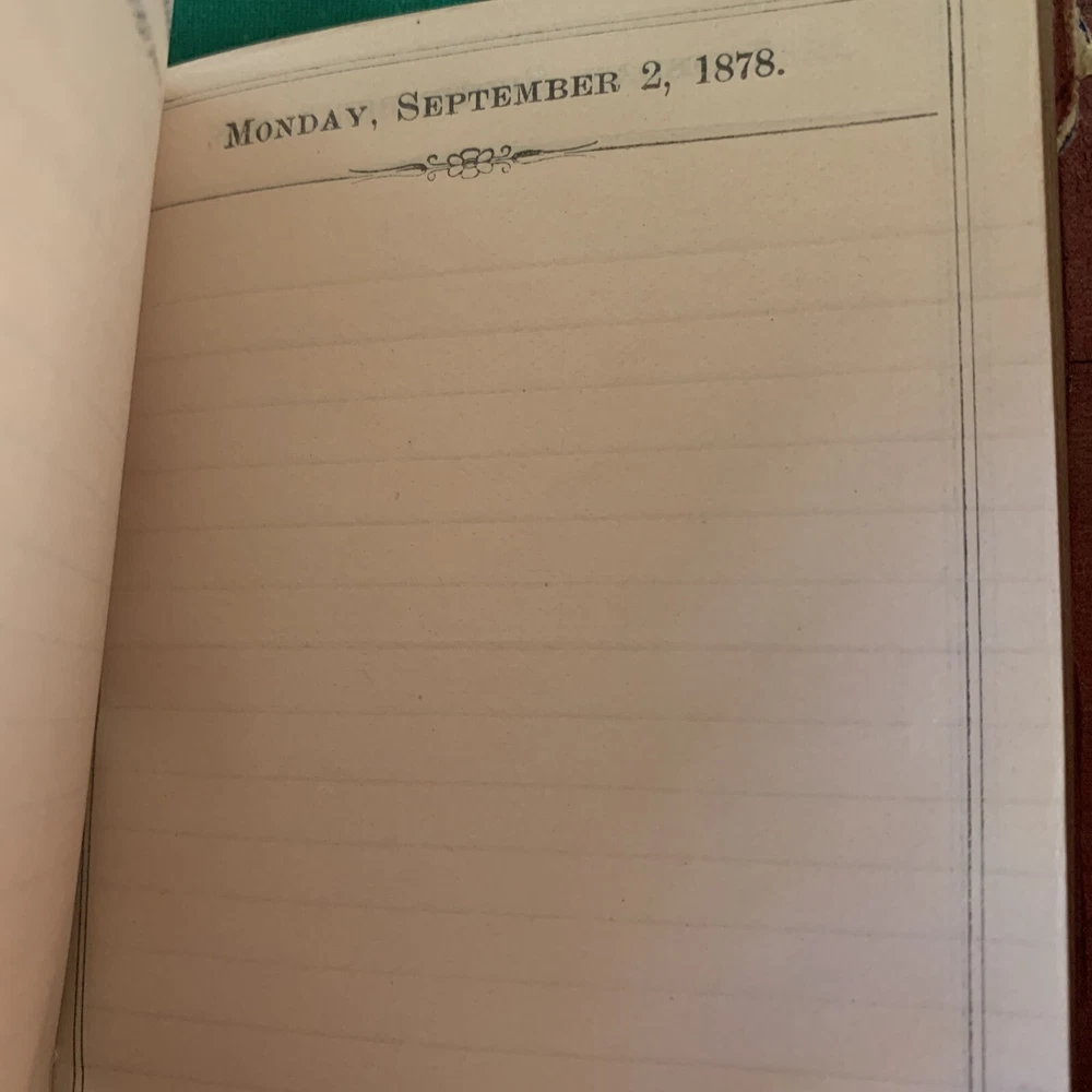 Antique Leather Centennial Diary 1878 George Becker. This is a wonderful, rare diary that does not have any entries. The owner of the diary is George Becker and his signature is in ink on the inside page and there is a stamp signature on the opposite of the centennial diary page. The diary does have different entries from the printer. It has eclipses for 1878, church days, a Calendar, and a month to month Page of what occurred on each day, for example the stamp act was passed in 1765 on March 8. This section is extremely interesting. There is also the interest laws of the United States, there is an interest table, there are pages with the population of states and territories in 1870. There are principal cities and their population. And then the diary begins with a gold edging. There are also included in the diary a coin flap and a Nother pocket with a blue lining. The diary is in fairly good condition considering it’s age. When closed it measures almost 5“ x 3 1/2“ and is 1 inch thick. I hate to part with this, but can’t keep everything exclamation
