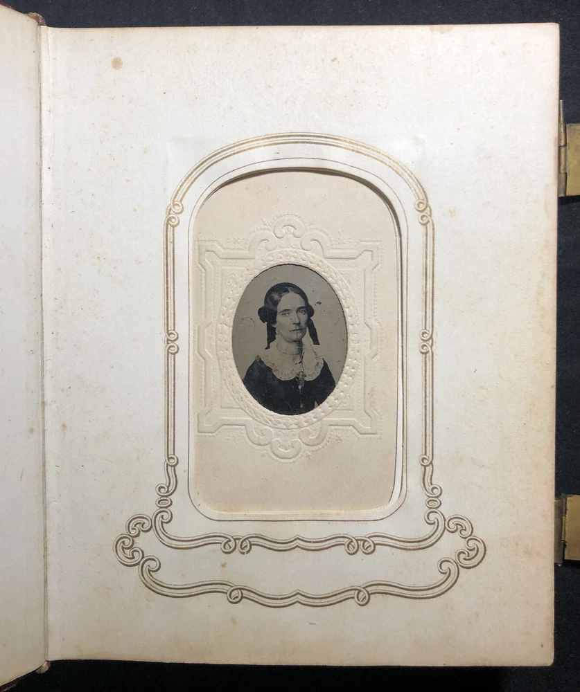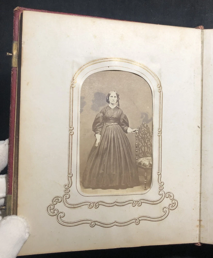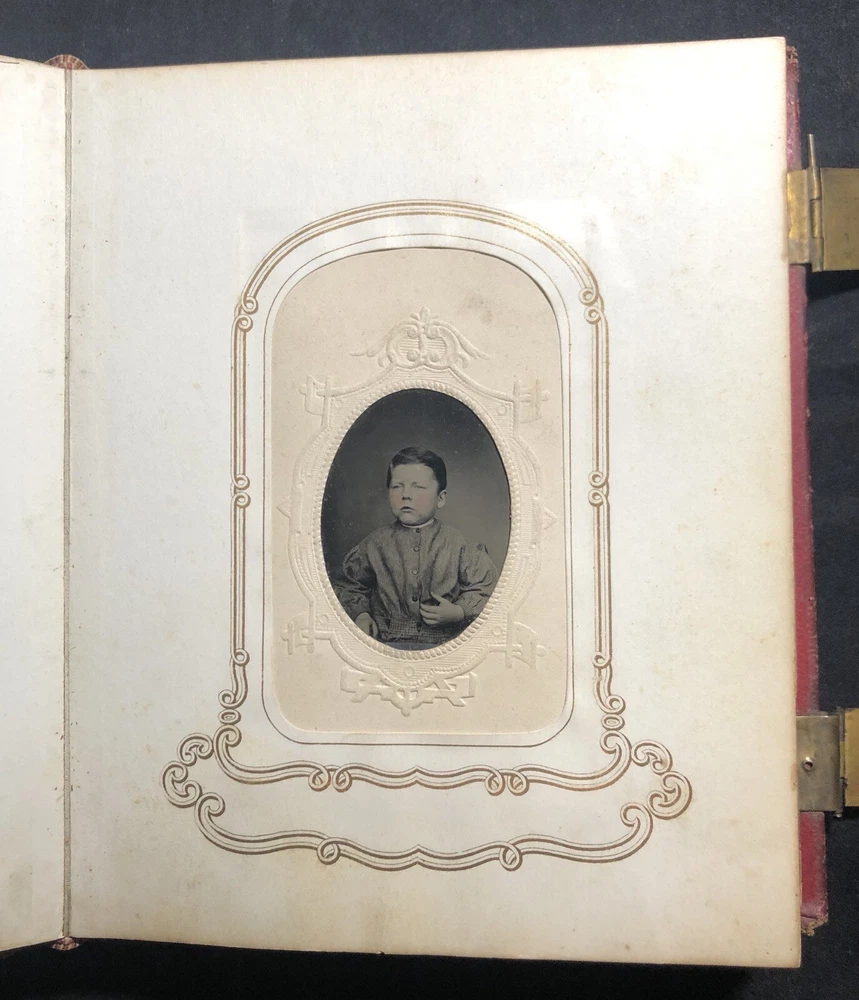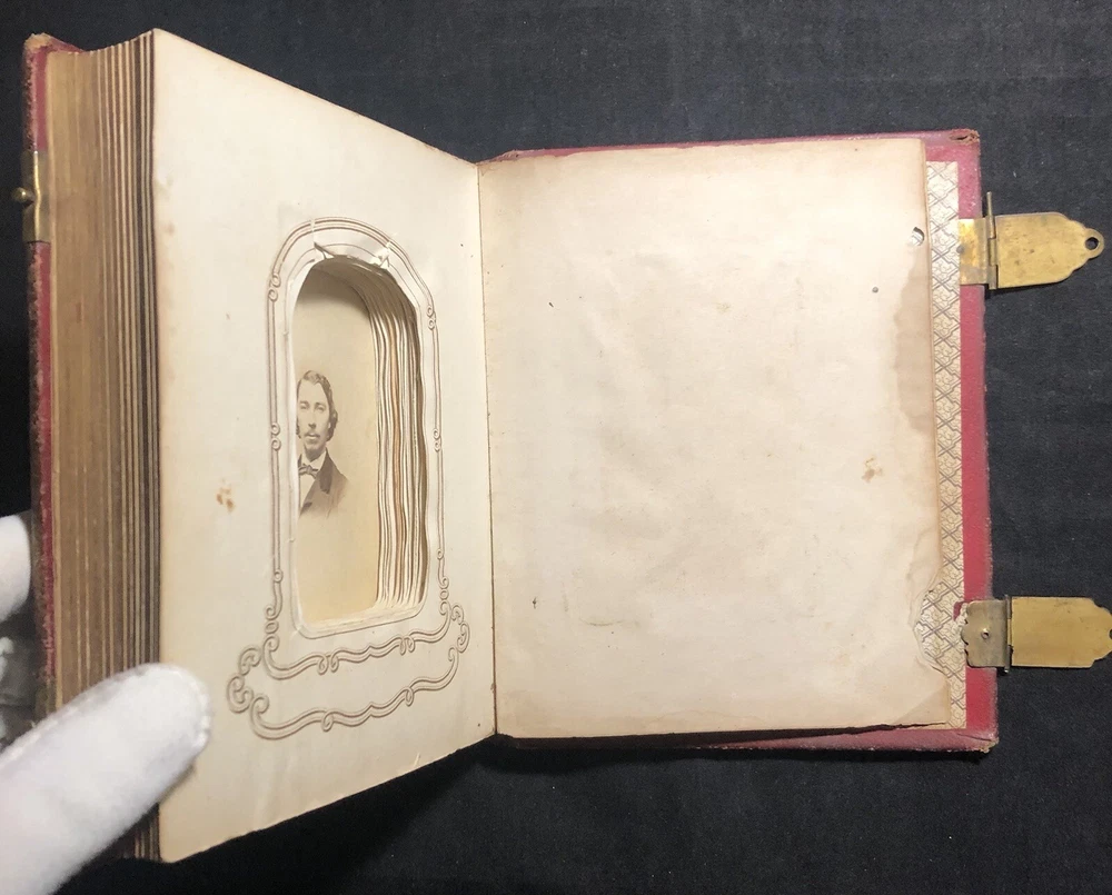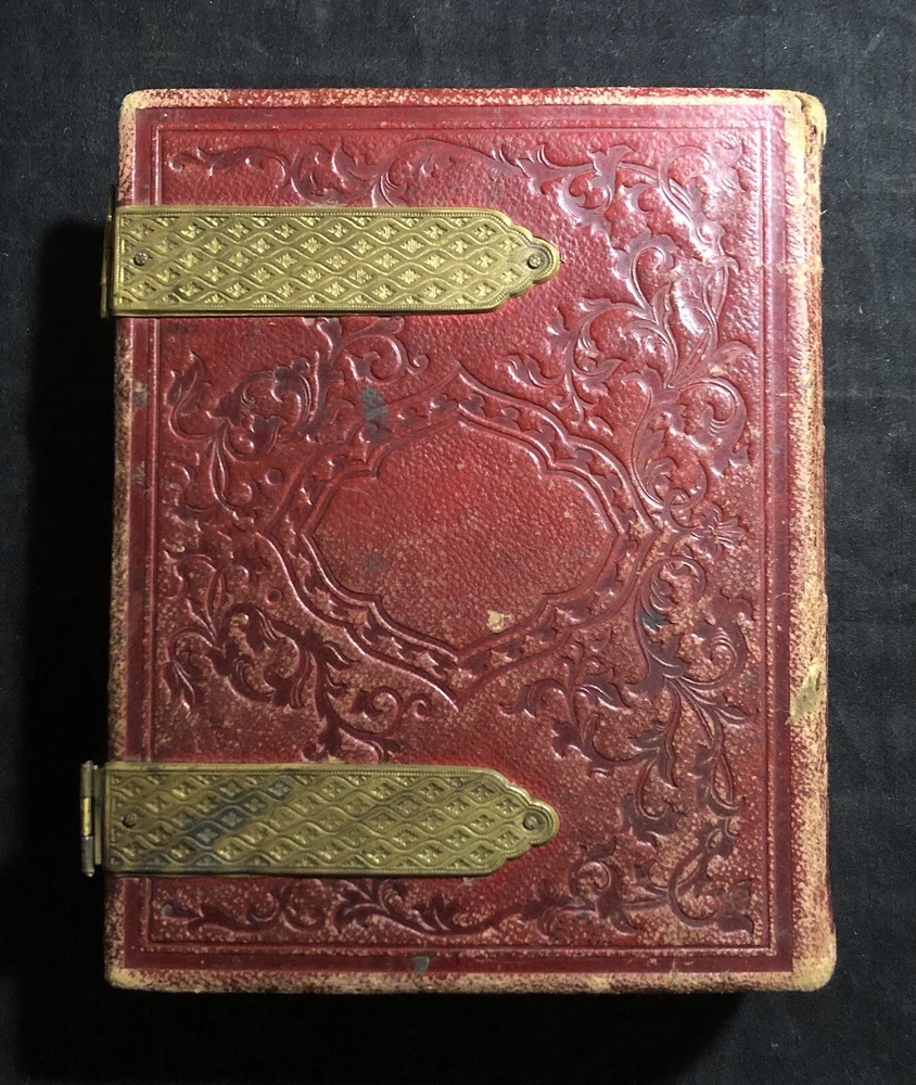 Beautiful small embossed red leather photo album with detailed brass straps and clasps. Includes 7 photographs from various eras, including 2 tintypes, 4 carte de visits, and 1 vintage photograph from around the 1920s or 1930s. Straps are on 2/3rds of both the back and the front and have an etched pattern. Brown and white lattice pattern endpapers. Title page says “Album of Photographs” in blue and gold. Index of Portraits list is blank, and no other information is written in the album itself. Gold painted ends to the text block. Fifteen cardboard pages with an open arched window in the middle with gold scrollwork around it. Holds 30 photographs, the opening measuring about 3-3/8” H x 2-1/4” W. Found in Virginia. Most likely American from the 1860s-1870s, 1880s-1890s, and 1920s. Photos include (in the order of this list): 1. A vintage group photograph of two women and a man: marked on the back “Maud, Ollie, Bea.” 2. A small oval tintype of a woman (NOT magnetic), set in an embossed card 3. A CDV of an older man with a beard, seated next to drapes 4. A small oval tintype of a boy (magnetic), set in an embossed card - cheeks are tinted pink 5. A CDV of a woman standing next to a chair 6. A CDV of a of a woman sitting with her arm on a table 7. A CDV of a man in a bow tie, bust length The photo album measures 6-5/8 x 5-1/2 x 1-3/8 inches. In good condition. Clasps open and lock shut smoothly. One clasp is a different design than the other (although it’s the right shape and color), and the pin on the matching clasp is sticking out a little. Some wear on the exterior around all edges. Covers and binding are intact. I have not removed the photos from their pages (pages 1, 4,5, and 6 out of 15) and am not sure if they are glued into place or loose. The slots to remove the photos are on the bottom of pages. Some wear and small stains on pages and endpapers, including two empty pages with splotches of residue in the gutters. Windows are intact with a couple 1/8” or less tears. The tintype of the woman has a light vertical scratch down her face. See images for details. Please let me know of you would like to see more images of this album or have any questions before purchase. Thank you for your interest! N-B11