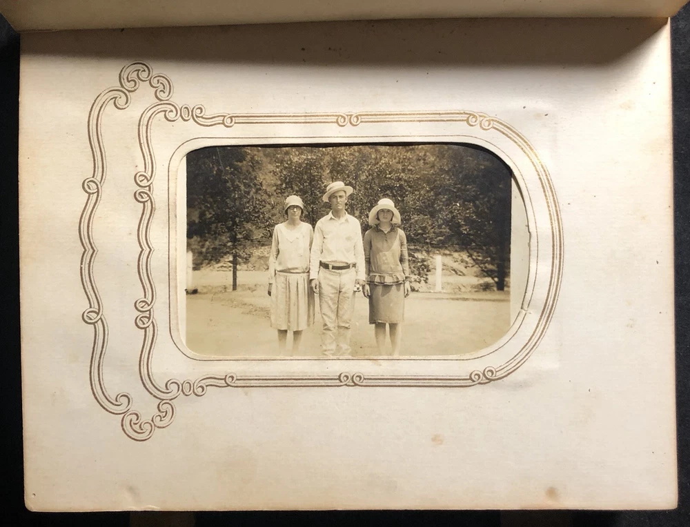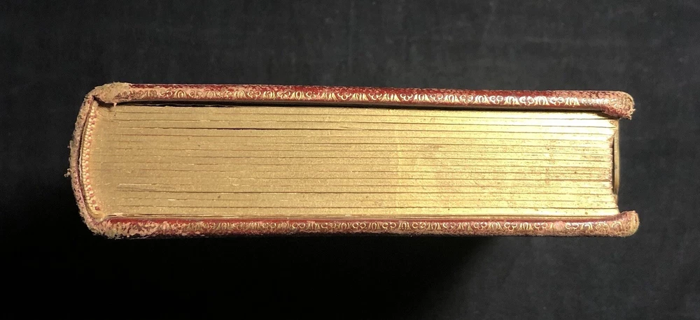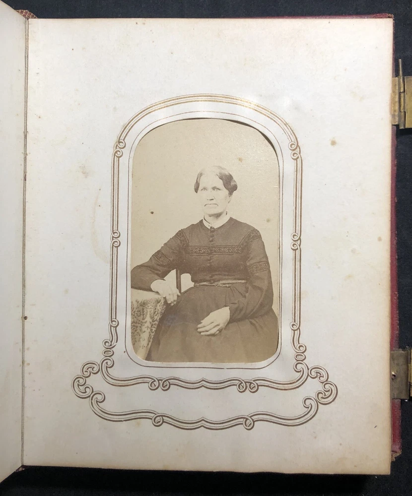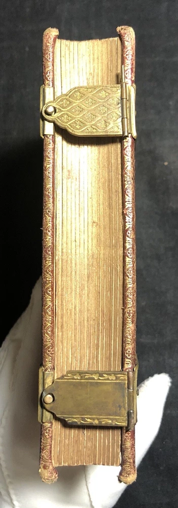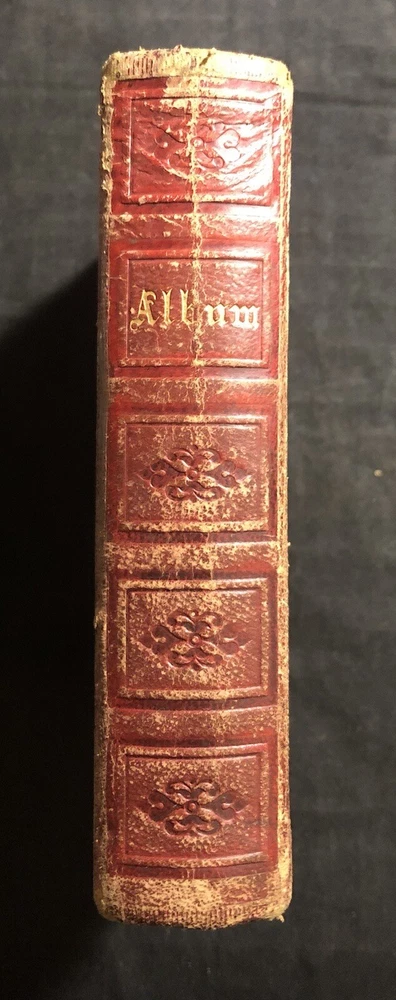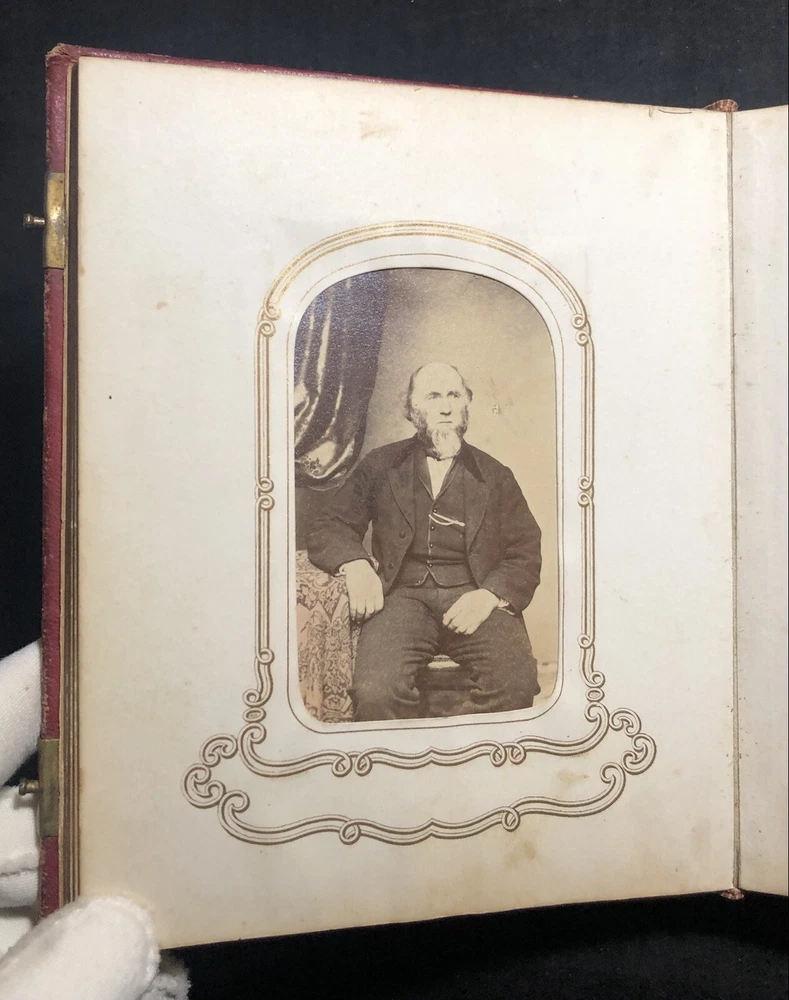 Beautiful small embossed red leather photo album with detailed brass straps and clasps. Includes 7 photographs from various eras, including 2 tintypes, 4 carte de visits, and 1 vintage photograph from around the 1920s or 1930s. Straps are on 2/3rds of both the back and the front and have an etched pattern. Brown and white lattice pattern endpapers. Title page says “Album of Photographs” in blue and gold. Index of Portraits list is blank, and no other information is written in the album itself. Gold painted ends to the text block. Fifteen cardboard pages with an open arched window in the middle with gold scrollwork around it. Holds 30 photographs, the opening measuring about 3-3/8” H x 2-1/4” W. Found in Virginia. Most likely American from the 1860s-1870s, 1880s-1890s, and 1920s. Photos include (in the order of this list): 1. A vintage group photograph of two women and a man: marked on the back “Maud, Ollie, Bea.” 2. A small oval tintype of a woman (NOT magnetic), set in an embossed card 3. A CDV of an older man with a beard, seated next to drapes 4. A small oval tintype of a boy (magnetic), set in an embossed card - cheeks are tinted pink 5. A CDV of a woman standing next to a chair 6. A CDV of a of a woman sitting with her arm on a table 7. A CDV of a man in a bow tie, bust length The photo album measures 6-5/8 x 5-1/2 x 1-3/8 inches. In good condition. Clasps open and lock shut smoothly. One clasp is a different design than the other (although it’s the right shape and color), and the pin on the matching clasp is sticking out a little. Some wear on the exterior around all edges. Covers and binding are intact. I have not removed the photos from their pages (pages 1, 4,5, and 6 out of 15) and am not sure if they are glued into place or loose. The slots to remove the photos are on the bottom of pages. Some wear and small stains on pages and endpapers, including two empty pages with splotches of residue in the gutters. Windows are intact with a couple 1/8” or less tears. The tintype of the woman has a light vertical scratch down her face. See images for details. Please let me know of you would like to see more images of this album or have any questions before purchase. Thank you for your interest! N-B11