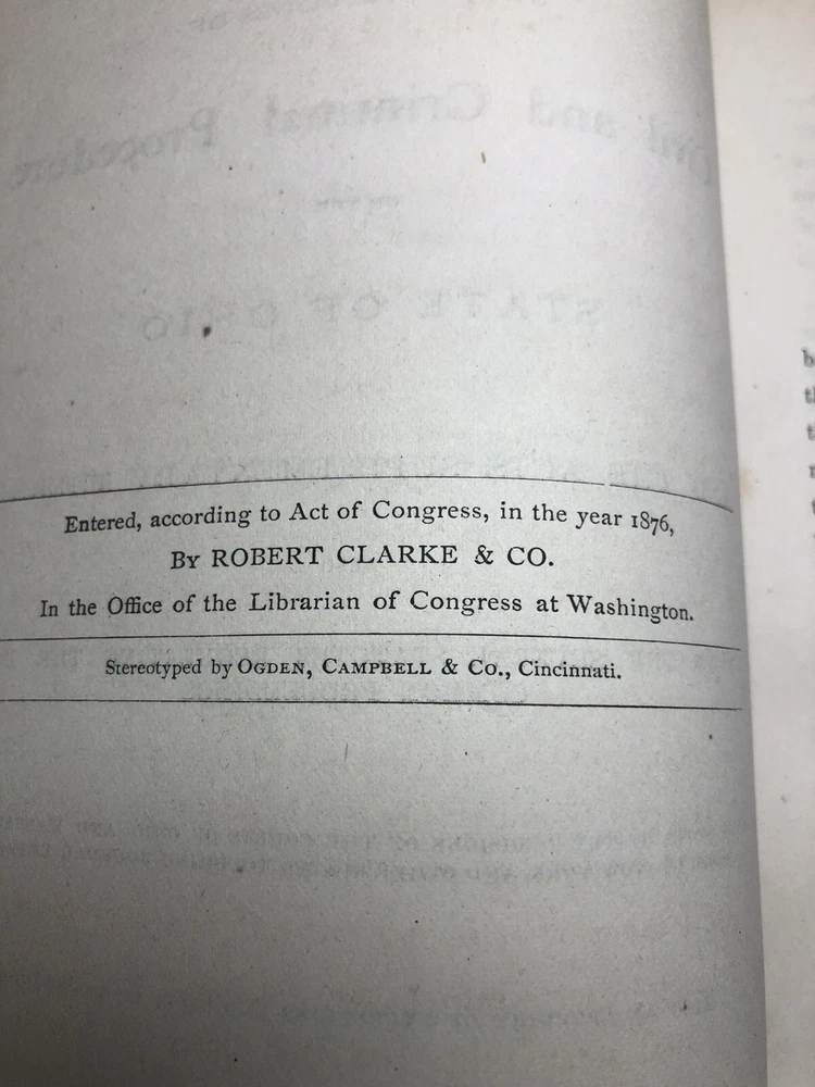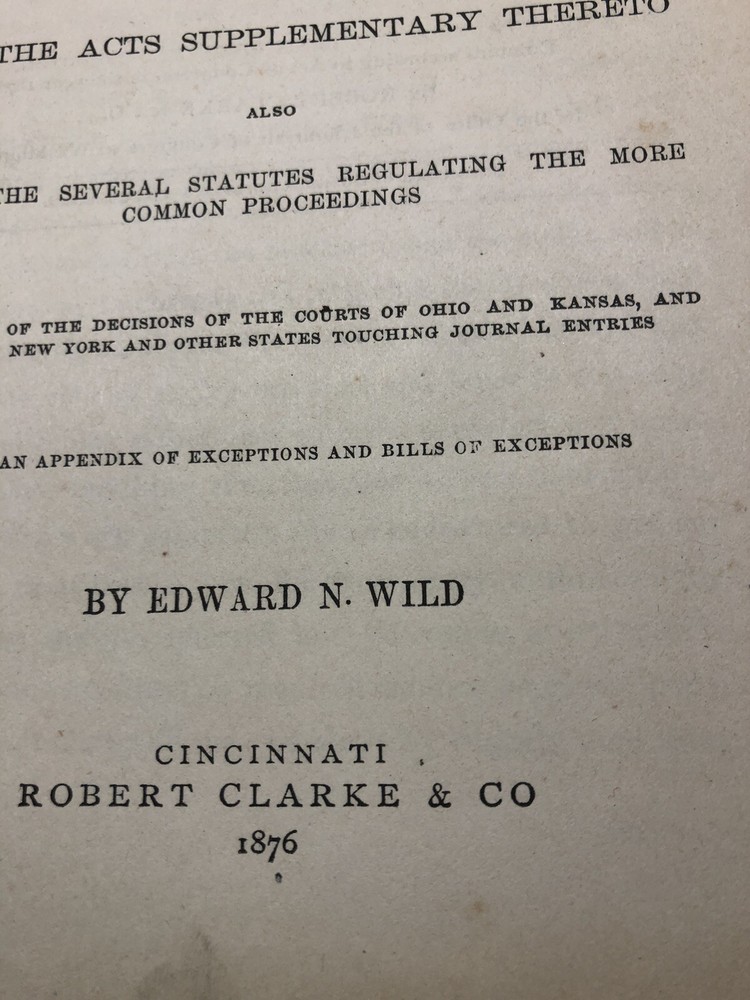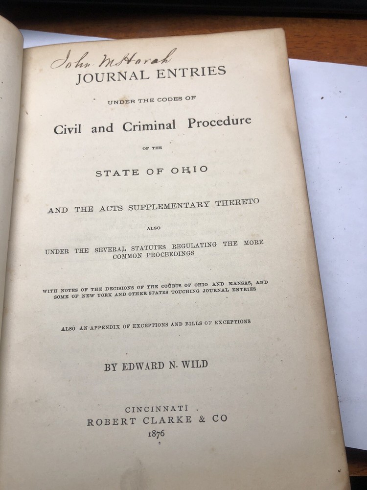 This product is an antique leather-bound journal containing Edward Wild's entries on civil and criminal procedures in the State of Ohio from 1876. Published by Robert Clarke & Co. in Cincinnati, this personalized journal is a valuable collectible for those interested in journalism and law & government topics. With its original English language entries and United States manufacture, this piece of North American history offers a unique glimpse into the legal practices of the late 19th century.